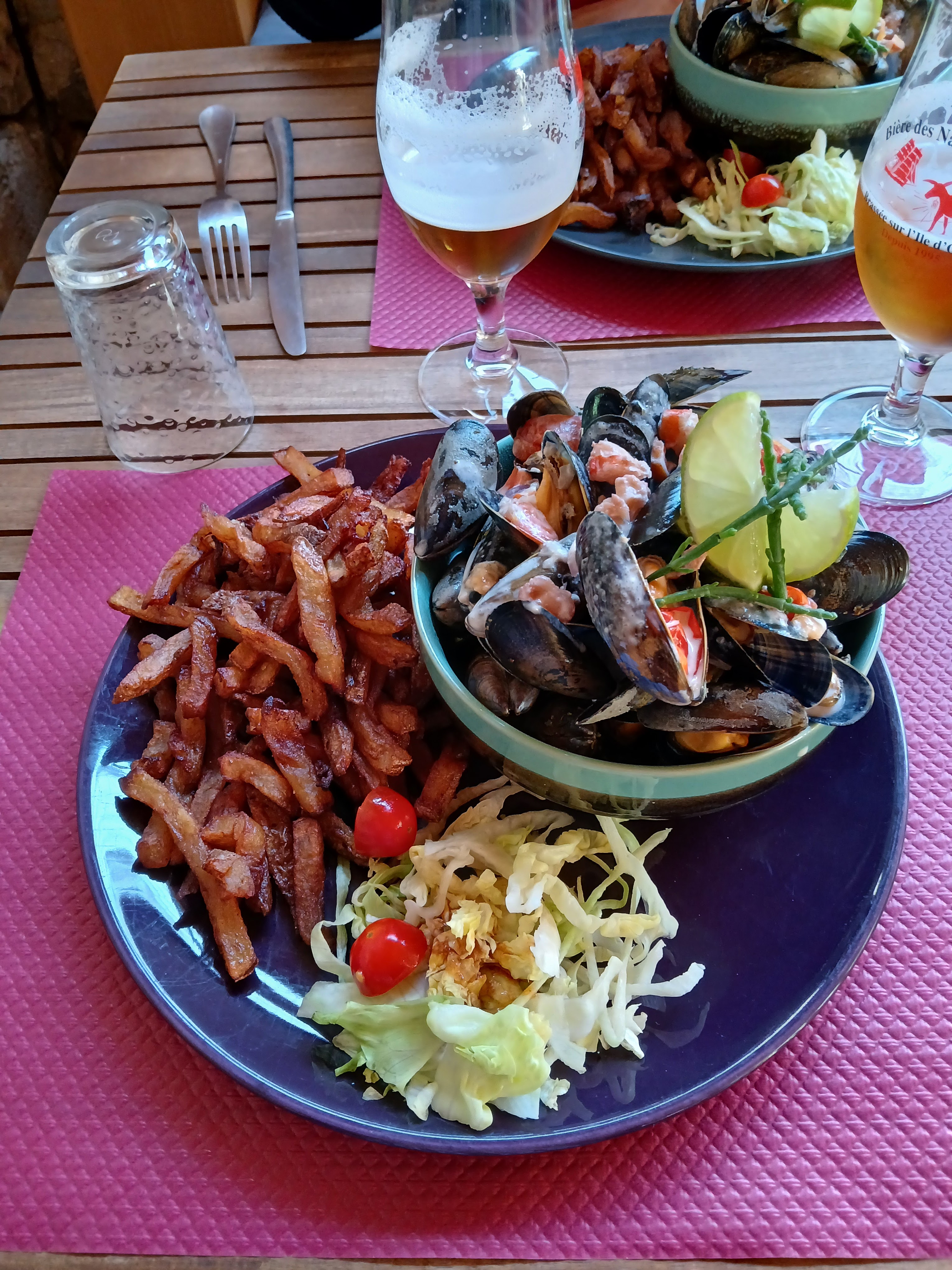 S’étant fait refouler de 5 ou 6 endroits à 13h15 car n’ayant pas réservé nous arrivons au bistrot du corsaire dans le centre. Cuisine encore ouverte à 14h. Quel excellent accueil avec le sourire! frites maison, moules impec. Le tout est tenue par la maman et ses 3 filles dont l’une cheffe en cuisine. On déjeune sous la tonnelle. Un peu long dû à notre arrivée tardive mais nous avons été prévenus dès la commande. On a été contents d’avoir galéré pour atterrir là. Dommage que les 6 étoiles n’existent pas!