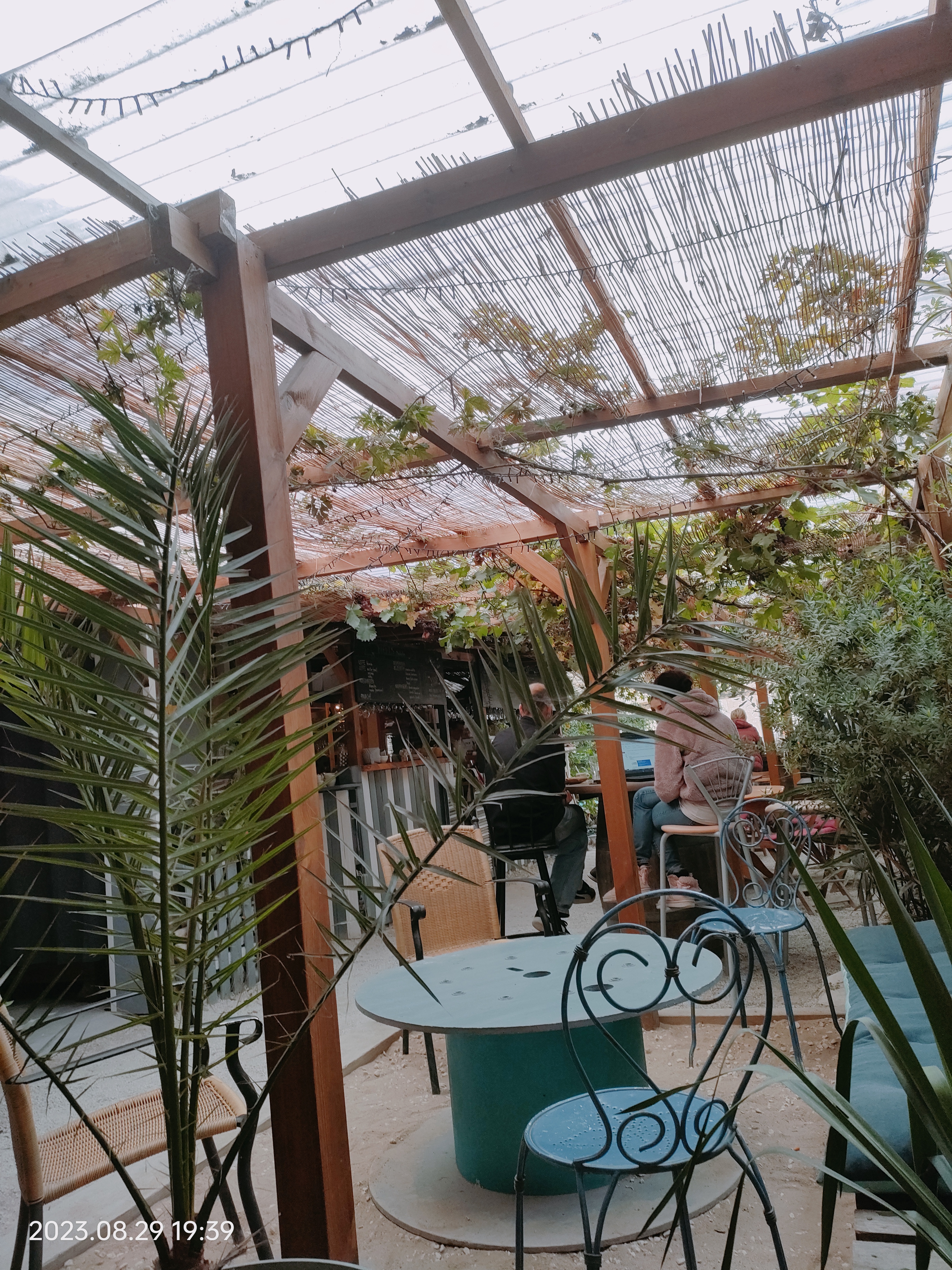 Une équipe sympa et accueillante, de bons produits frais, délicieusement cuisinés et joliment présentés, un petit patio avec bancs et coussins, une tonnelle recouverte de raisin qui tombe en grappes, joli bar en bois gris et bleu, bref je recommande !