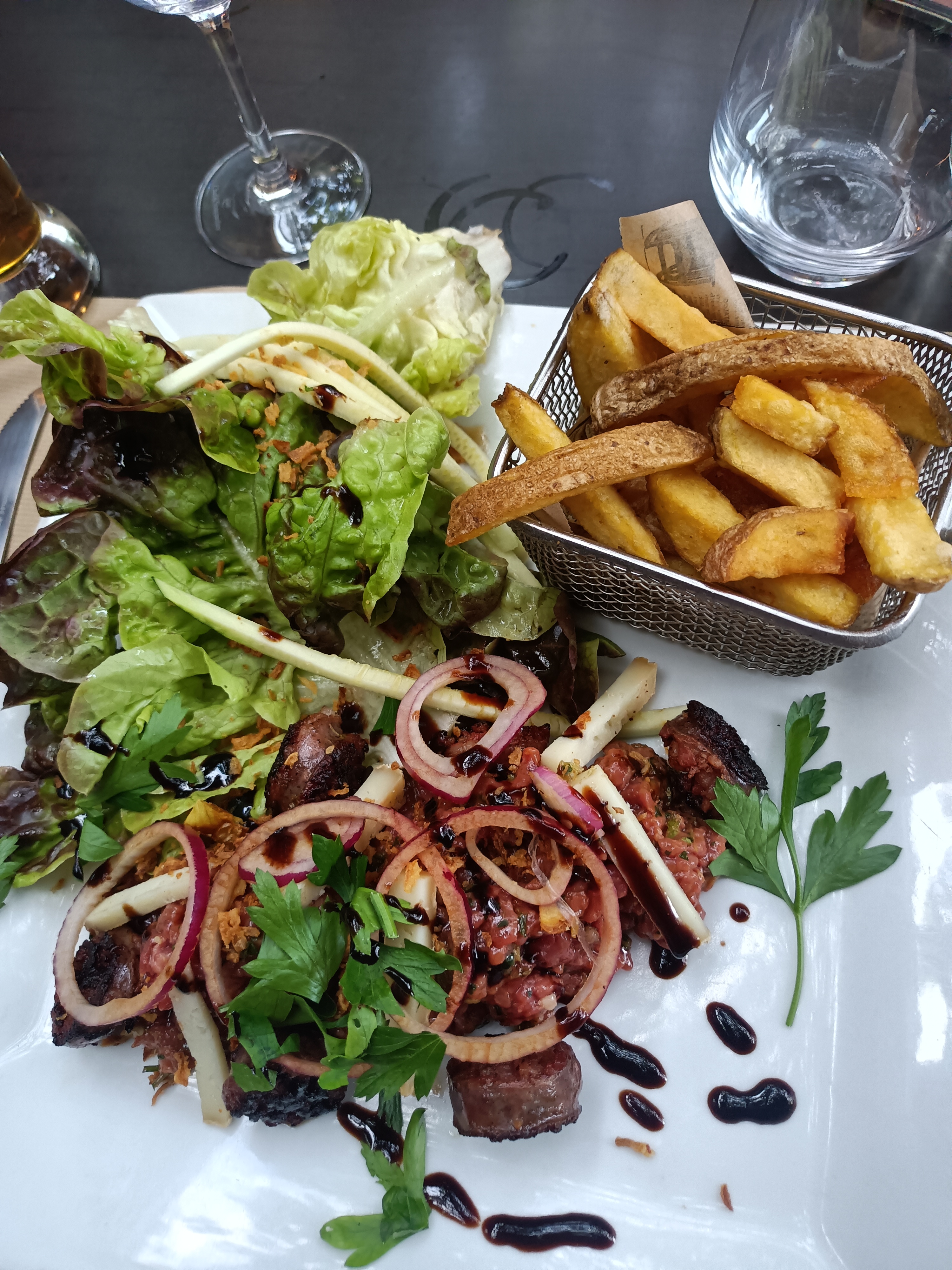 Côté repas, un régal ! Le prix est un peu élevé mais l'assiette est bien fournie ! Les salades sont copieuses! Les tartares ont du goût! C'est dommage que le restaurant ne contrôle pas le pass sanitaire ! Du coup pas très safe...la serveuse assume ouvertement le fait de ne pas respecter les règles... Espérant que les règles d'hygiène sont respecté dans la cuisine! Pas de se QR code qui enregistre mon passage dans ce restaurant....! Une des serveuses n'avait pas le masque! Les animaux sont acceptés dans la cour arrière, bref un peu déçue!