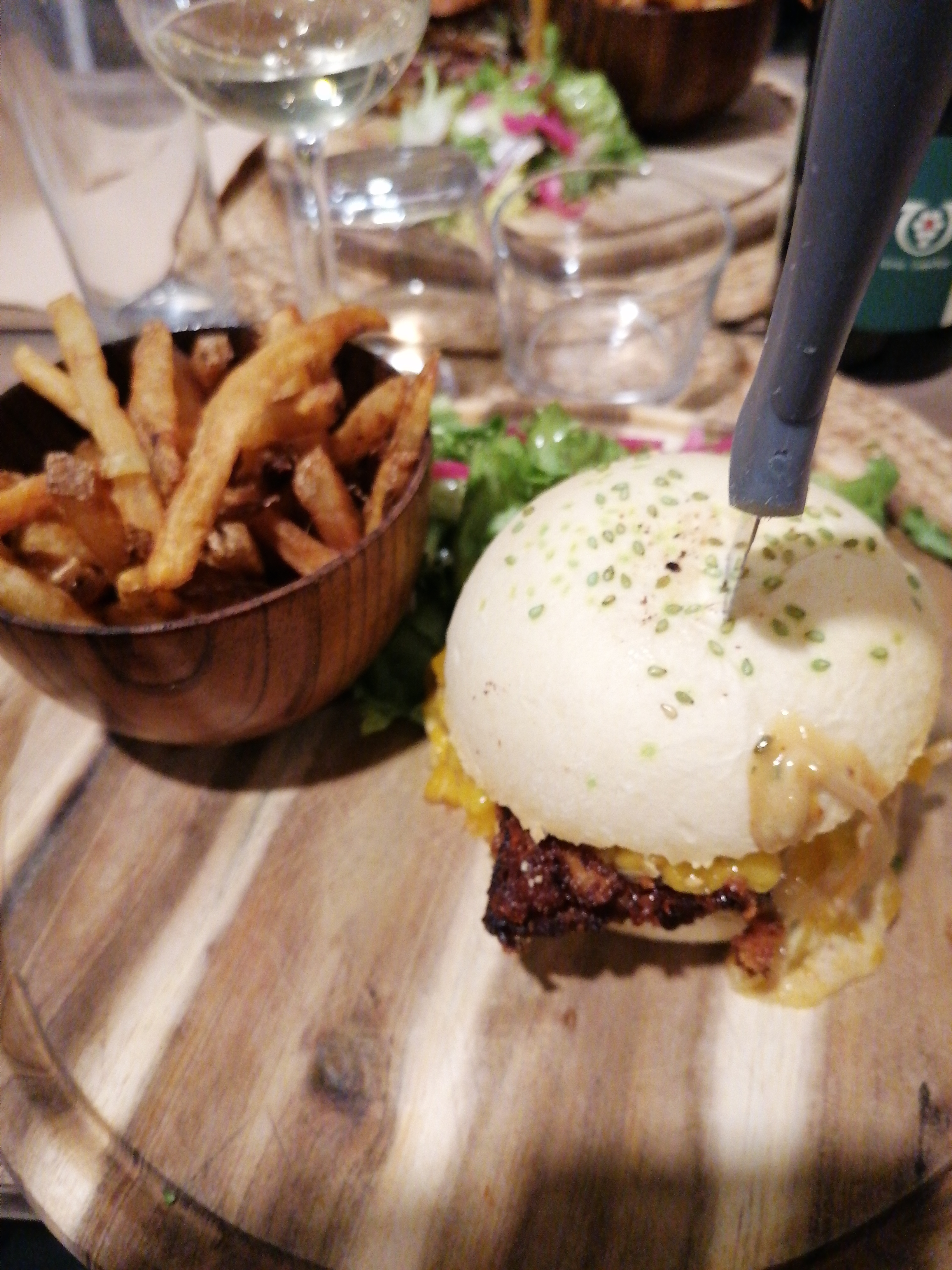 Points positifs : cuisine au top, le chef maîtrise bien son sujet. Plats savoureux, produits de qualité...un sans faute. Points négatifs : Tarifs adaptés pour les plats mais excessifs pour les burger. Cadre à l'ambiance peu chaleureuse, il faisait d'ailleurs limite froid dans la salle. Accueil et service à revoir. (attente, oublis, manque d'expérience ???....) Nous sommes je pense venus le mauvais jour. Il y avait une grande soirée entreprise à gérer en même temps, ils ont je pense été dépassés par l'événement. Au risque de proposer un service moyen (certainement du au manque de personnel) j'aurai fermé le restaurant pour me concentrer sur la réception. Grosse déception, nous ne renouvellerons pas l'expérience