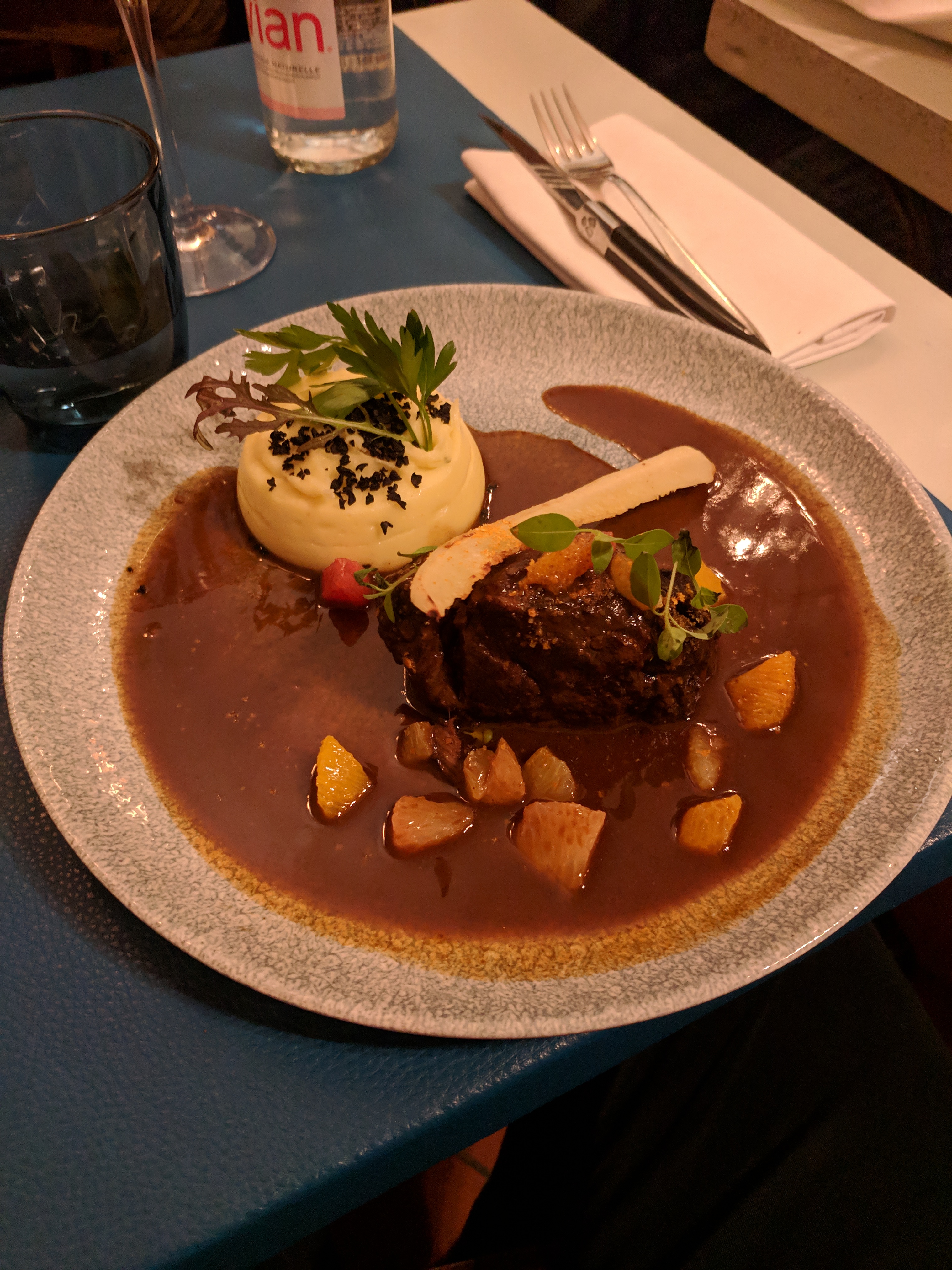 Je suis arrivé avec une heure de retard pour ma réservation et le chef a quand même réussi à faire de la place. Je commande une soupe de lentilles aux calamars. J'ai été choqué de voir à quel point ces deux-là étaient bien combinés. J'ai eu des joues de bœuf et le vin le moins cher de la liste (la liste n'était pas chère). L'association était excellente et le vin était l'un des plus savoureux que j'ai bu depuis des mois. Les joues de bœuf étaient chaudes et très satisfaisantes. J'ai eu une soupe au chocolat à la fin, ce qui était une belle fin à tout cela. Le chef m'a accueilli à la sortie et nous avons eu une courte conversation. J'ai le sentiment d'être au sommet du monde. Je le recommanderais.