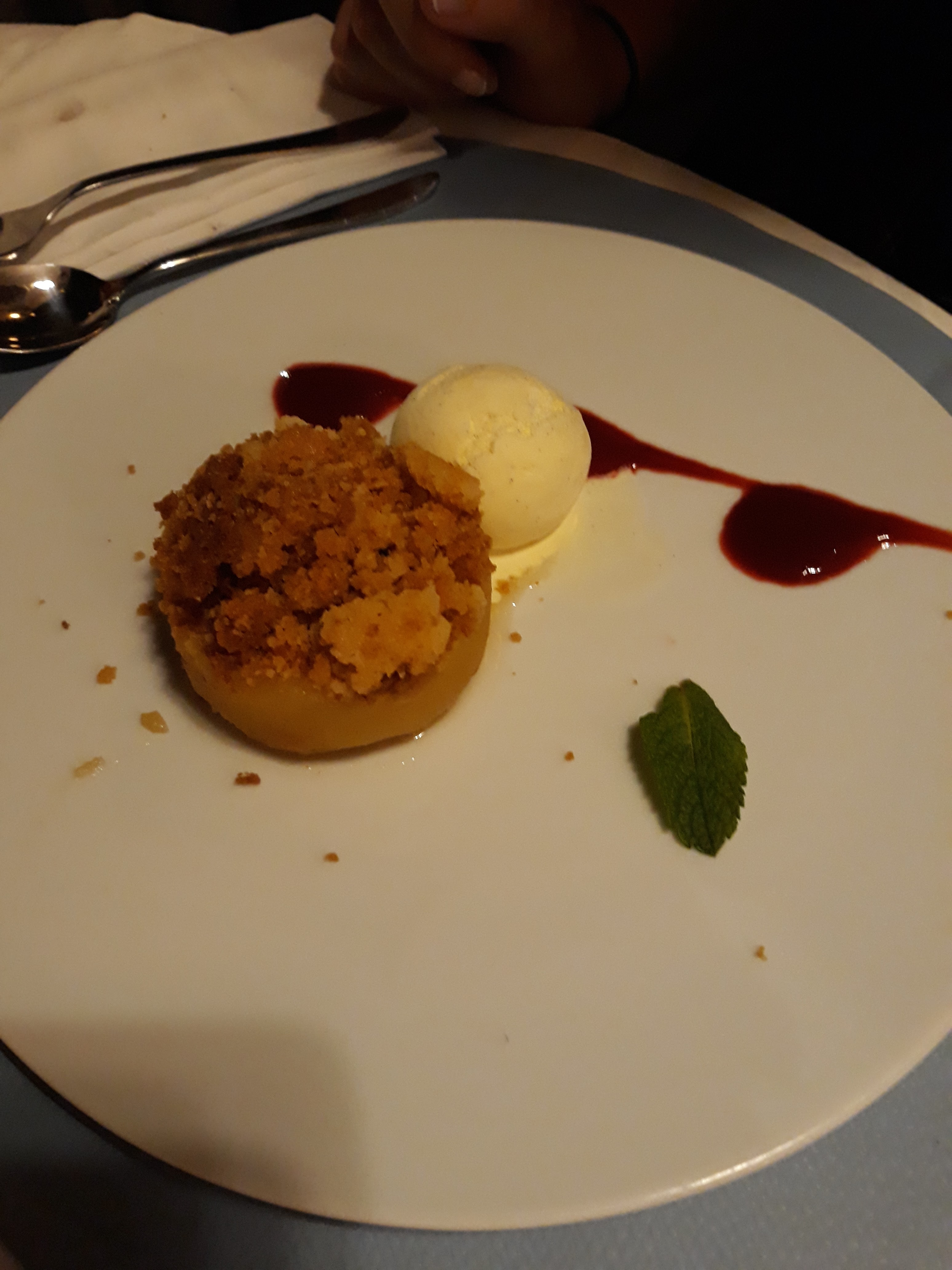 Entrées: fondue de poireaux et oeuf mollet ; velouté de panais et haddock fumé. Plats: côté de porc sauce sauge; st jacques au risotto et champignons; filet de merlu sauce au beurre et saté; rognon de veau sauce moutarde. Desserts : crème brûlée, feuilleté a la pomme et crème pâtissière. On a senti la passion du chef. Cuisine généreuse, explosion de saveurs en bouche. J'ai rarement mangé un plat aussi bluffant merci 🙏🙏🙏