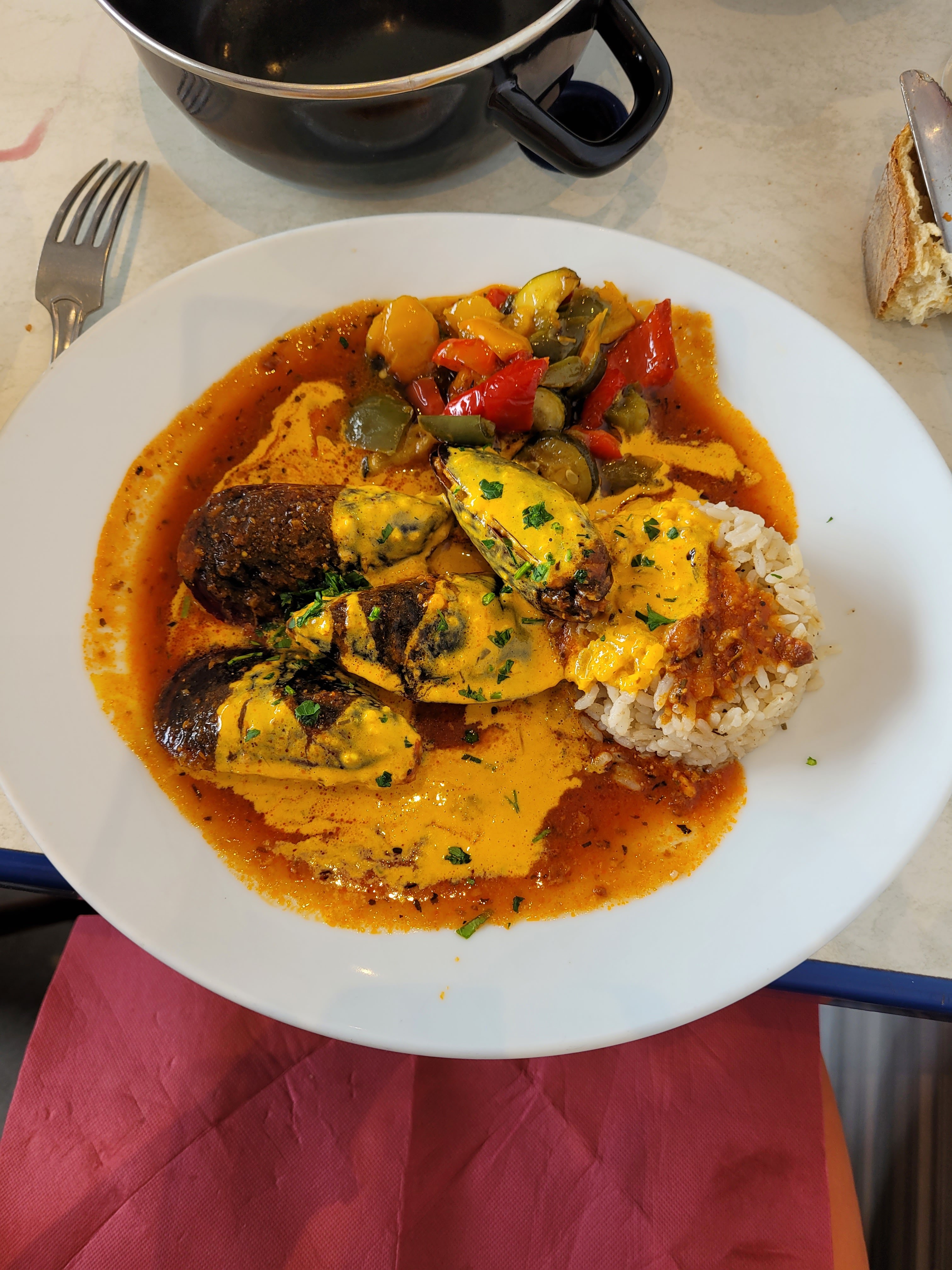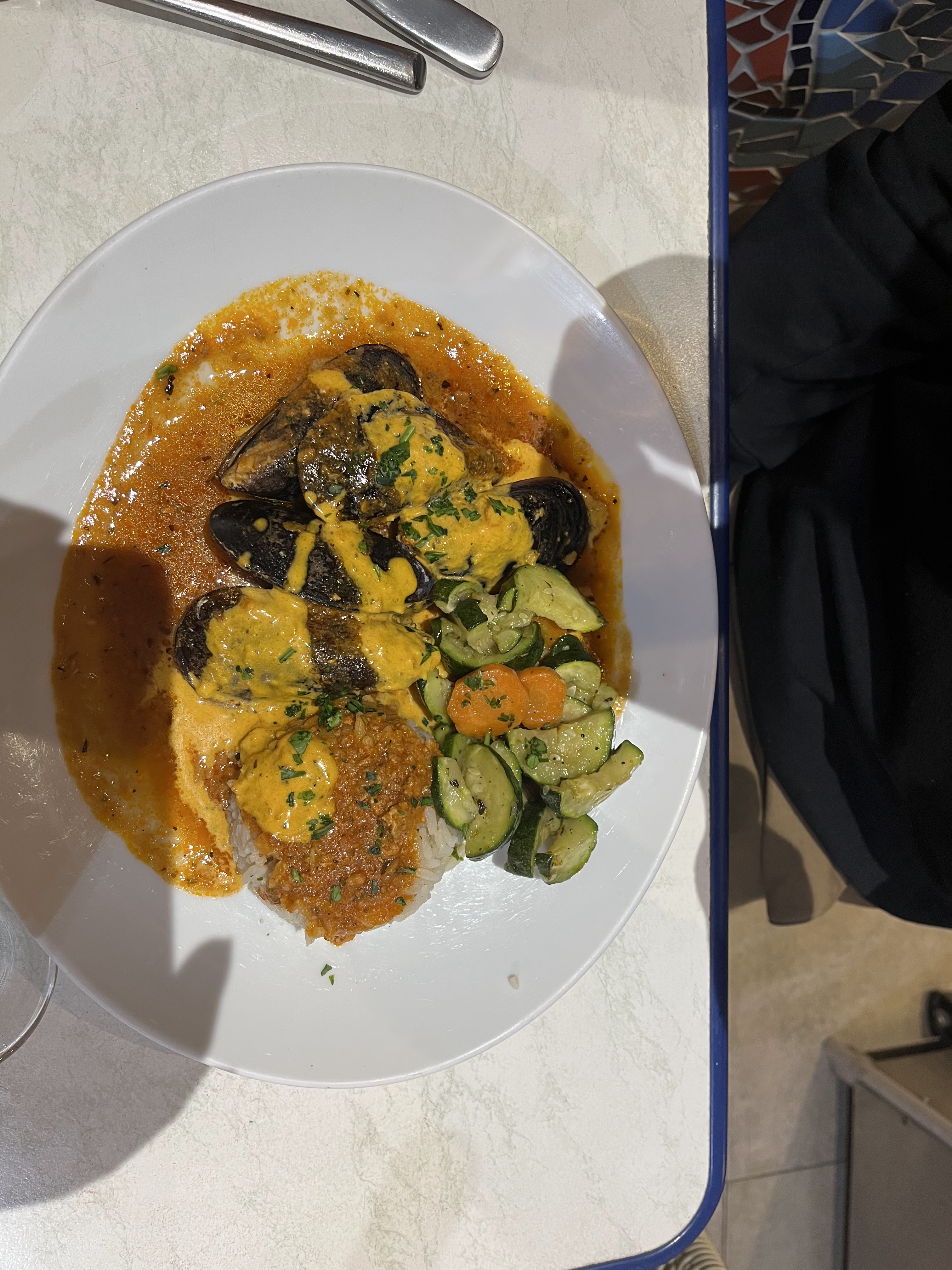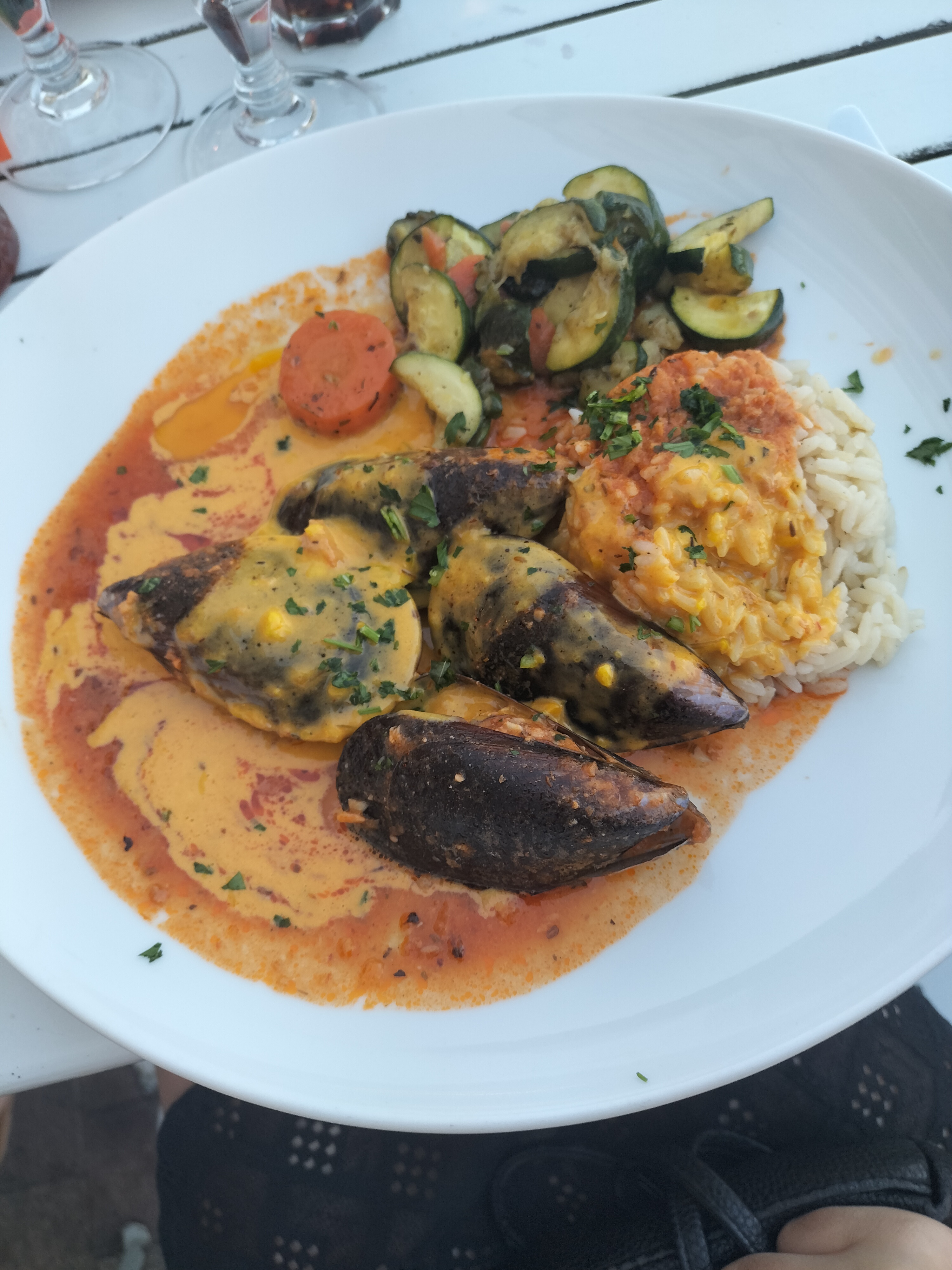 C'était très bon. Moules sauce roquefort et sèche en sauce de rouille avec courgettes et riz. Un régal.