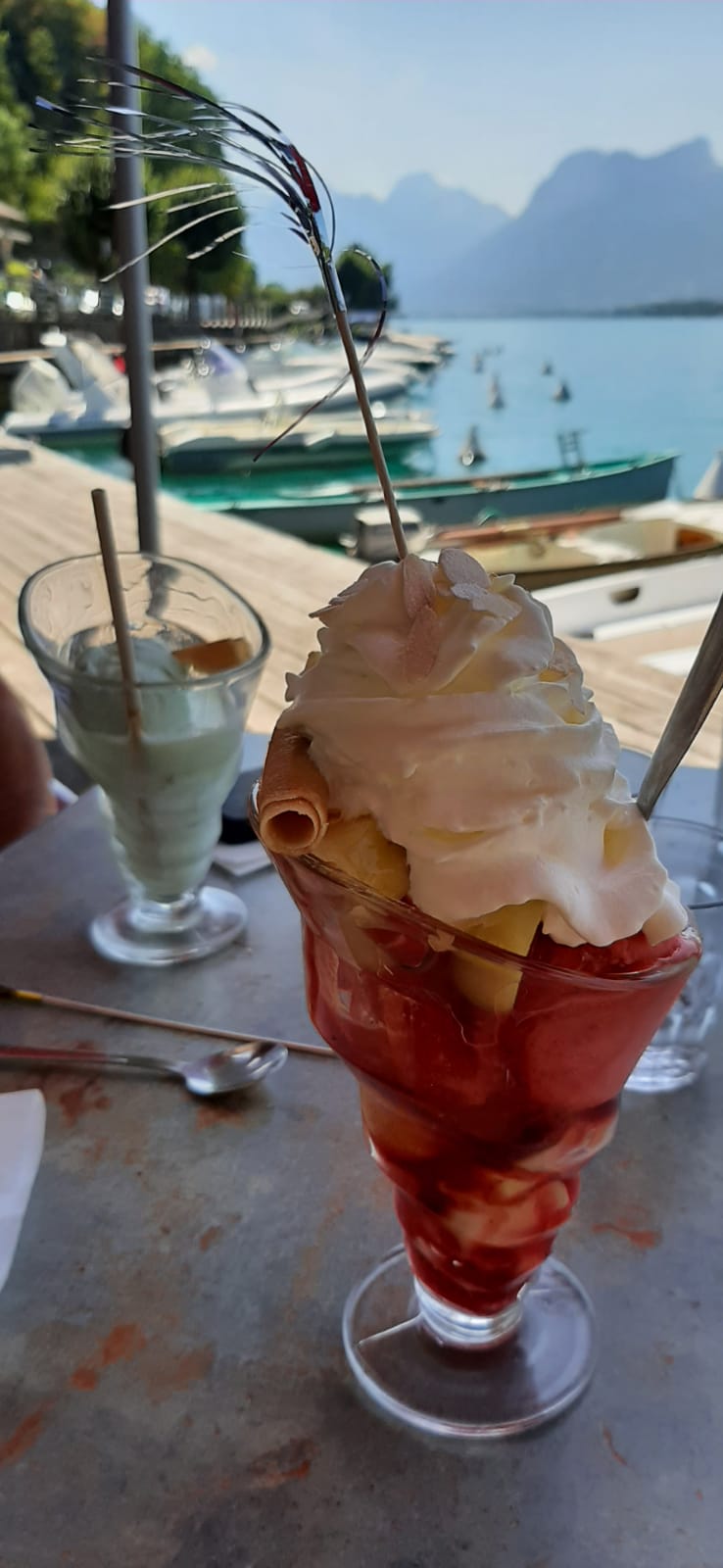 Bien , très belle vue sur le lac d'Annecy, dommage trop prêt de la route et pas facile pour les serveuses qui risquent leur vie à chaque traversées.... un bon ralentisseur devrait être mis en avant du passage piéton. Sinon serveuse sympa , bonne glace , mérite l'arrêt, facile en moto pour se garer , en voiture moins ...