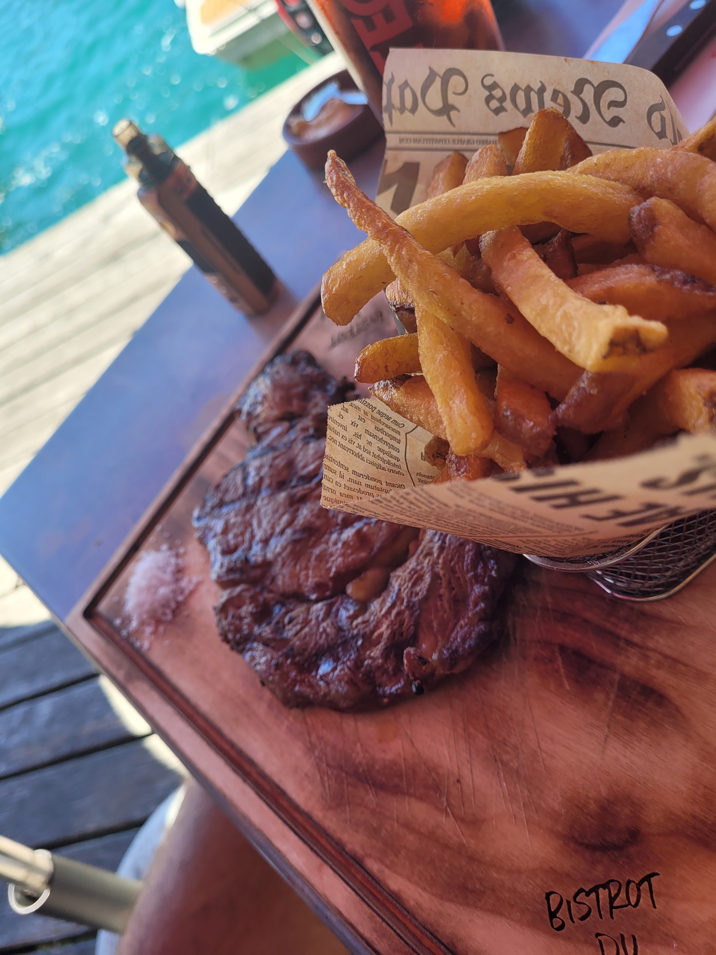 Génialement génial ! Un petit verre sur le ponton en guise d’apéritif puis une viande succulente cuite dans le four aux braises assortie à des délicieuses frites maison. Le service est chaleureux, nous reviendrons