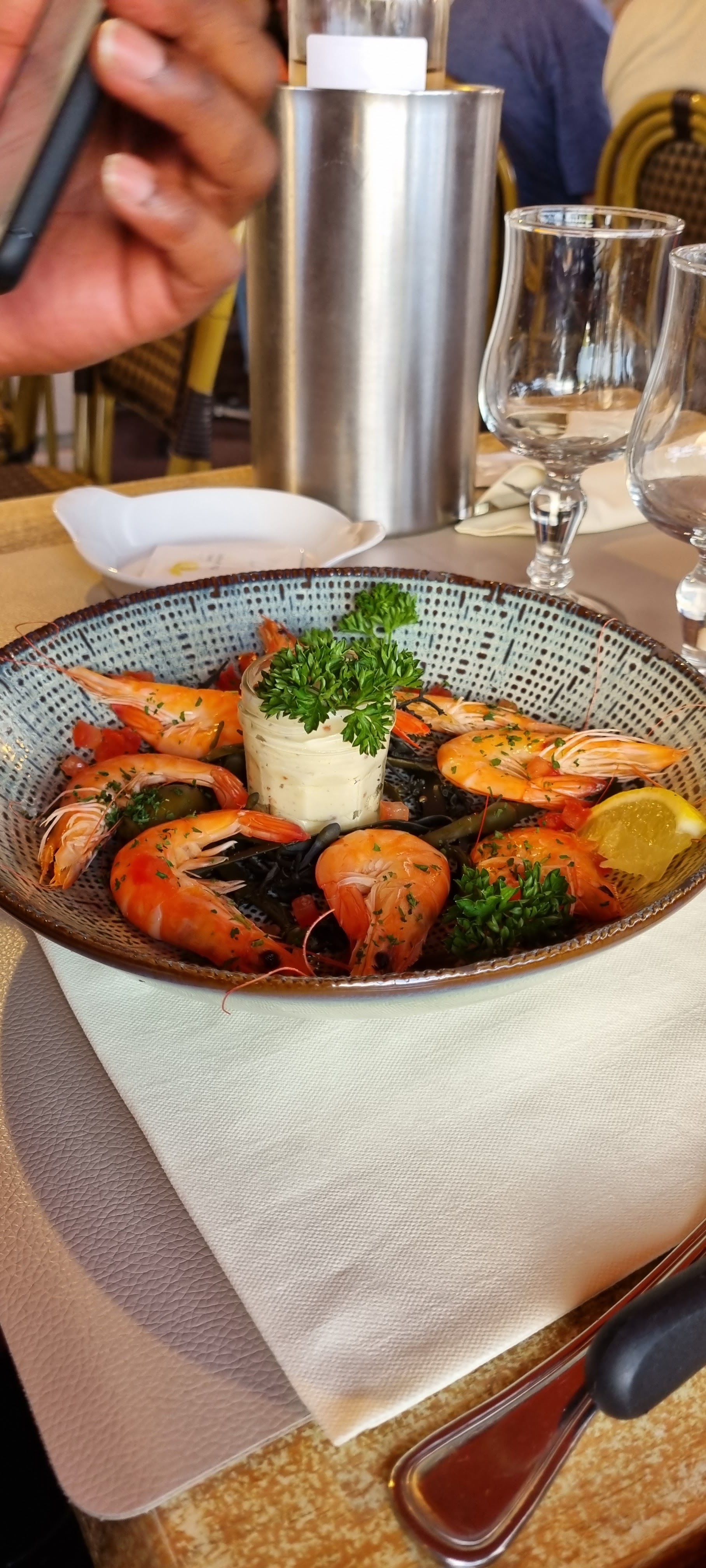 Table réservée pour 6 personnes en terrasse, la vue sur le port est très appréciable. Les plats étaient bons et les serveurs, serviables. J'ai vu des avis négatifs sur les moules soient disant sans goût ou caoutchouteuses mais pourtant elles étaient excellentes. Nous reviendrons !