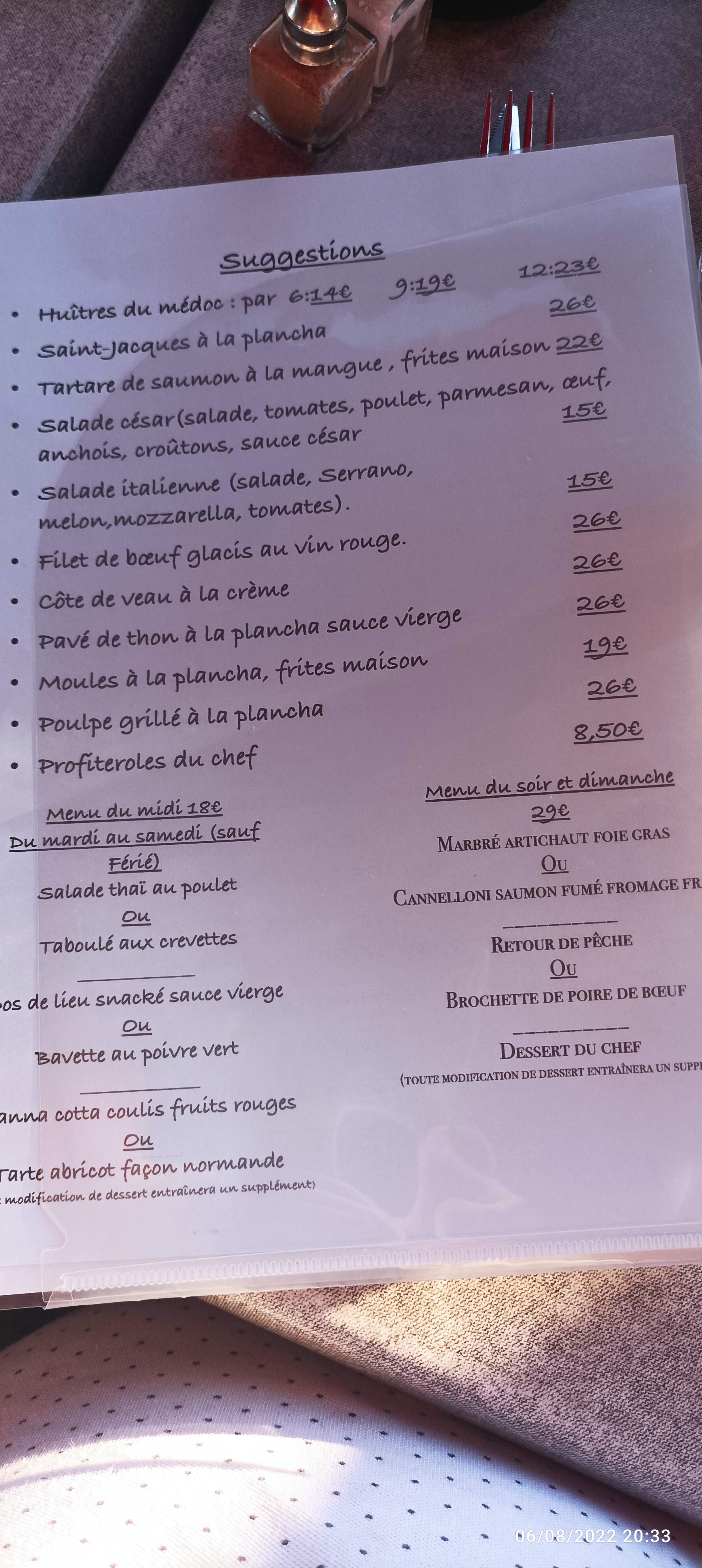 Bel endroit à Port Médoc, grande terrasse et véranda pour soirées plus fraîches. Accueil au top avec sourire à volonté Quant aux plats proposés à la carte , un vrai régal . Une bonne carte des vins. Bref une adresse à retenir et à conseiller vivement.