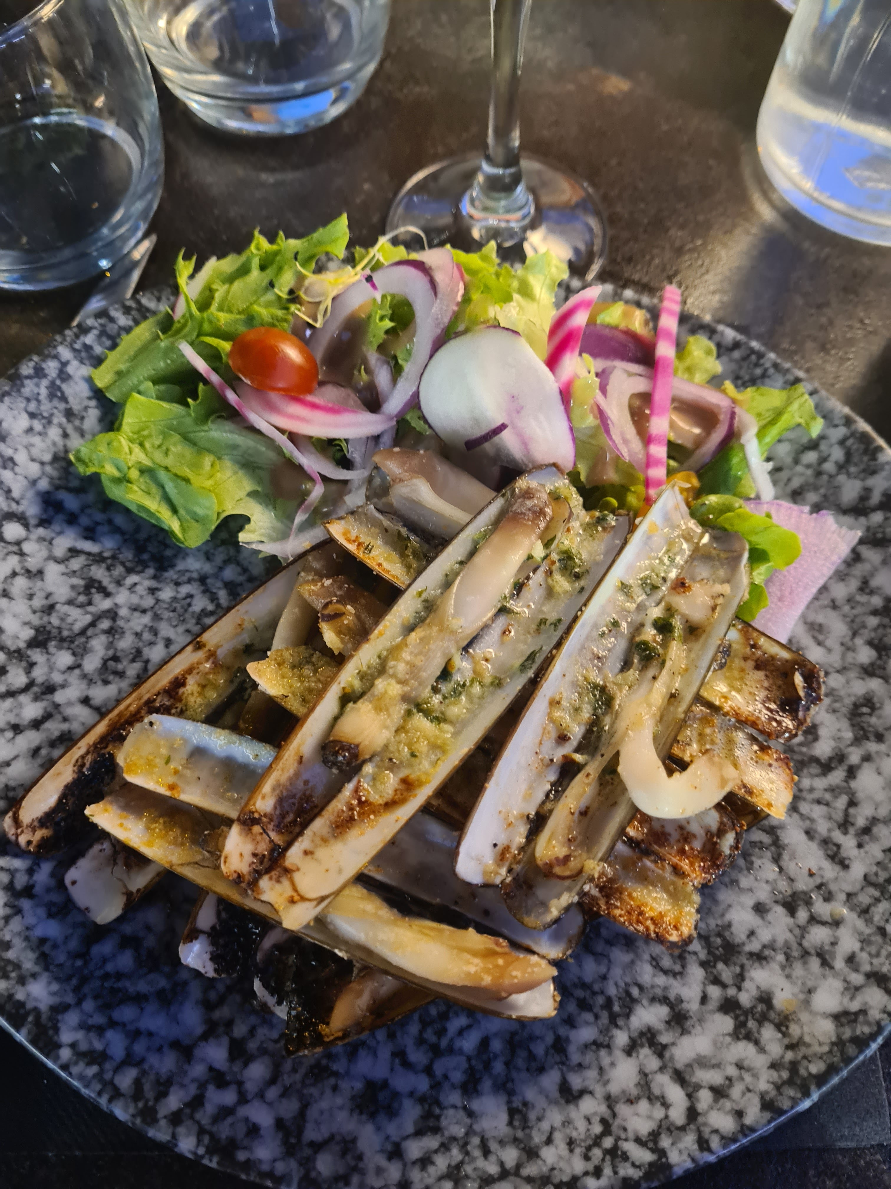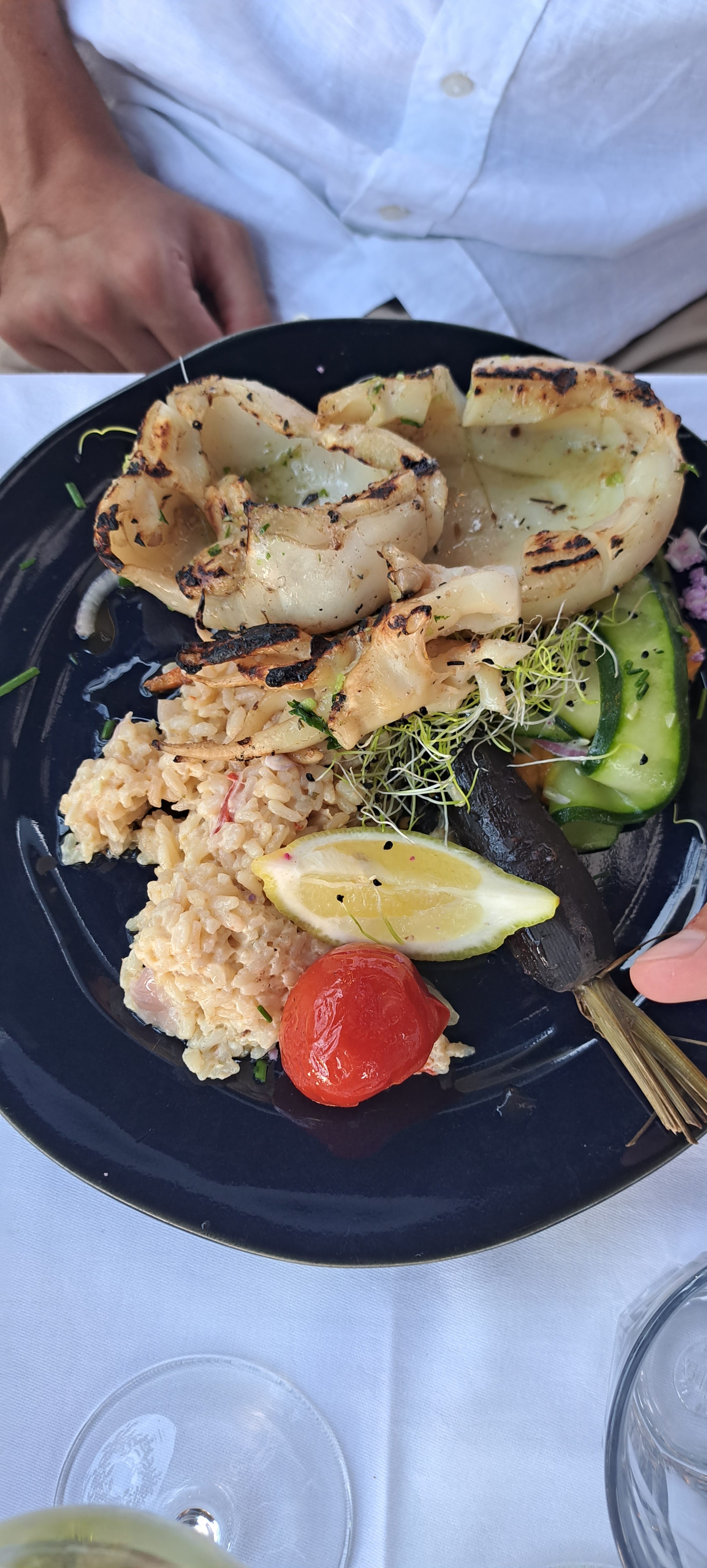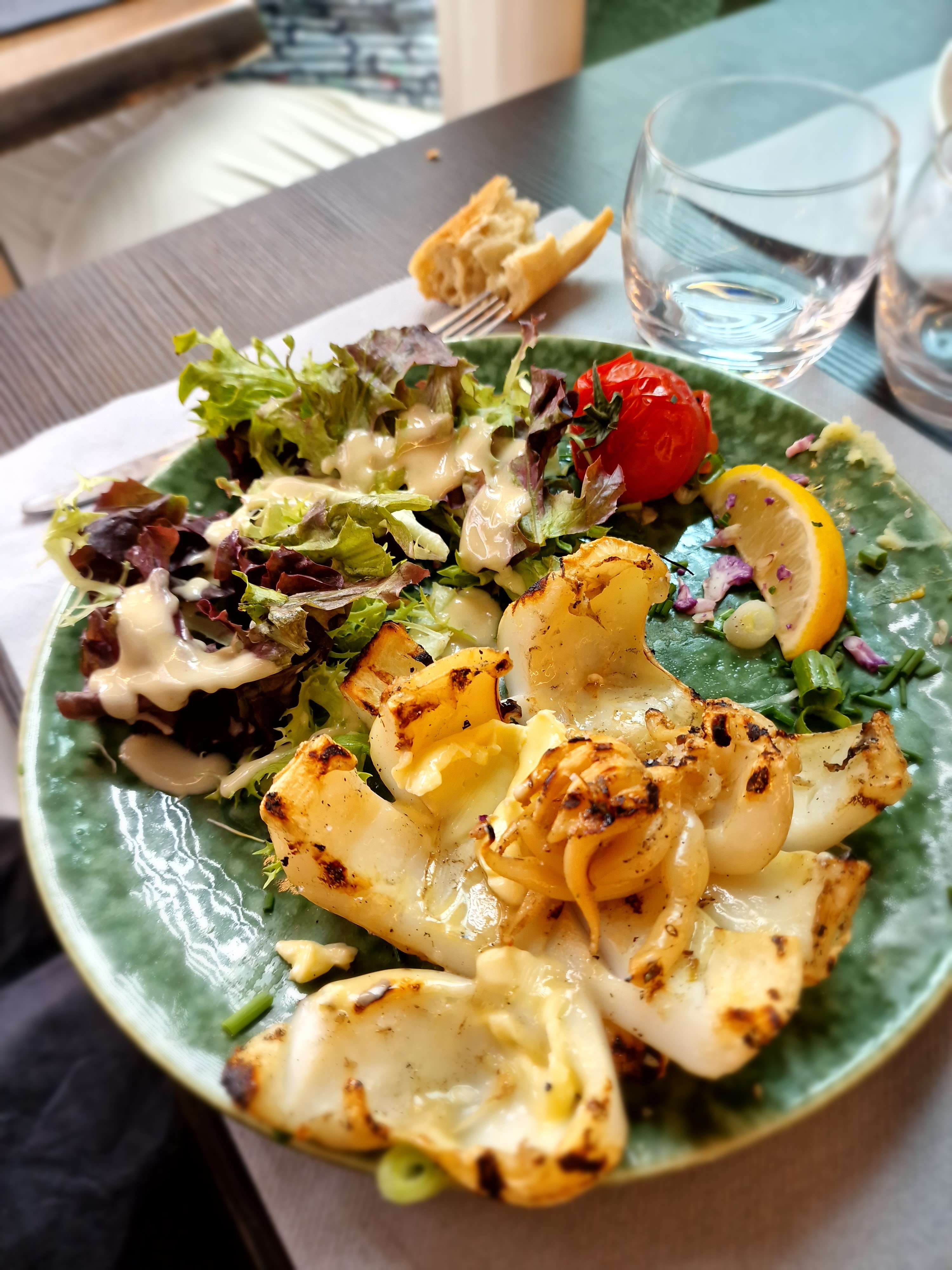 Superbe emplacement. Très bon accueil. Serveurs très agréables et respectueux. La cuisine délicieuse avec que du frais et ça se sent. Prix abordables. Les couteaux très goûteux, la seiche grillée très délicate et pas sèche du tout , au contraire très fondante, les gambas parfaitement cuites, le tiramisu à la rhubarbe, une tuerie. Je recommande vivement et j’y retournerai sans hésitation
