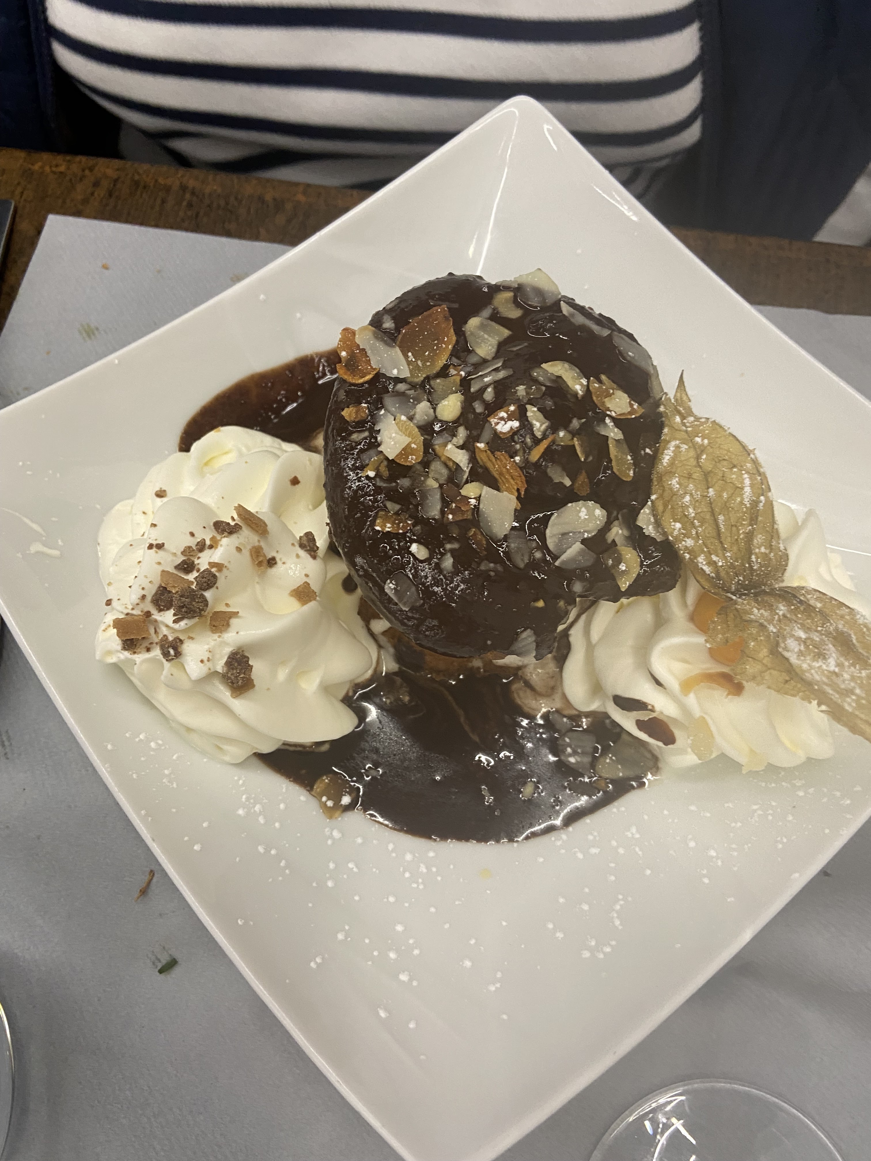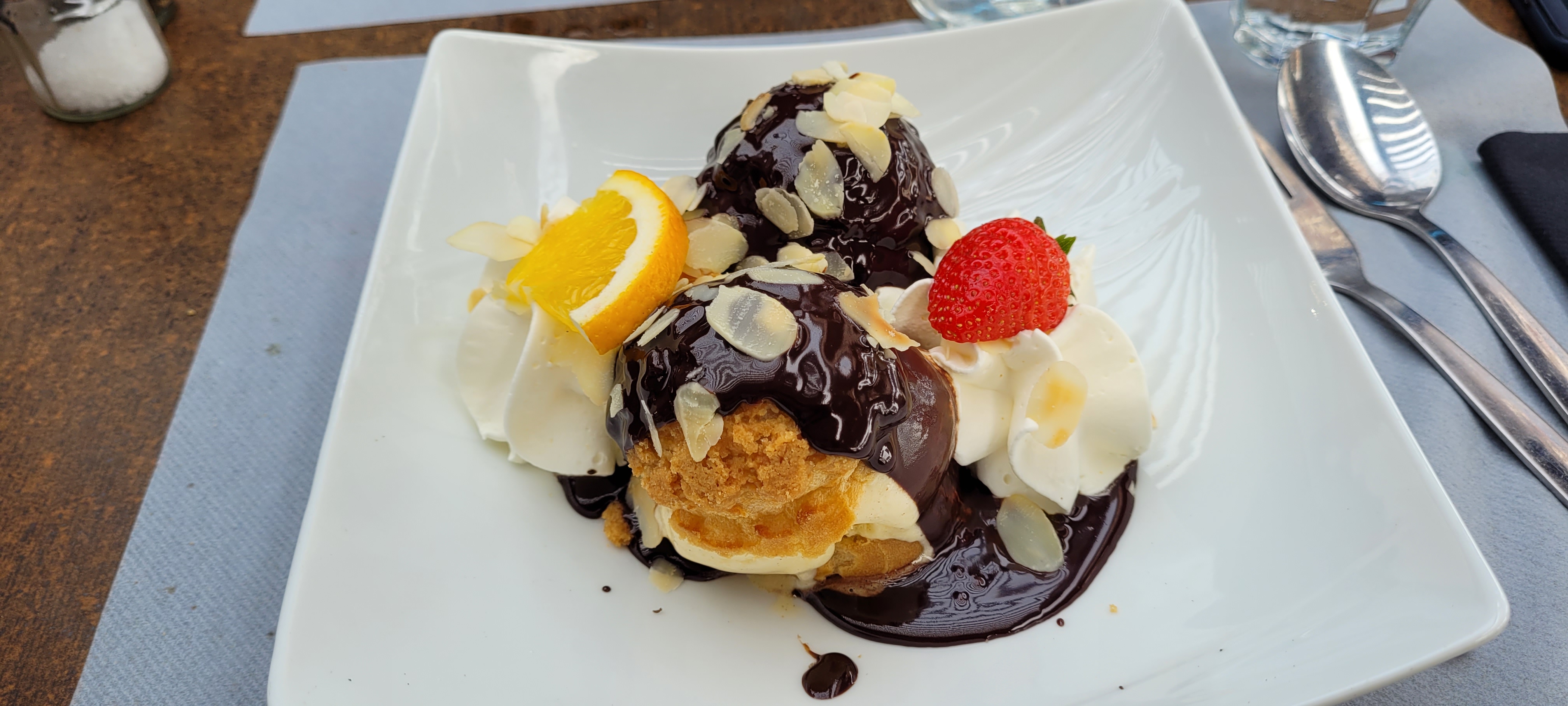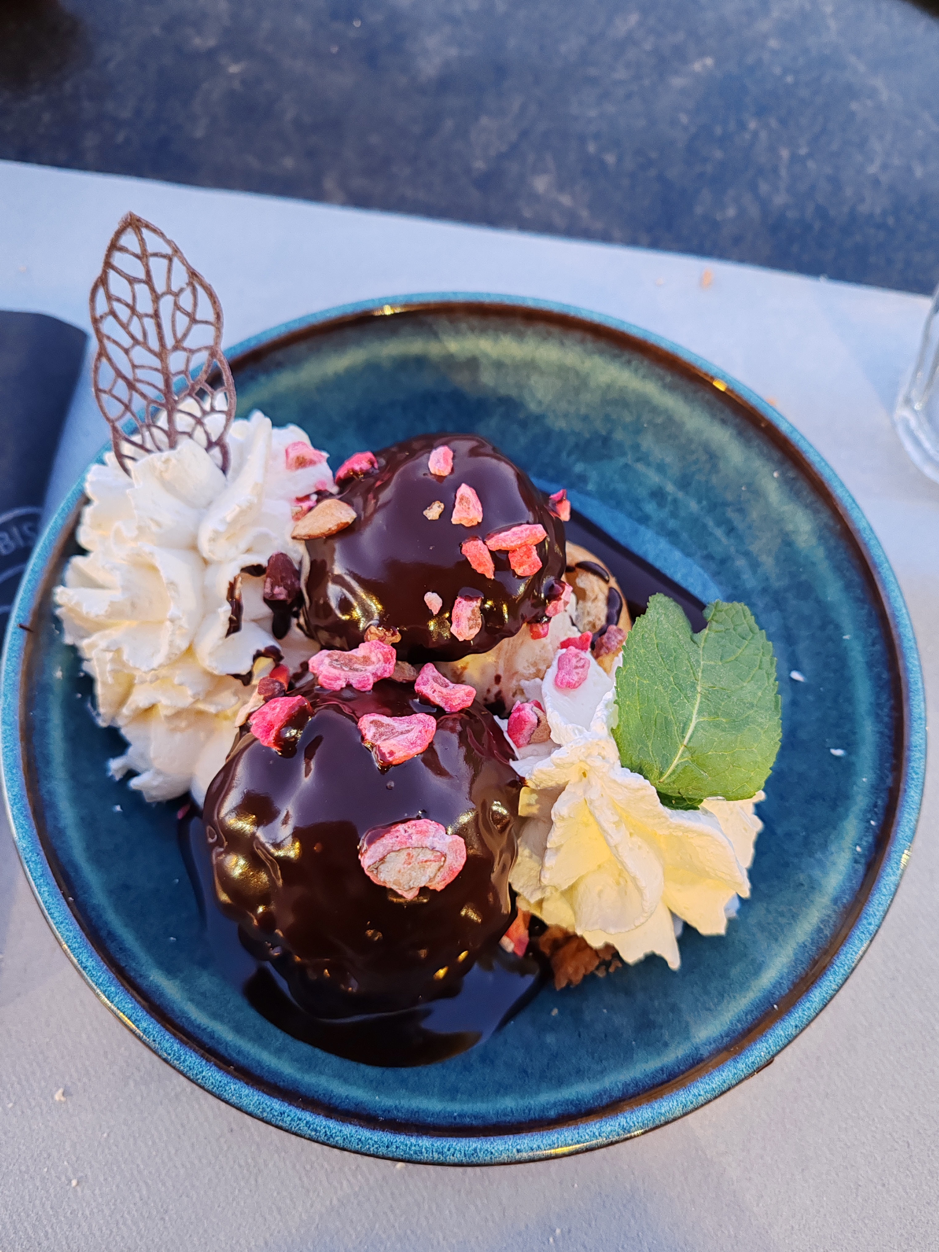 Très agréable le repas la vue un bémol sur le choux de la profiterole (moyen) Service impeccable et rapide très belle assiette même vide!!!!