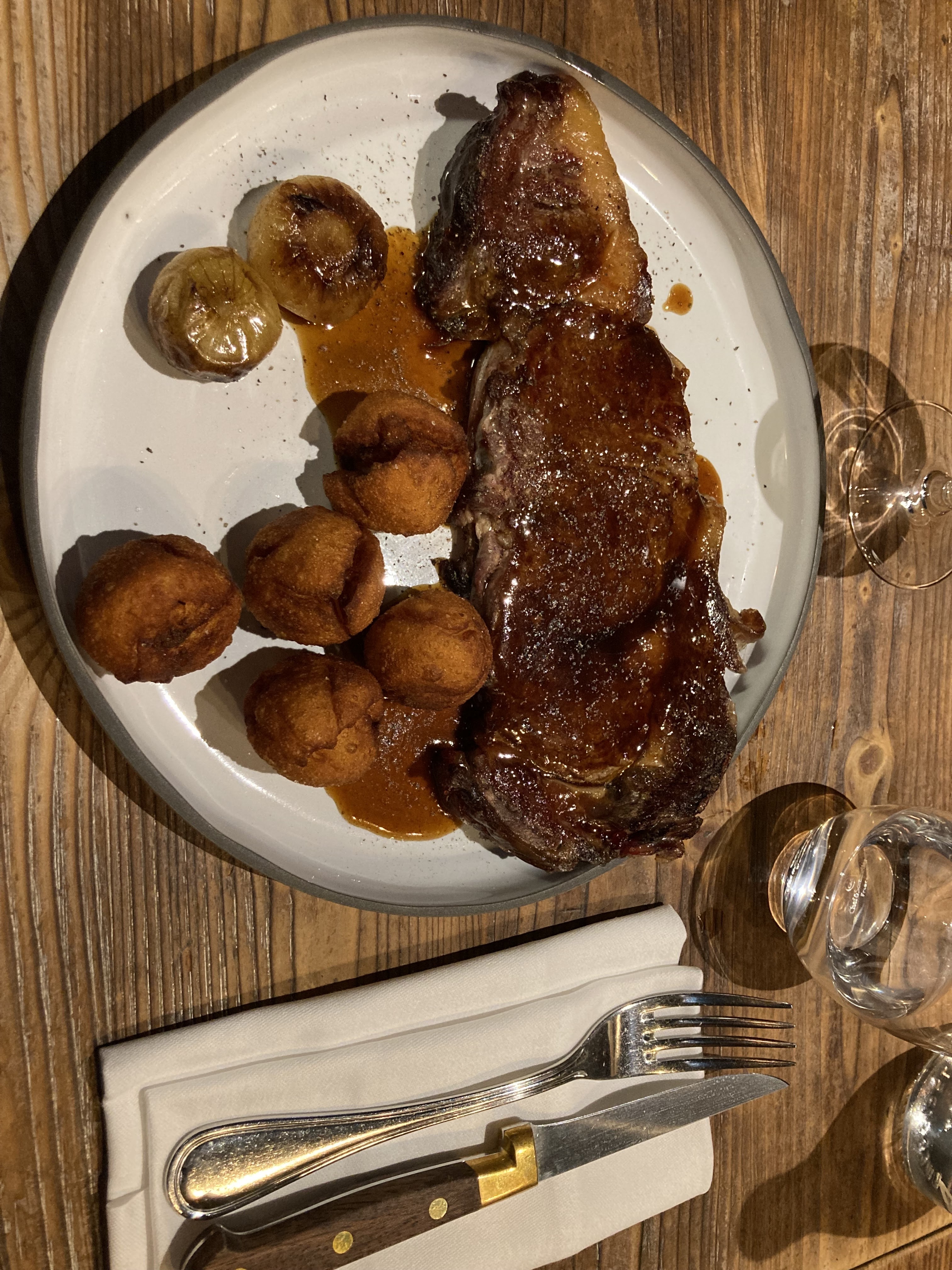 Les couteaux au beurre d'escargot pour l'apéro : une tuerie !! Le faux filet mâturé 55 jours : sûrement très bon mais cuisson ratée : j'avais demandé à point, j'ai eu ultra cuit... Dommage car la viande à l'air de qualité, le service (à part ça) est au top. On vous amène la pièce de boeuf entière à table, vous choisissez la quantité que vous désirez, une petite balance posée sur la planche qui amène la viande vous indique lenprix à payer (12 € les 100 gr, minimum 200-250 pour le faux filet, 350gr pour l'entrecôte).