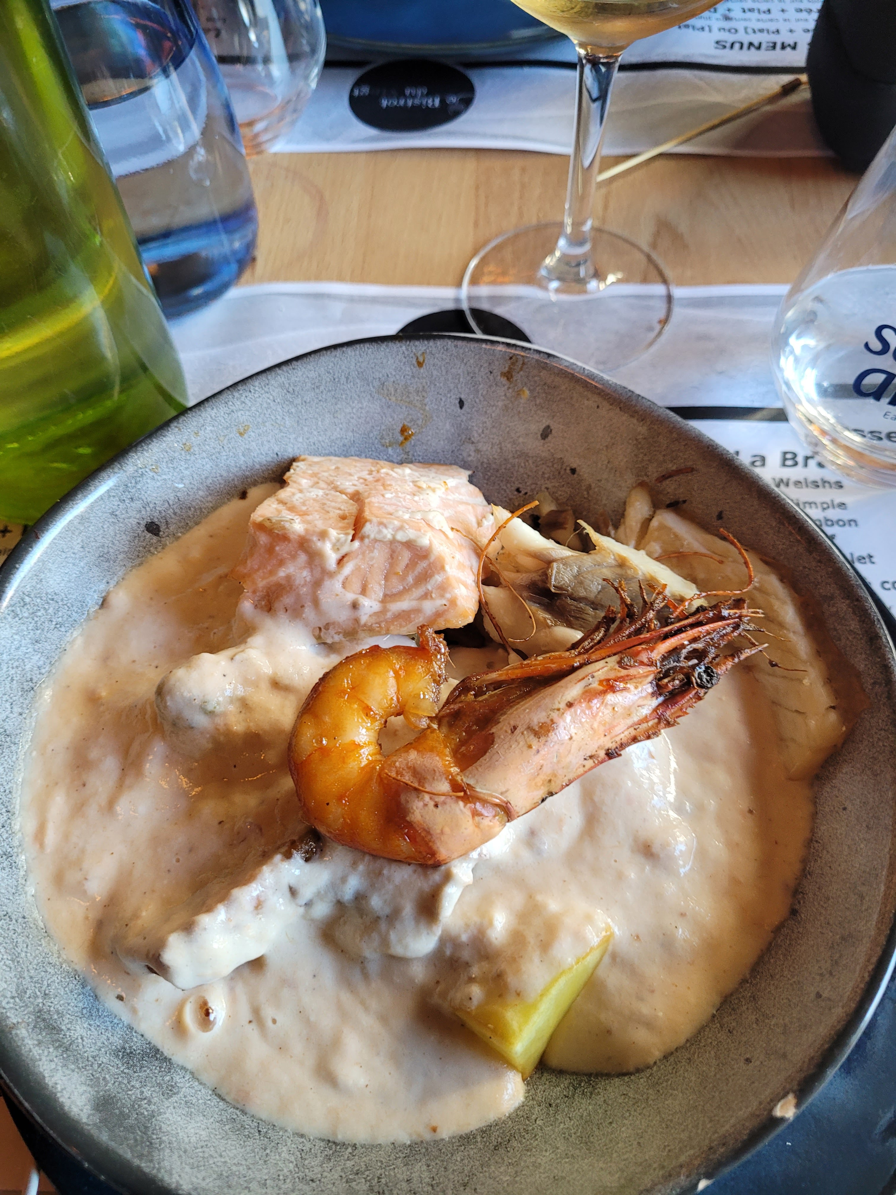 On ne connaissait pas Boulogne-sur-Mer et en cherchant plusieurs restaurants je suis tombé et choisi celui-ci. Un très bon site, un beau menu, que du fait maison et j'ai pu réserver très facilement. Arrivé là bas personnel très sympathique, très bon repas juste bien copieux. Le seul point noir aura été l'attente, assez long.