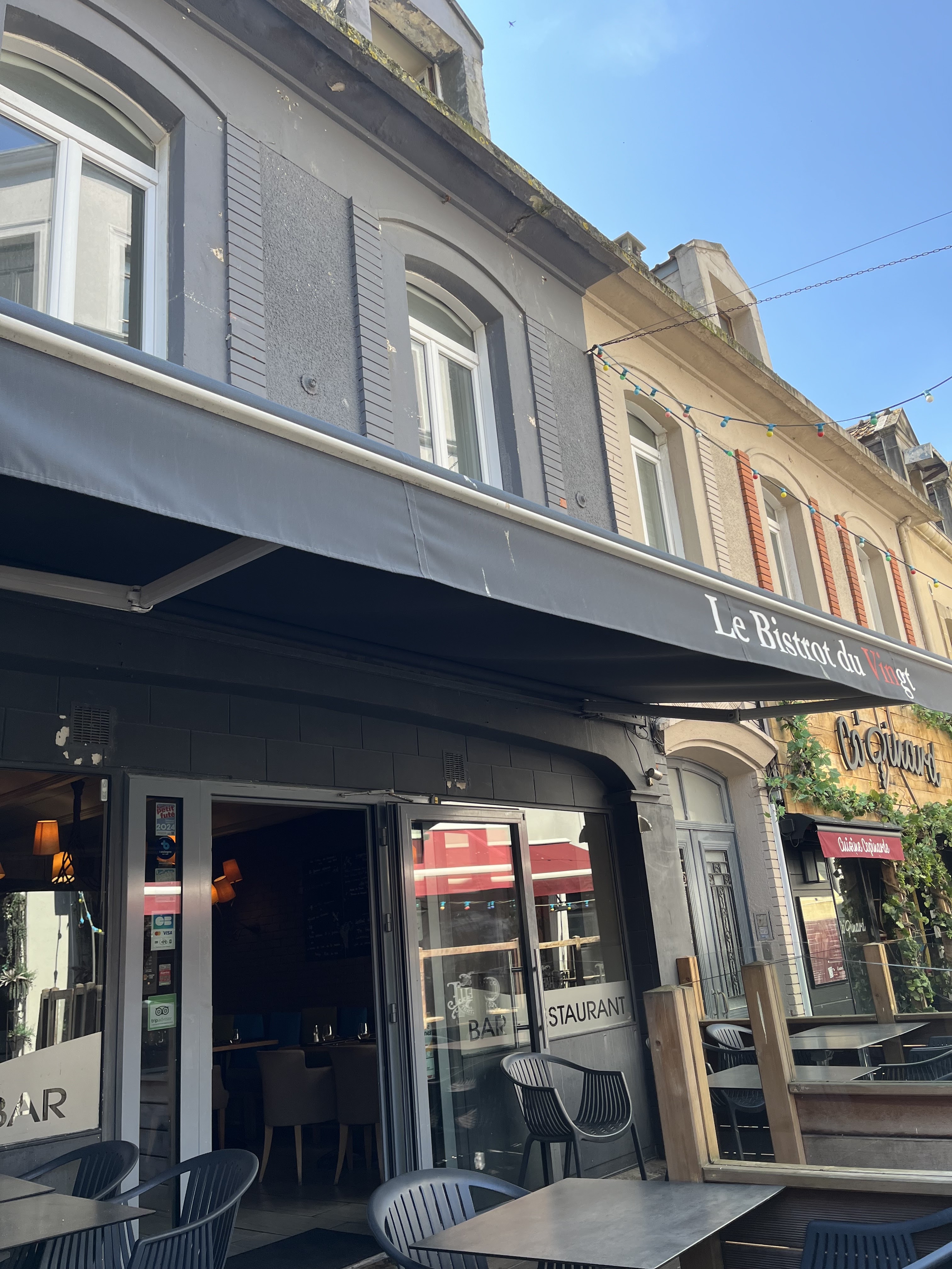 Nous avons passé un moment très agréable au Bistrot du Vin(gt) Venues pour le week-end à Boulogne sur Mer nous avons réservé une table dans ce bistrot sympathique et n'avons pas été déçu. Pour le dîner nous avons commandé une bavette ainsi qu'un camembert rôti et avons été vraiment surpris par la qualité des assiettes qui nous ont été servis ! Le goût était au plus qu'au rendez-vous sans lésiné sur la quantité, avec de belles assiettes bien garnies et des produits de très bonnes qualités ! Le service était lui aussi super, rapide et efficace. 2 seuls petits bémols pour ce restaurant : Attention : Les assiettes étaient tout juste chaude. Ainsi que l'emplacement des toilettes à côté de la cuisine c'est très bof.. (mais bon vous n'avez peut être pas pu choisir cela.) Cependant, cela n'as en rien gâché notre expérience ainsi que ma note pour ce bistrot, alors merci à vous pour ce sympathique moment ! Je recommande