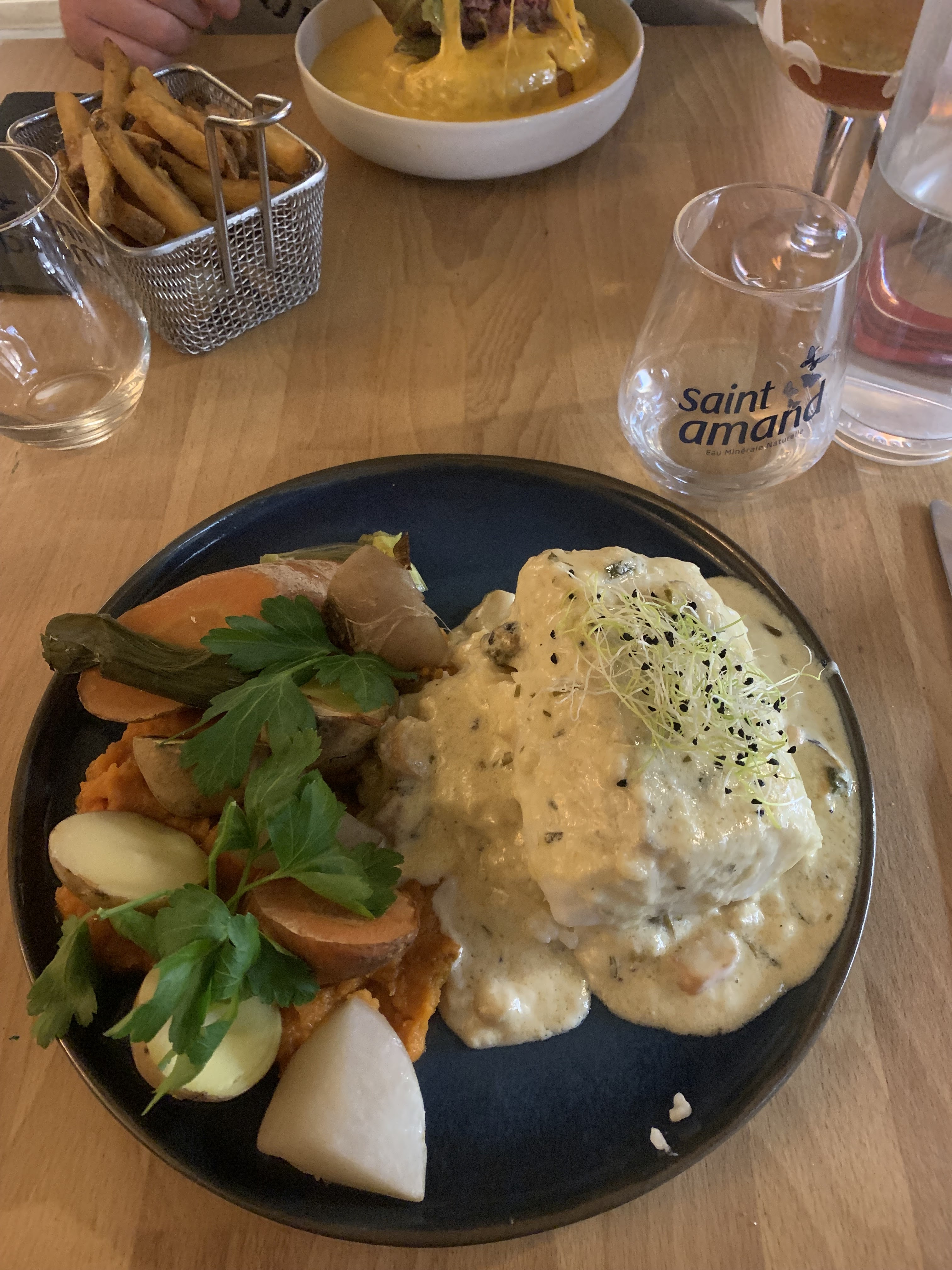 Belle adresse chaleureuse. Service agréable et rapide. Filet de bar très bien cuit et en bonne quantité avec ses accompagnements ! Moules au maroilles crémeuses, excellent ! Merci pour ce bon moment.