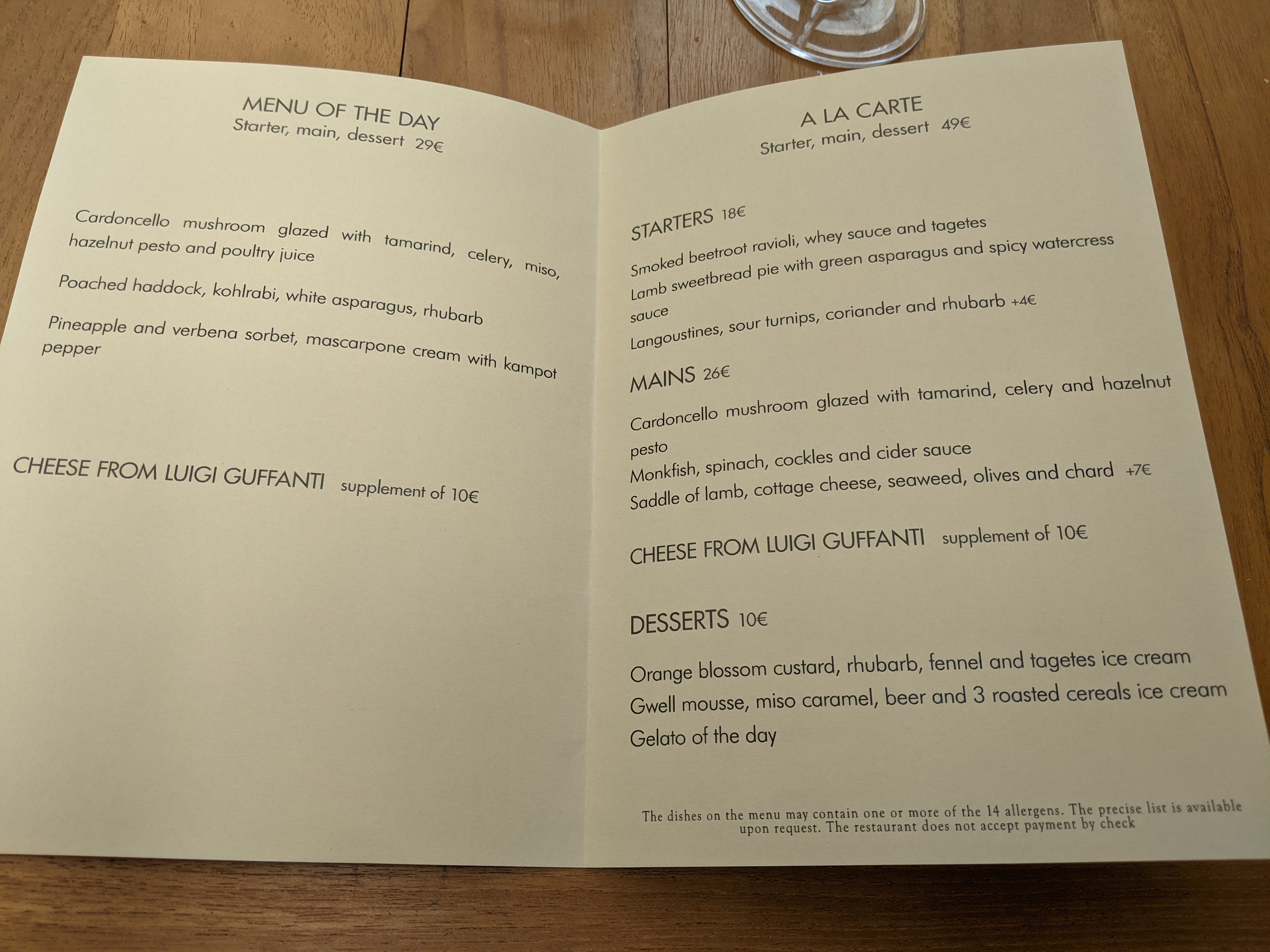 Très jolie carte aux tendances coréennes, simple mais sur des produits de qualité, et chois restreint. La carte des vins possède de bonnes signatures (cf le corps de garde blanc de chez goisot, ou le chablis de chez droin). En dessert, la creme caramel au coulis de pêche est un delice.