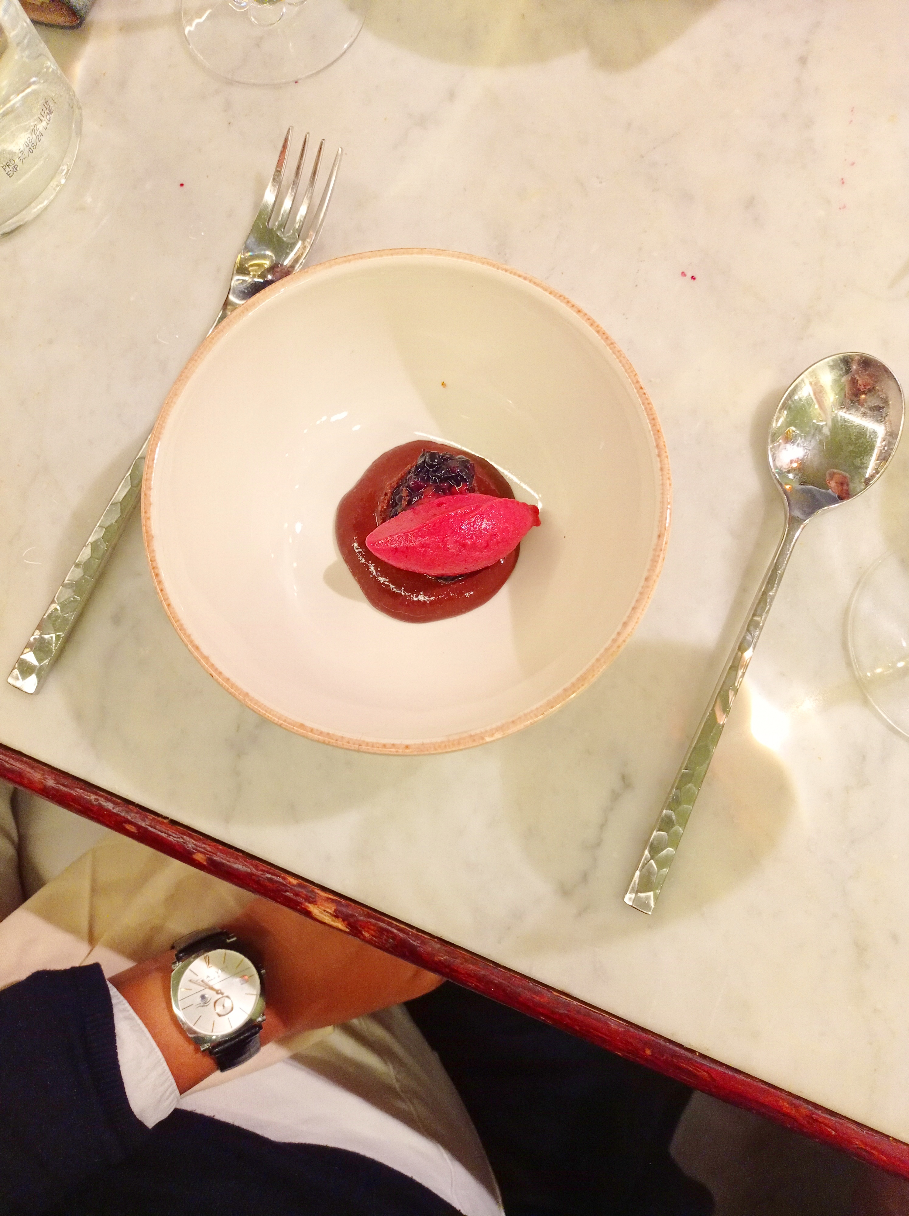 Dîner menu carte blanche. Des saveurs inattendues, des associations de goûts et de couleurs, chaque plat est décrit par le serveur, mentions particulières à la betterave et à l oursin.