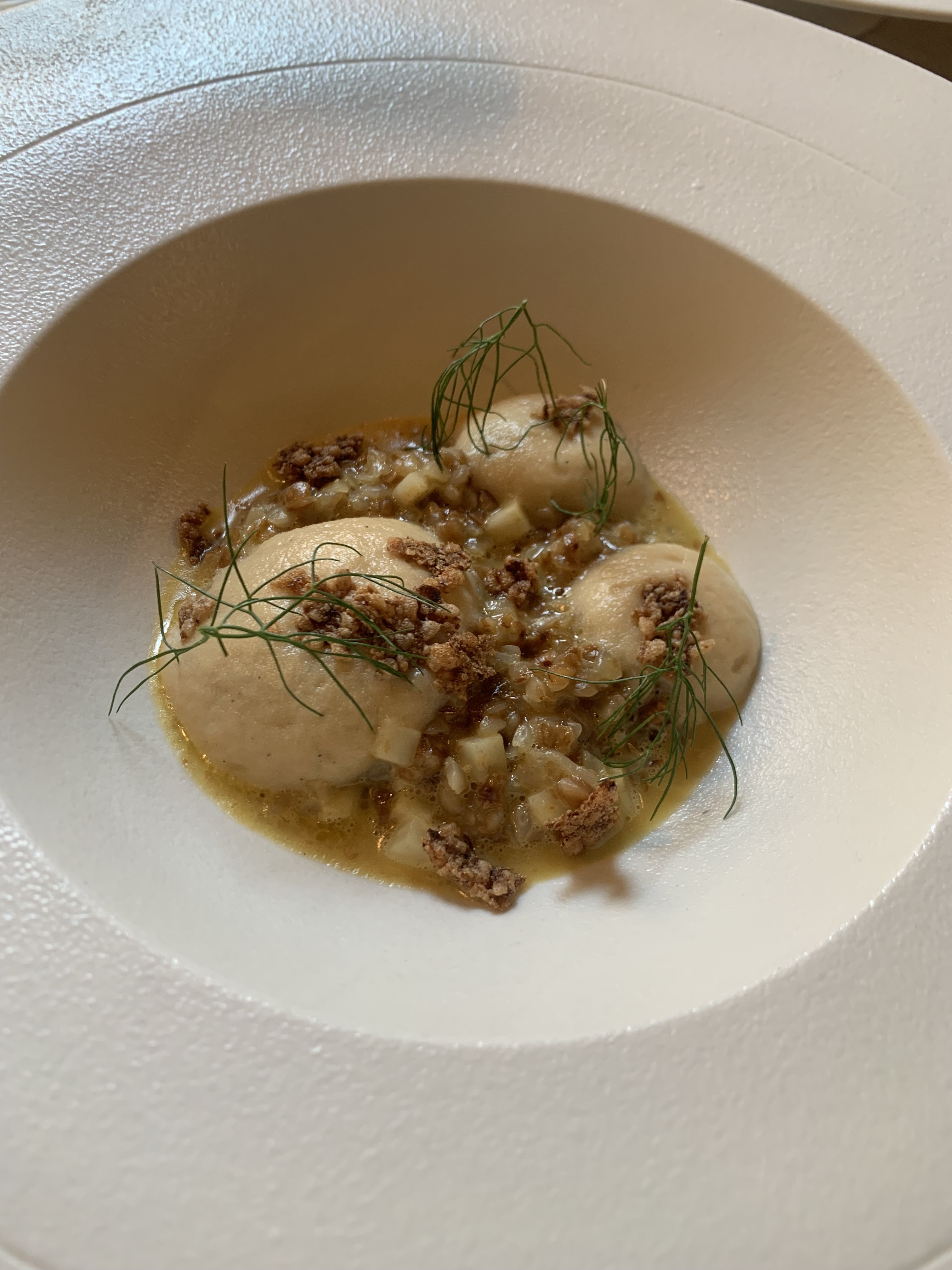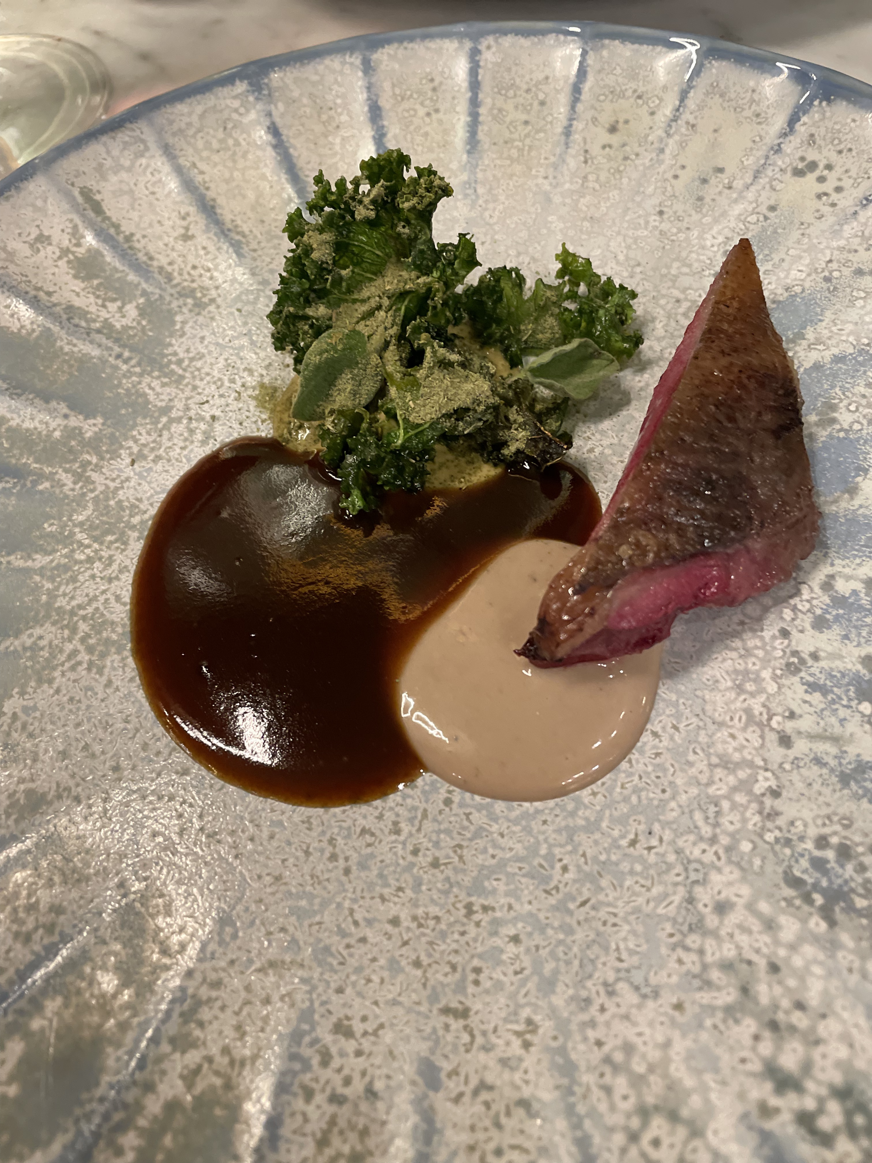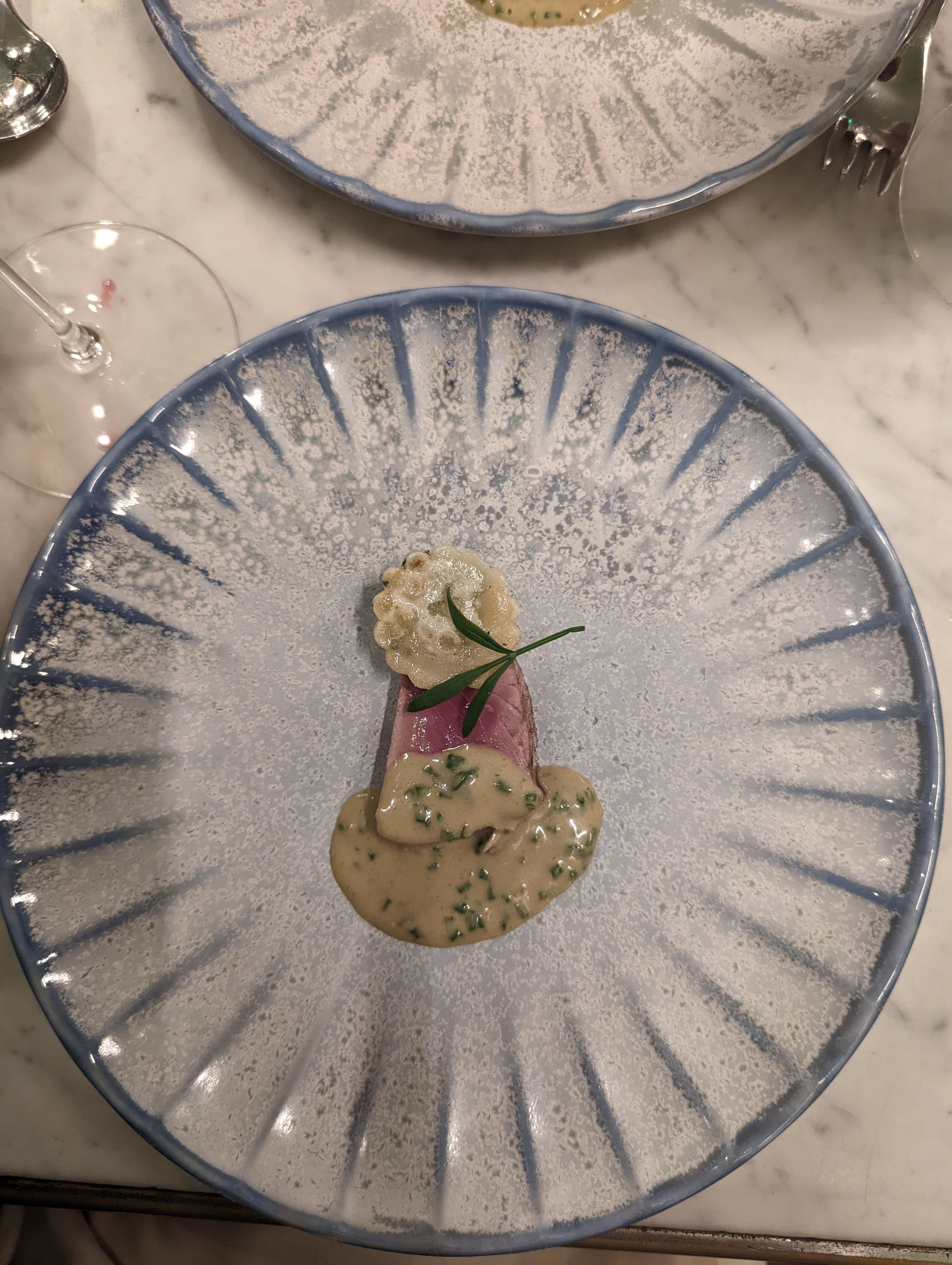 Repas inattendu et incroyable. La dégustation de 5 plats était la quantité parfaite de nourriture, ni trop ni trop lourde du tout. La prochaine fois, nous ferons le 7 cours ! Les raviolis à la betterave étaient ingénieux. Le personnel était adorable et assez drôle. Le sommelier a sélectionné pour nous 2 vins vraiment excellents et nous a appris de nouvelles choses. Nous reviendrons certainement bientôt.