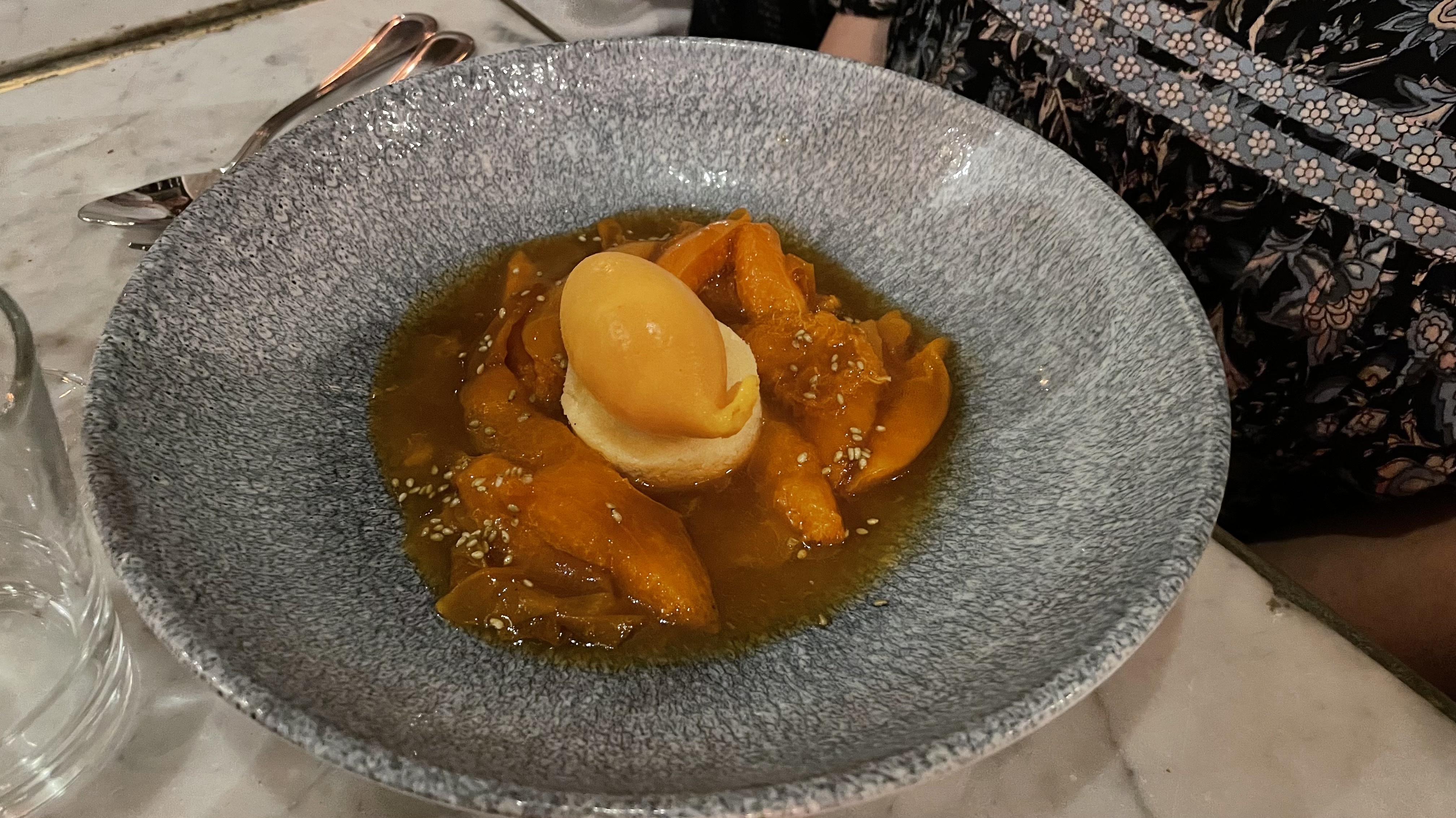 Coup de chance, l'averse s'est terminée 10mn avant notre arrivée. Le service est très sympa et l'assiette de qualité. En entrée le poulpe puis le casi de veau, une mention pour le baba au yuzu .