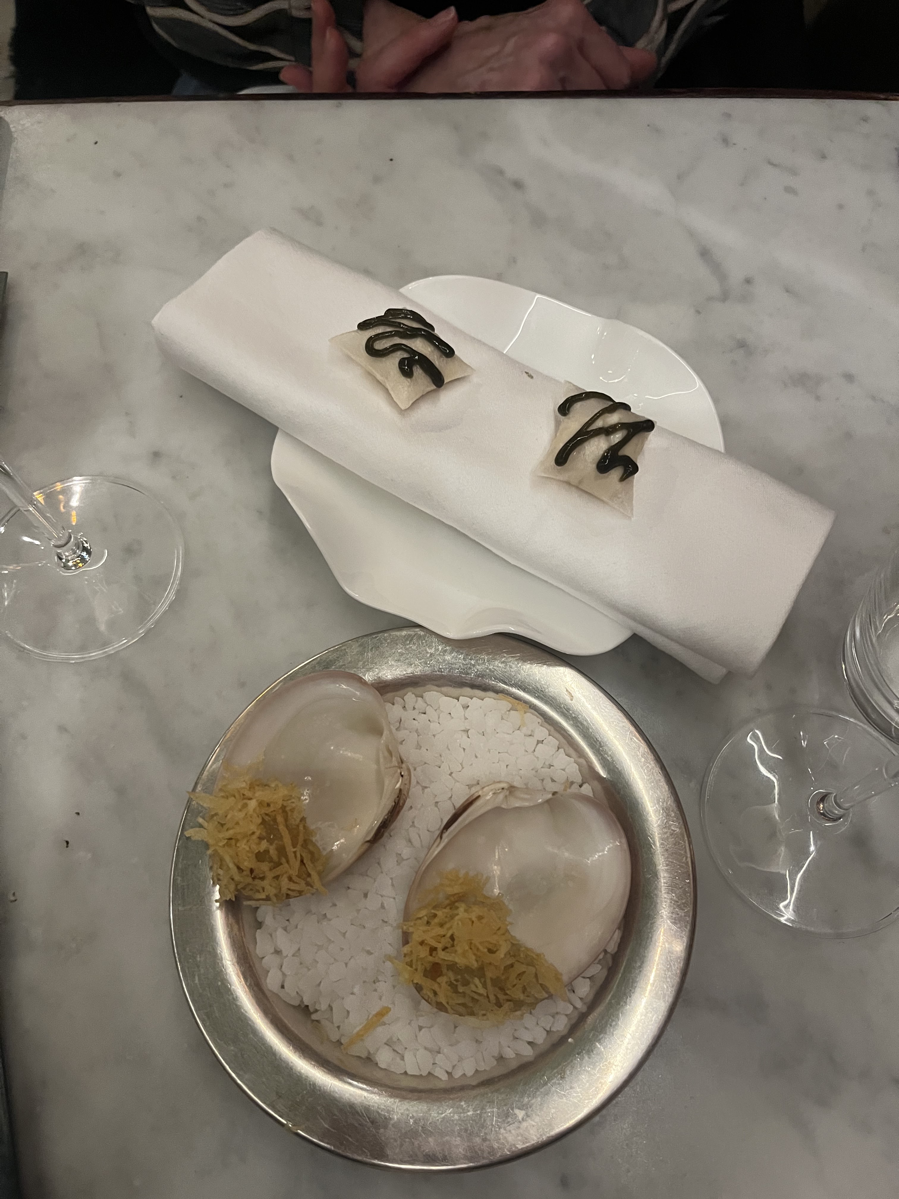 Dans le 17eme arrondissement de Paris, Un lieu exceptionnel et assez étonnant : Car on ne soupçonne pas de l'extérieur qu'on va se régaler à ce point... Un menu en 8 services qui nous a tous les quatre... stupéfaits. Bien sûr, on ne se souvient jamais du nom précis de tous les plats ainsi que du nom des ingrédients (dont on a rarement entendu parler), mais l'assemblage des saveurs est calculé, savamment dosé, pour que tous les convives aient ce petit effet waouh ... Bravo au chef, qui est d'ailleurs venu nous présenter l'un de ces plats. Je partage ici quelques photos, avec une mention spéciale pour le pigeon cuit sur le coffre avec son jus condimenté. Detauls: Les amuses-bouches sont délicats et surprenants. Pain délicieux. On y est tous très sensibles 😉 Jetez un œil aux couteaux, ils sont assez uniques. Le cadre est simple, cosy. Bien sûr on est un petit peu à l'étroit sur ces tables de bistrot et ces banquettes d'epoque un peu rafistolées, mais l'esprit est là. La salle n'est pas très grande et forcément le WC donne directement sur la jonction cuisine / salle, c'est un point d'amélioration. Une cuisine semi-ouverte avec une brigade qui fignole des plats exceptionnels, tant par le mélange des saveurs que par le dressage. C'est cher mais ça le mérite amplement, le service est parfait et les conseils de l'oenologue sont judicieux. Conclusion : Pour celles et ceux qui aiment la cuisine du niveau étoilé, mais sans les étoiles !