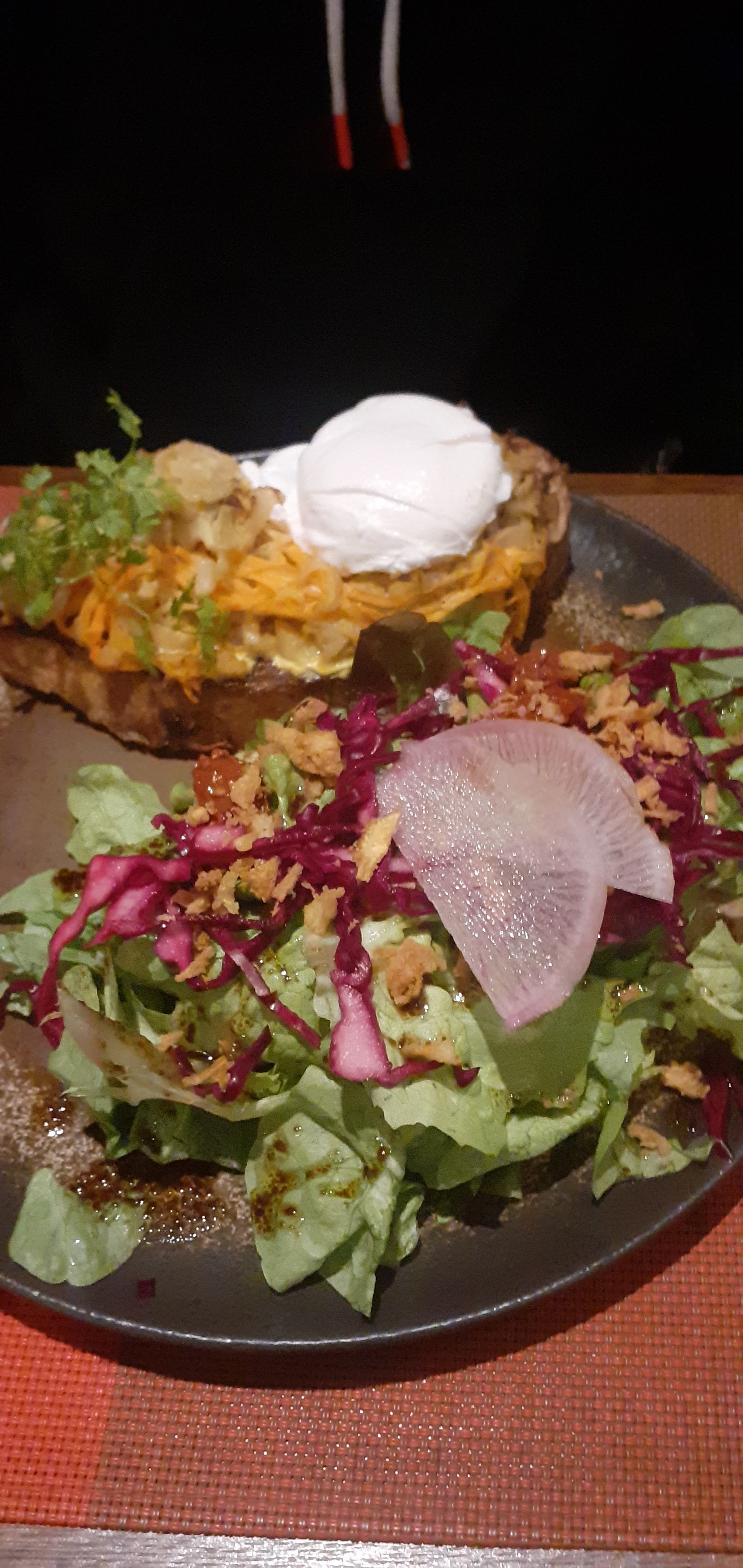 Bonjour, Nous y avons déjeuné il y a une semaine environ un midi d' une entrecôte potatoes et d'un plat de légumes croquants avec un oeuf mollet sur pain brioché. C'était ce qui était marqué sur la carte. Il n'y a pas trop mot qu'INFAME .: Concernant l'assiette de mon mari les potatoes étaient brulées par l'huile, ce qui n'a eu l'air de déranger le serveur et mon plat ,froid, et heureusement que j'avais lu de quoi il aurait dû être composé parce ce rien n'était reconnaisssable. Une pâtée recouvrait un pain mou imbibé , un oeuf cuit à l'avance et 3 feuilles de salade sans vinaigrette. Au delà de cette nourriture ???? c'est l'attitude sereine des serveurs .
