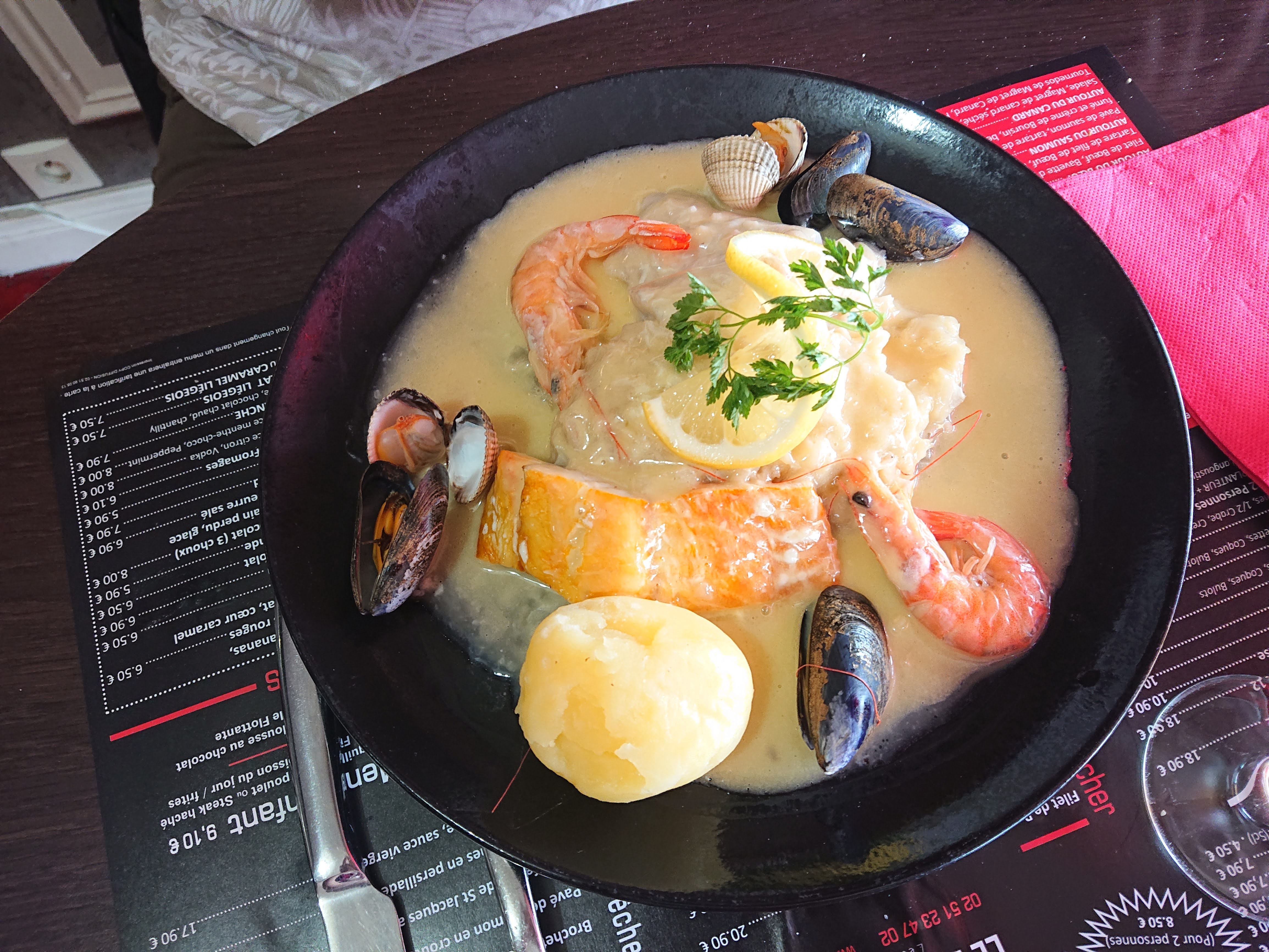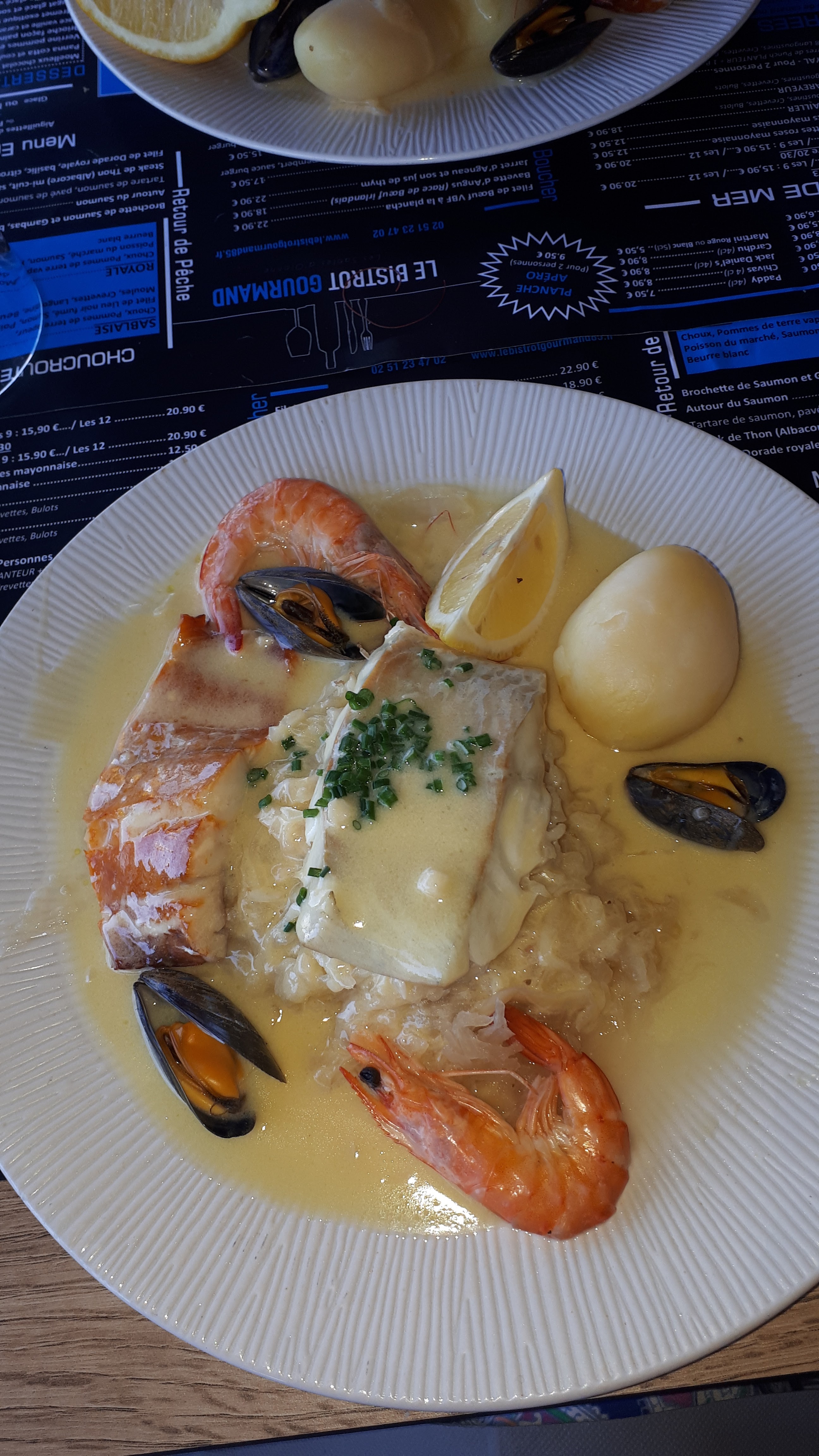 Nous avons mangé une excellente choucroute de la mer, un plat qui est arrivé sur notre table bien chaud , choucroute bien garnie, excellente sauce, félicitation aux cuisiniers, nous avons été servie par une serveuse très agréable et gentille, nous avons cherché un restaurant ouvert un lundi soir pendant les vacances, (il y en avait très peu sur le port) et bien dommage pour les autres car je vais revenir pour le Vendée globe, et je serais ou aller.