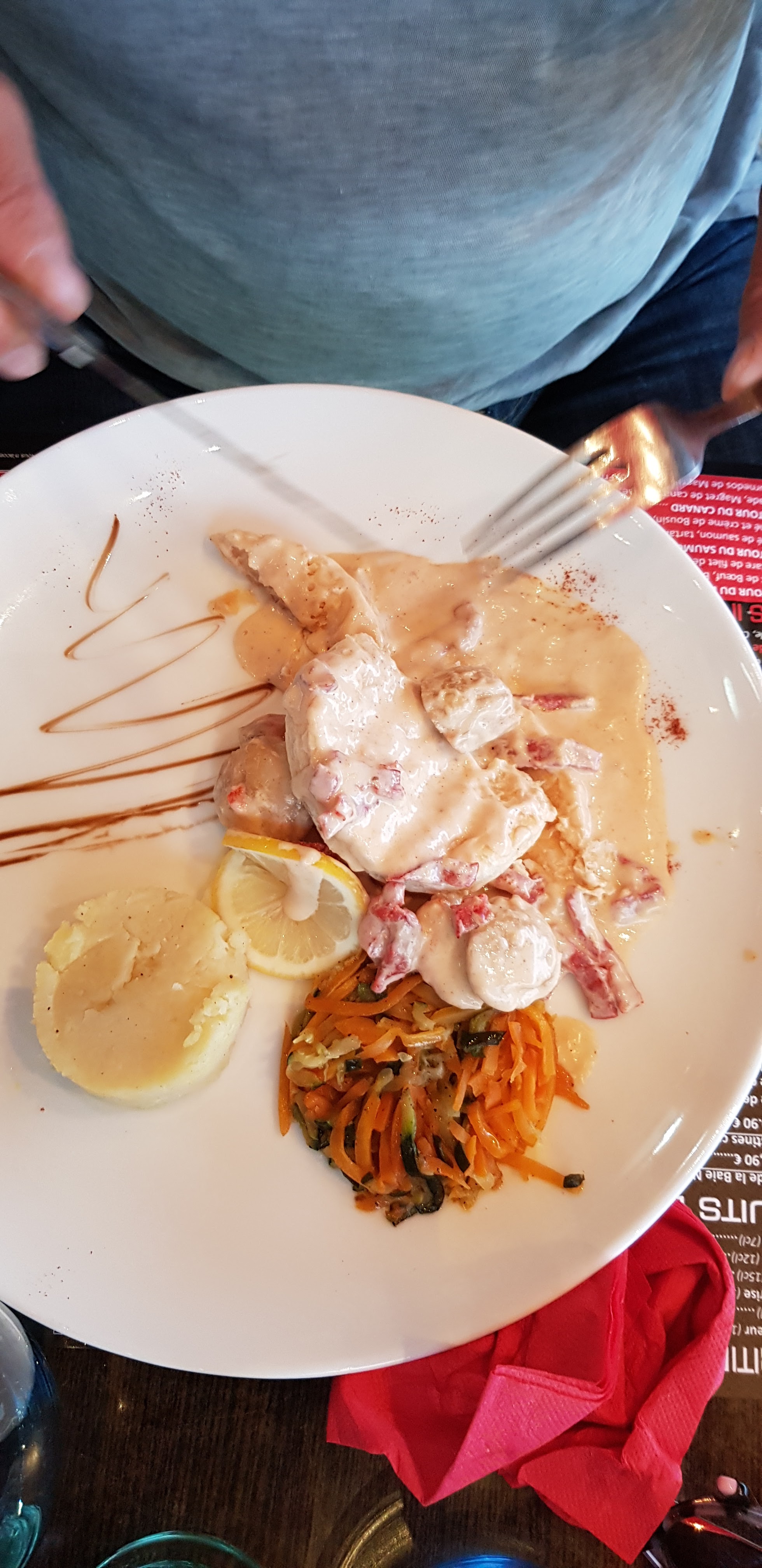Accueil sympathique les serveurs sont souriant. Rien a dire si ce n'est que c'est bien et bon. Pour nous ce soir menu à 17,90€ entrée, plat et dessert. Au menu rillette de thon, choucroute de la mer et panna cotta. Et pour ma famille assiette de st Jacques et de sèches.