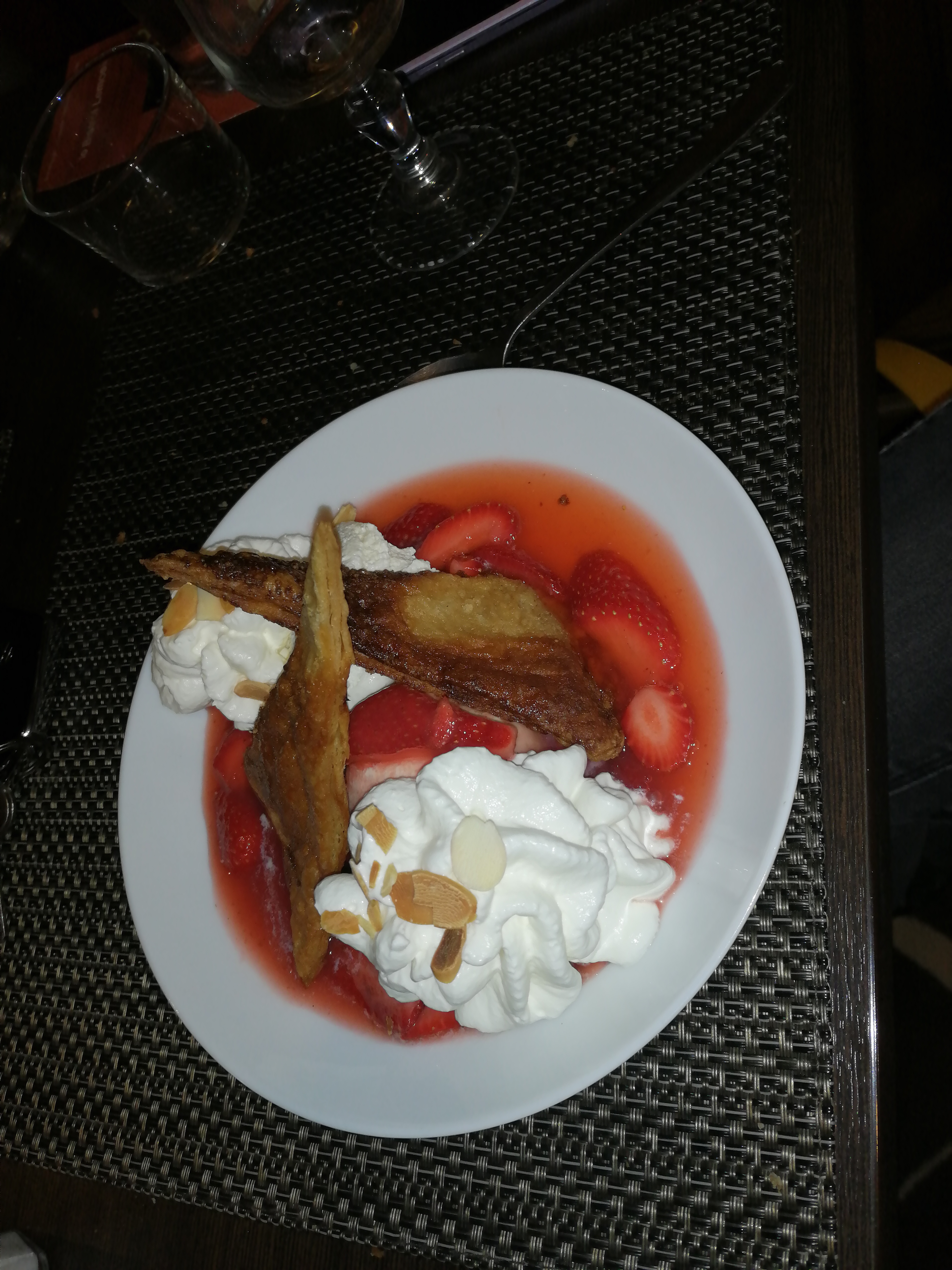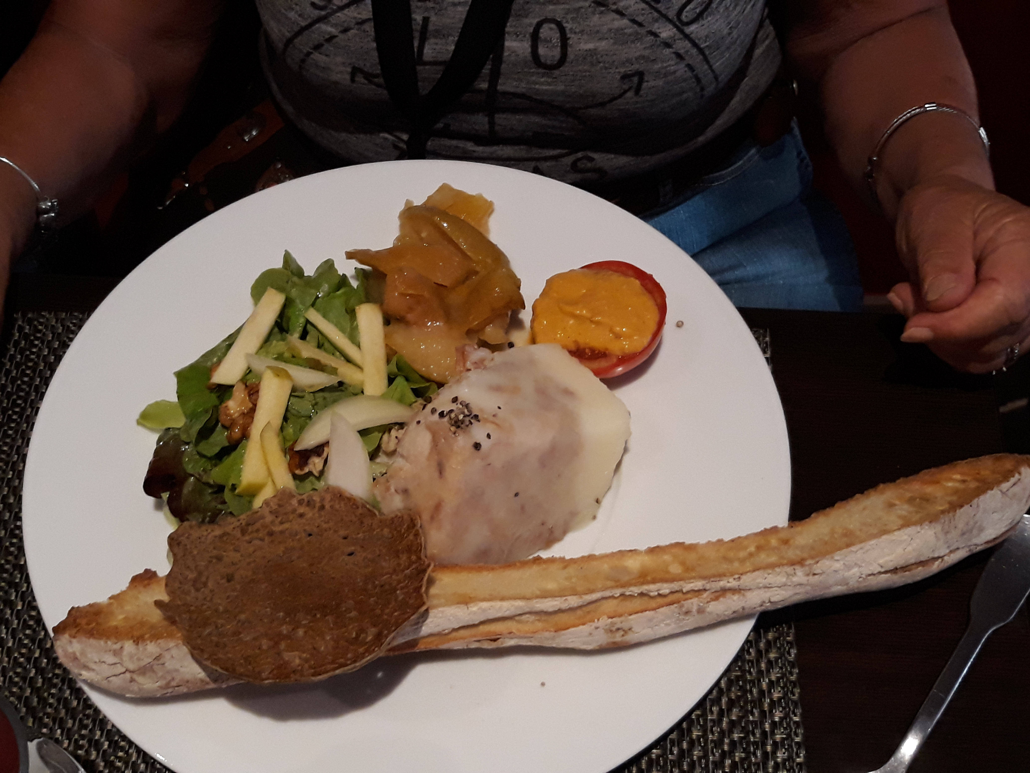 En entrée du foie gras , surprise, contrairement à la plupart des restaurants qui servent une tranche de foie gras épaisse comme une feuille de papier à cigarette avec 2 pauvres toasts , ici il y à de la matière ! Pour le plat j'ai opté pour le rosbeef accompagné de frites maison et salade verte mais j'ai été un peu déçue car là les tranches sont vraiment très fines. Dans l'ensemble je dirais que la cuisine est correcte sans être de la grande gastronomie. Un bémol pour la lenteur du service .