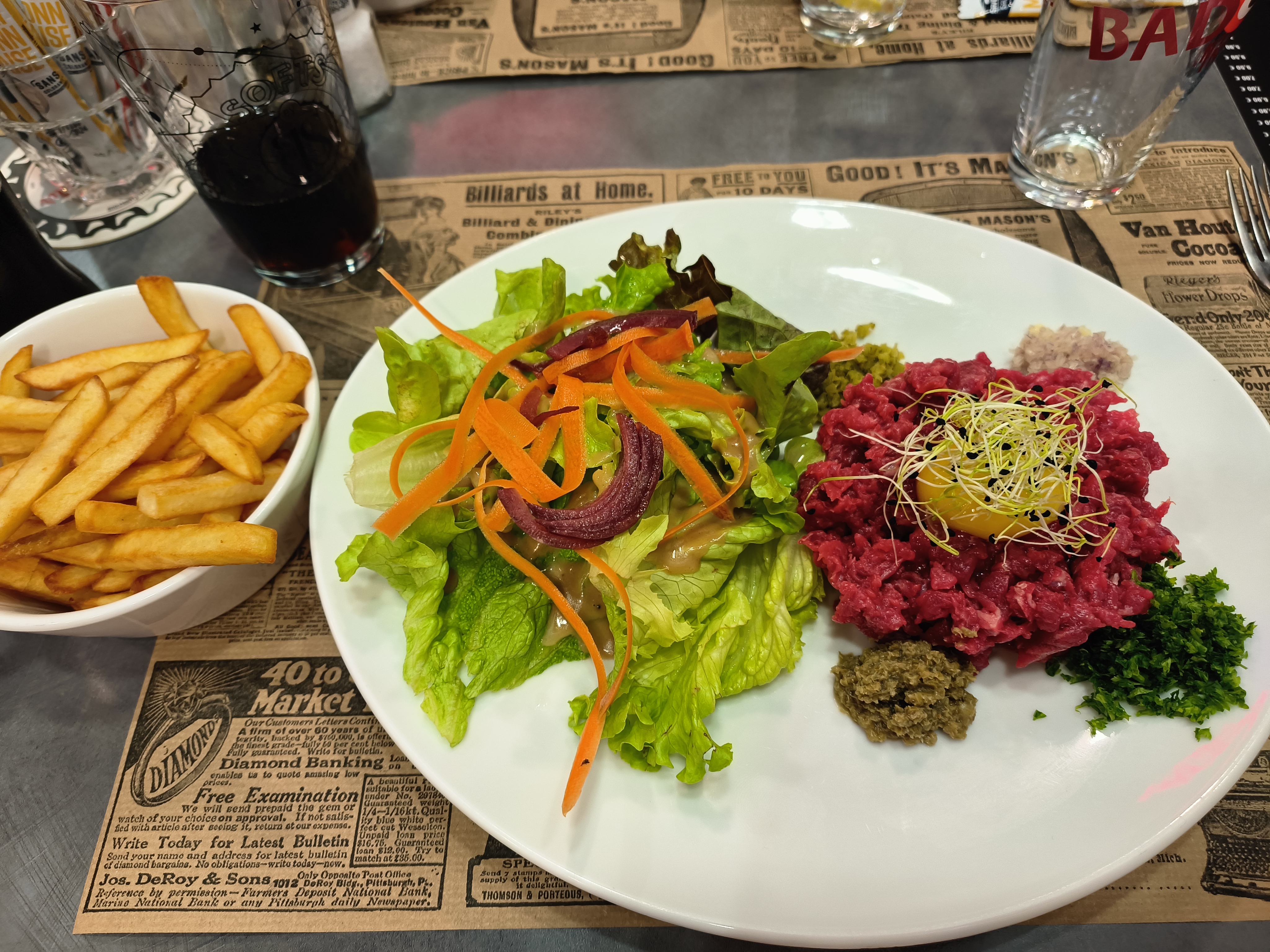 Nous avons très bien mangé. Tartare de bœuf au couteau, pâtes carbonara et andouillette . Un petite surprise avec une petite mise en bouche très bonne . De bons desserts : le meilleur tiramisu d’après ma fille ! Et pour ma part le meilleur cappuccino du secteur !