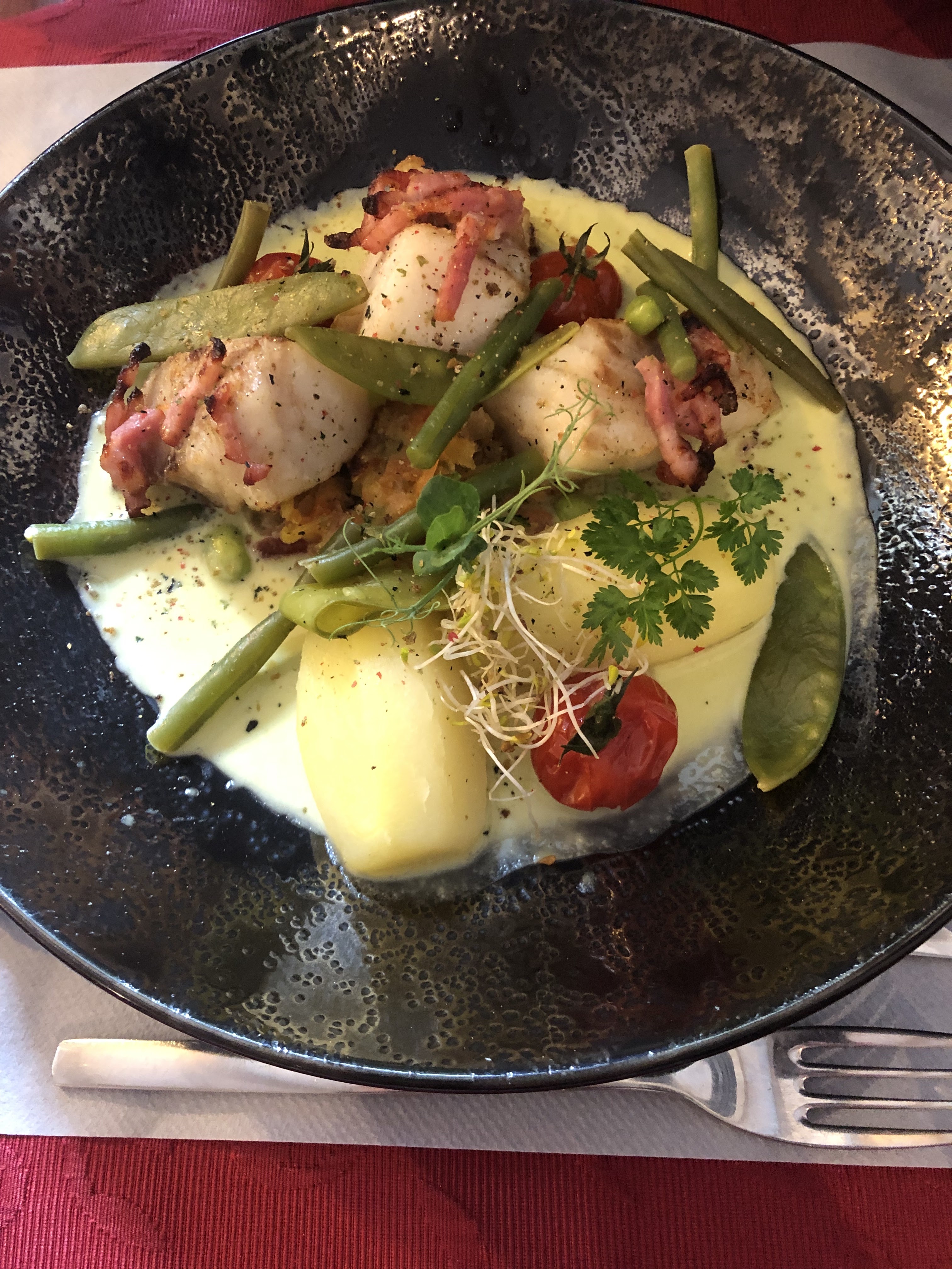 Repas ce midi nous avons pris le poisson du jour accompagné de ses légumes un vrai regal copieux bon et beau servi ds de la belle vaisselle Je recommande cette adresse bon frais toit est fait maison belle présentation bravo