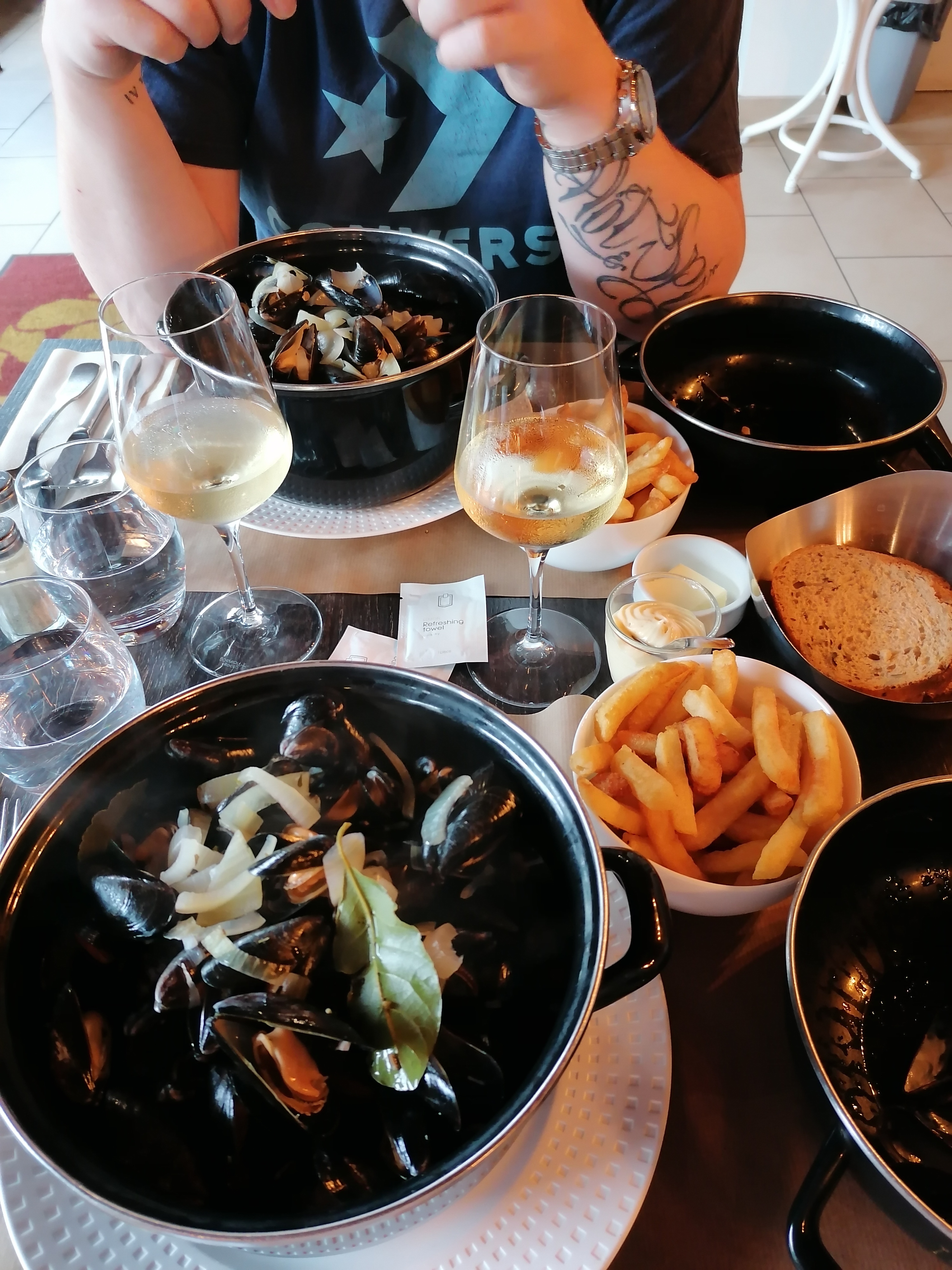Idéalement placés en vitrine ; l'apéro sans alcool avec une planche de charcuterie , une très bonne idée , suivie d'une délicieuse moule à la crème/frites , le châblis au verre , autre bonne idée , le tout pour un prix plus que raisonnable . Nous reviendrons , c'est certain !