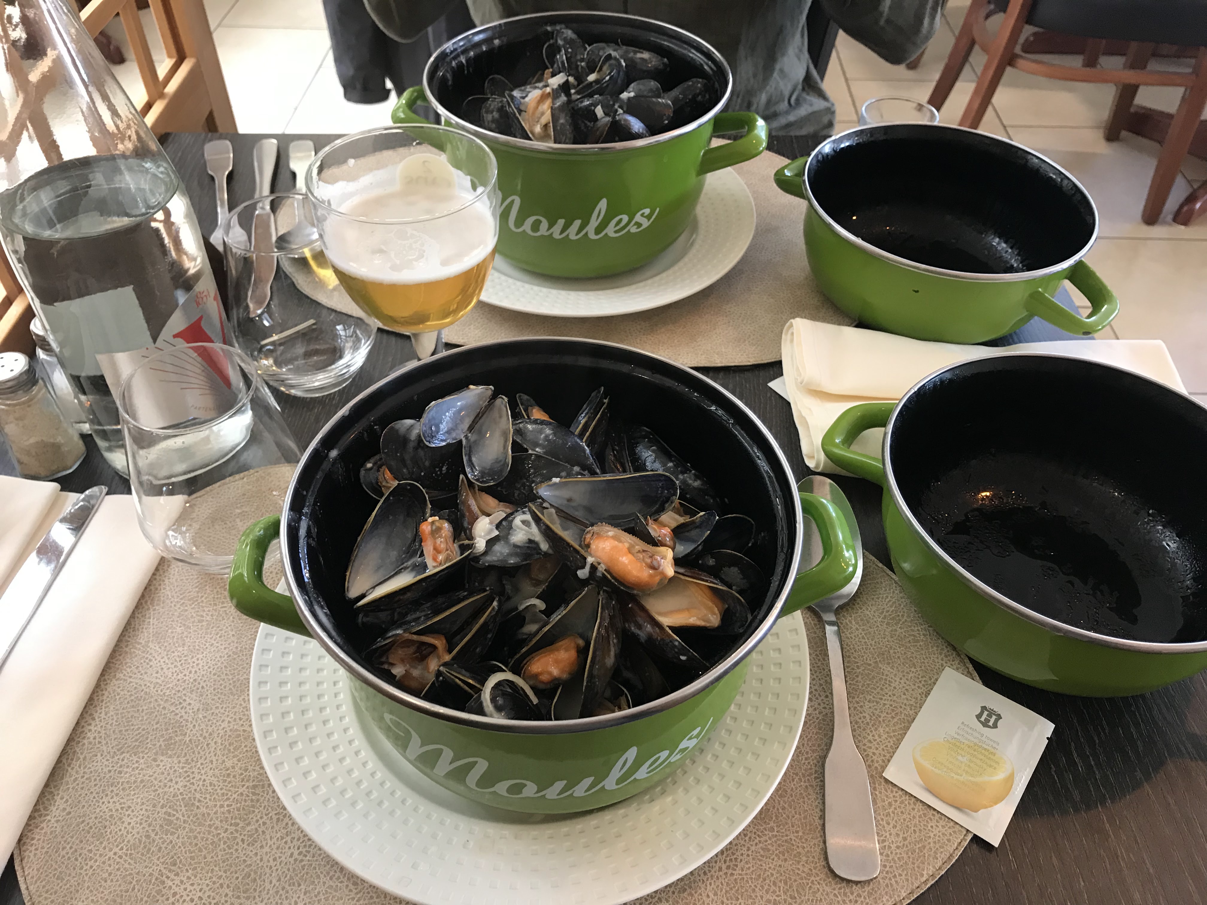 Moules marinière sans oignons, sans céleri... Juste du thym! Dommage, les moules étaient belles et cuites comme il faut et le personnel de salle très gentil. Nous sommes parti sans café ni dessert pour oublier tout ça en admirant le coucher de soleil qui lui était réussi.