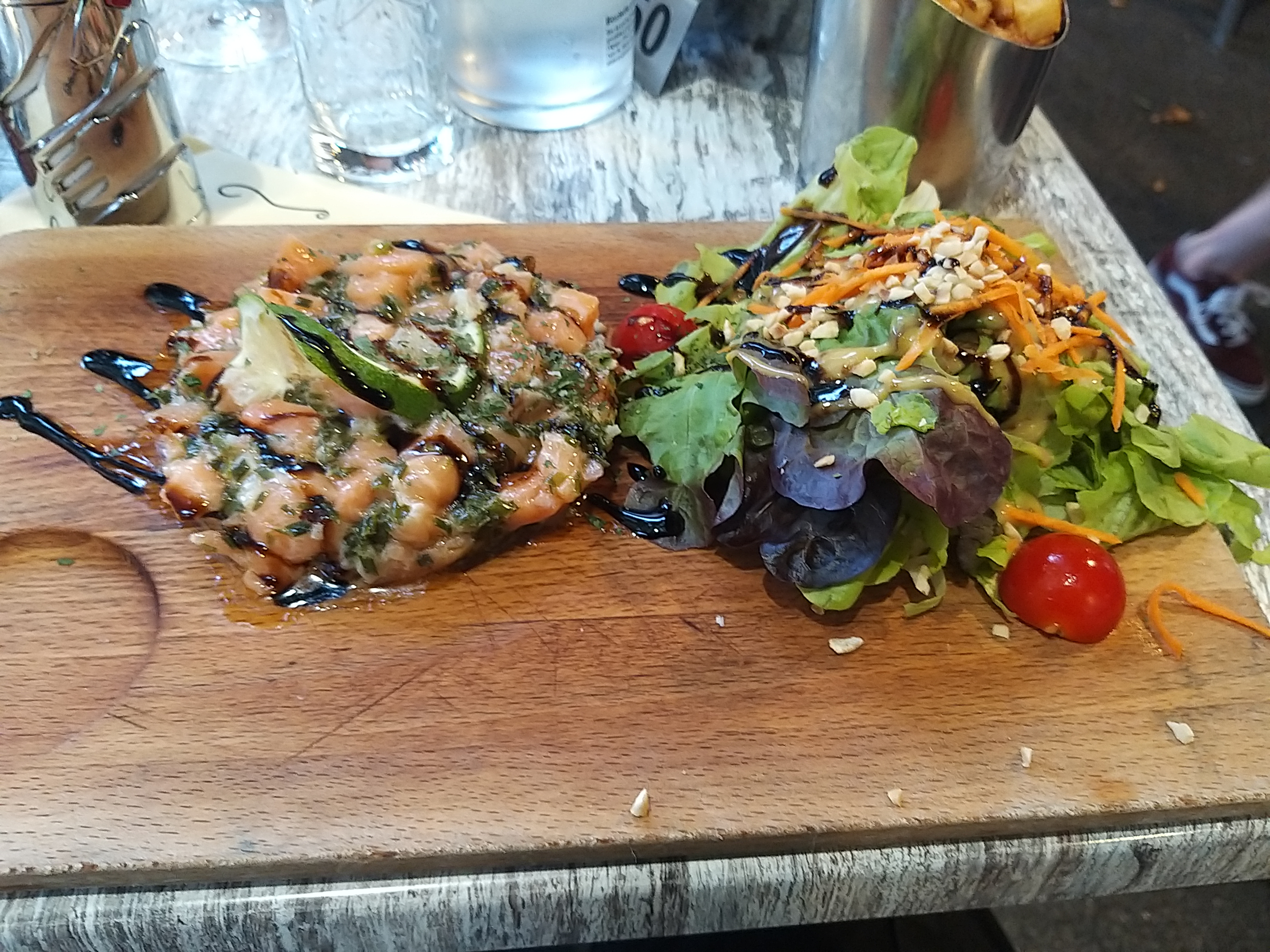 Quelle heureuse halte gourmande À Digne ! Une assiette de carpacio saumon/thon et crevettes aux épices Thaï : savoureuse...Une équipe réactive et sympathique. Un merci particulier au cuisinier venu nous saluer et savoir si tout c'etait bien passé. Quand les petirs clients sont traités comme les grands c'est bon signe ;-))