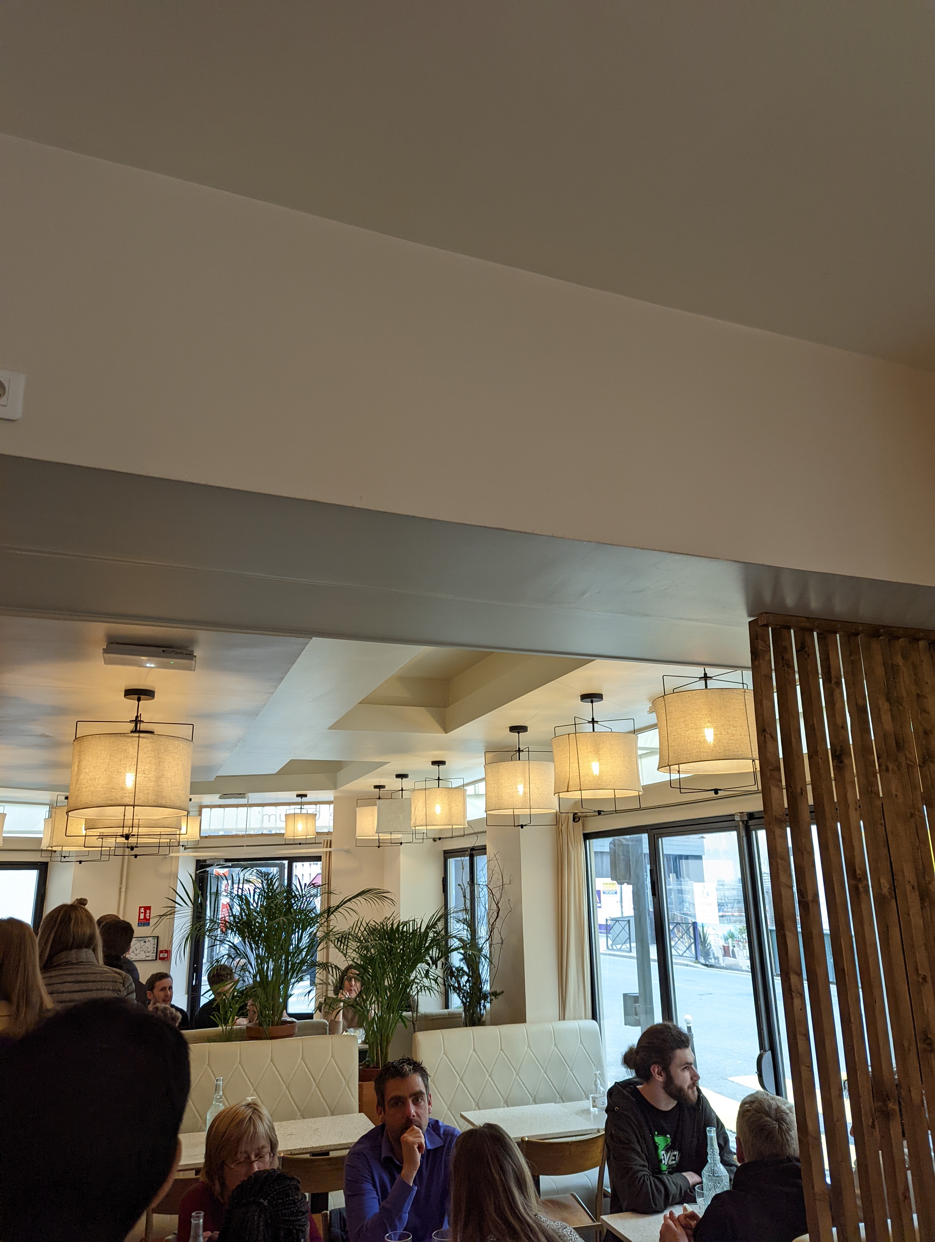Bonne Pause déjeuner avec un plat bien savoureux J’ai choisi les boulettes kefta au bœuf dans le pain. Vraiment bon avec les bonnes herbes aromatiques (taboulé d’herbes) , Aubergine etc . C’est bon, pas sec, généreux et avec différentes saveurs Le service était nickel. Bémol : on était en terrasse (bien) mais juste à côté des voitures et du stop/feu. Faites un meilleur que nous, il y a d’autres places