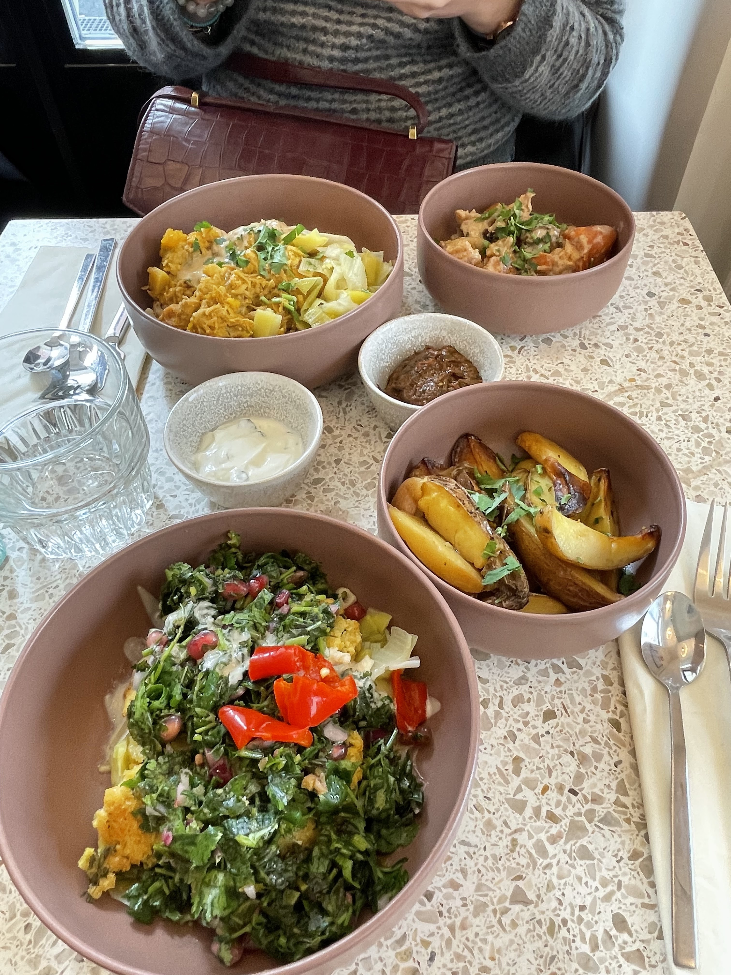 Endroit simple et bonne cuisine. J'ai goute au plat veggie j'ai aimé ce qui ma gêne c'est de retirer les pépins des raisins. La citronnade à l'eau de rose pas top on sent surtout l'eau de rose. Les poires rôties au miel on ne sent pas d'y tout le miel les poires sont croquantes et sautées plutôt que rôties à l'on avis. Bonne découverte.