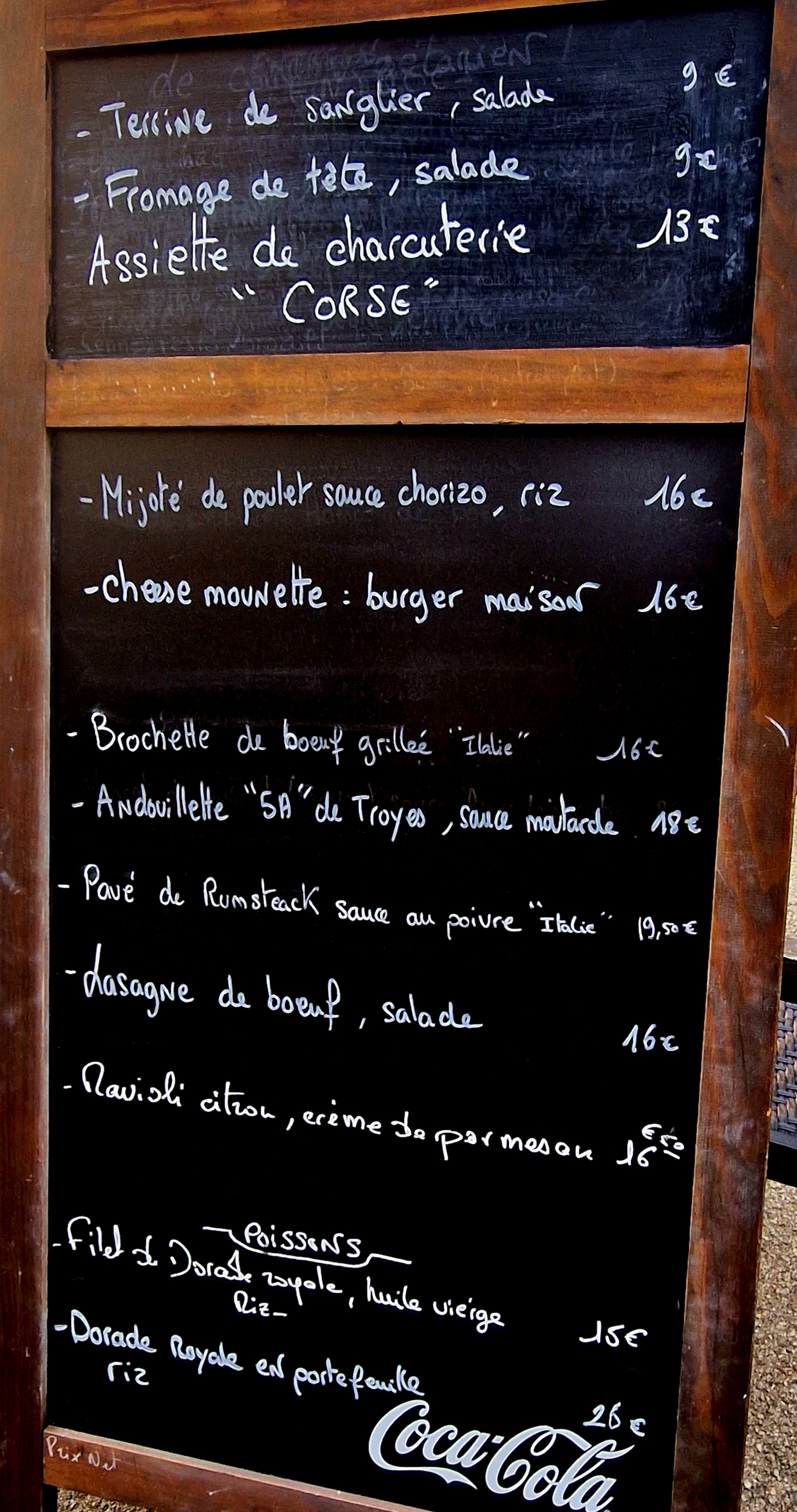Produits frais, cuisine simple et goûteuse. Aubergines à la Bonifacienne, lasagnes de légumes, raviolis citron, aïoli, poissons..crème brûlée au Cointreau... spécialités Corse: veau, planche de charcuteries, fromages. Georges et ses serveurs et serveuses ;)) toujours aux petits soins ! Sans oublier Mounette ! Merci et à très bientôt..car nous y retournons chaque année ! Christine et Bruno B.