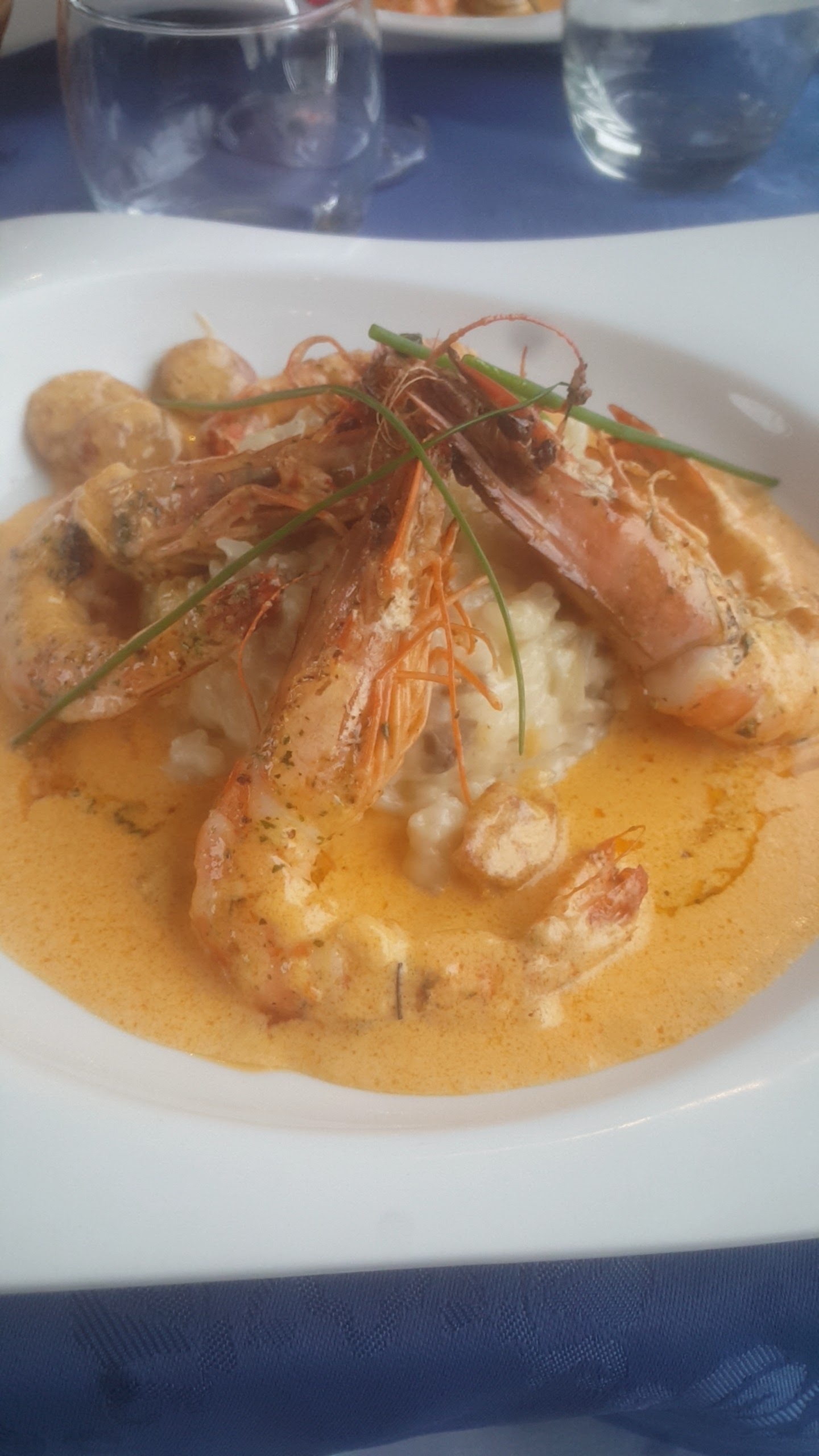 En entrée Carpacchio de gambas sur lit d avocat :magnifique présentation magnifique et un goût original et parfait.Le plat un dos de cabillaud sur un lit d asperges toujours une très belle présentation et un goût très bon tout fondait en bouche BRAVO au chef