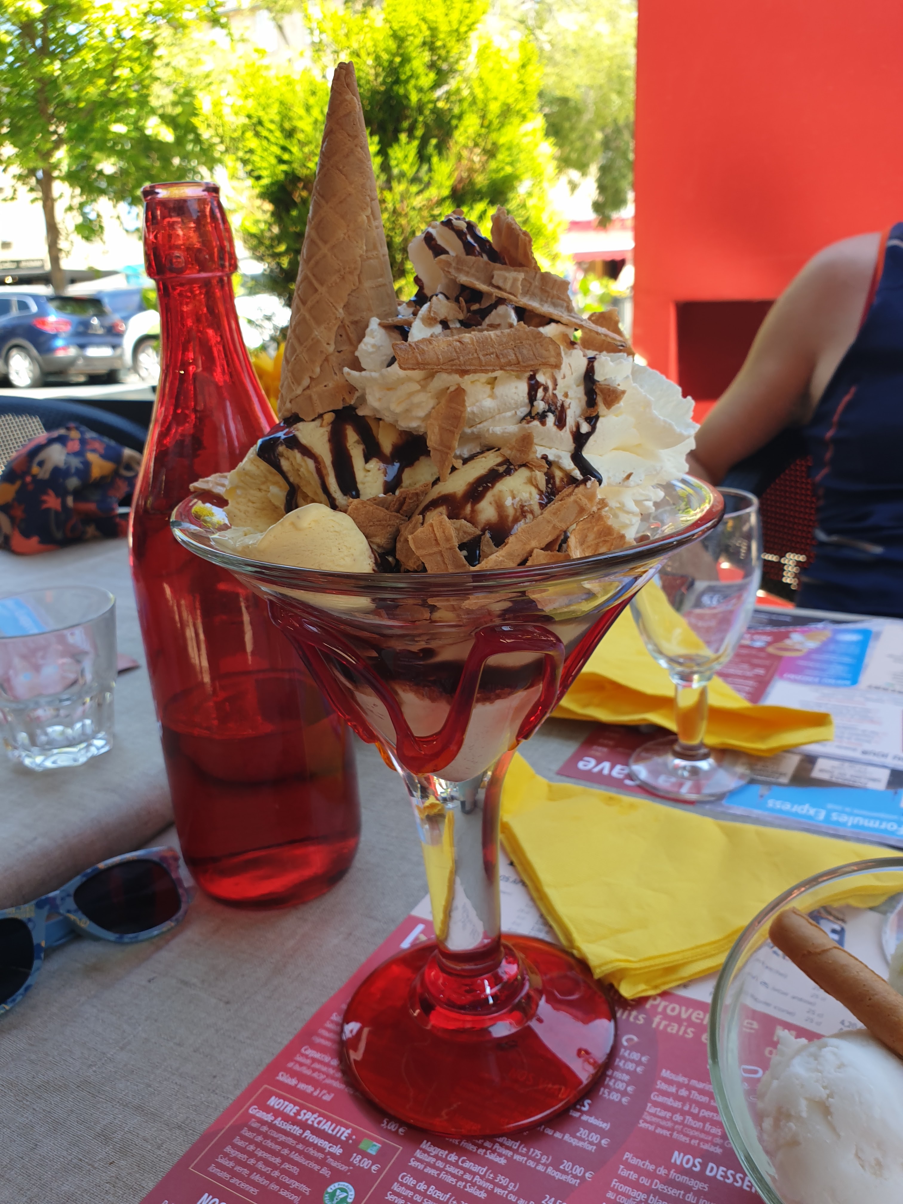 La serveuse s’énerve rapidement lorsqu’on lui demande des conseils sur les coupes glacées. Assez incroyable, elle persiste en nous disant qu’il faut qu’elle envoie ! Sous entendu je n’ai pas de temps à perdre, nous sommes donc partis pour aller ailleurs.