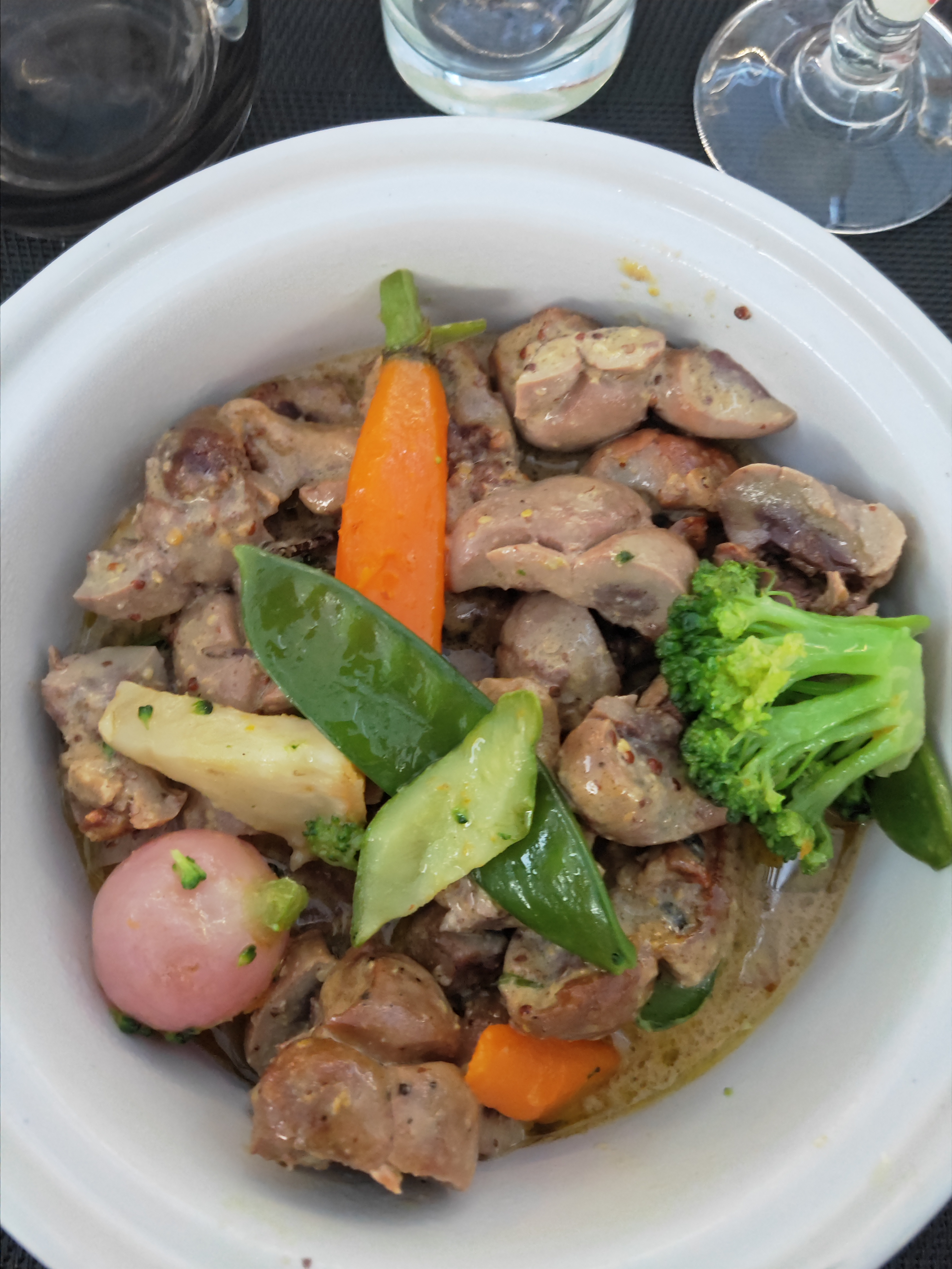 Eric est toujours aussi gueulard, mais sa cuisine vaut le déplacement , on a donné récemment un macaron Michelin à un resto de Thaïlande qui serre ces clients sur une toile cirée, alors pourquoi pas redonner à ce restaurateur colérique et passionné son macaron qu'il avait du temps des FONTAINES D'ARAGON. Une simple pièce de boeuf est sublimé par des légumes de saison en cocotte et d'une tendresse très savoureuse. Allez voir ce restaurateur, pas pour son caractère, mais pour une cuisine sublime.