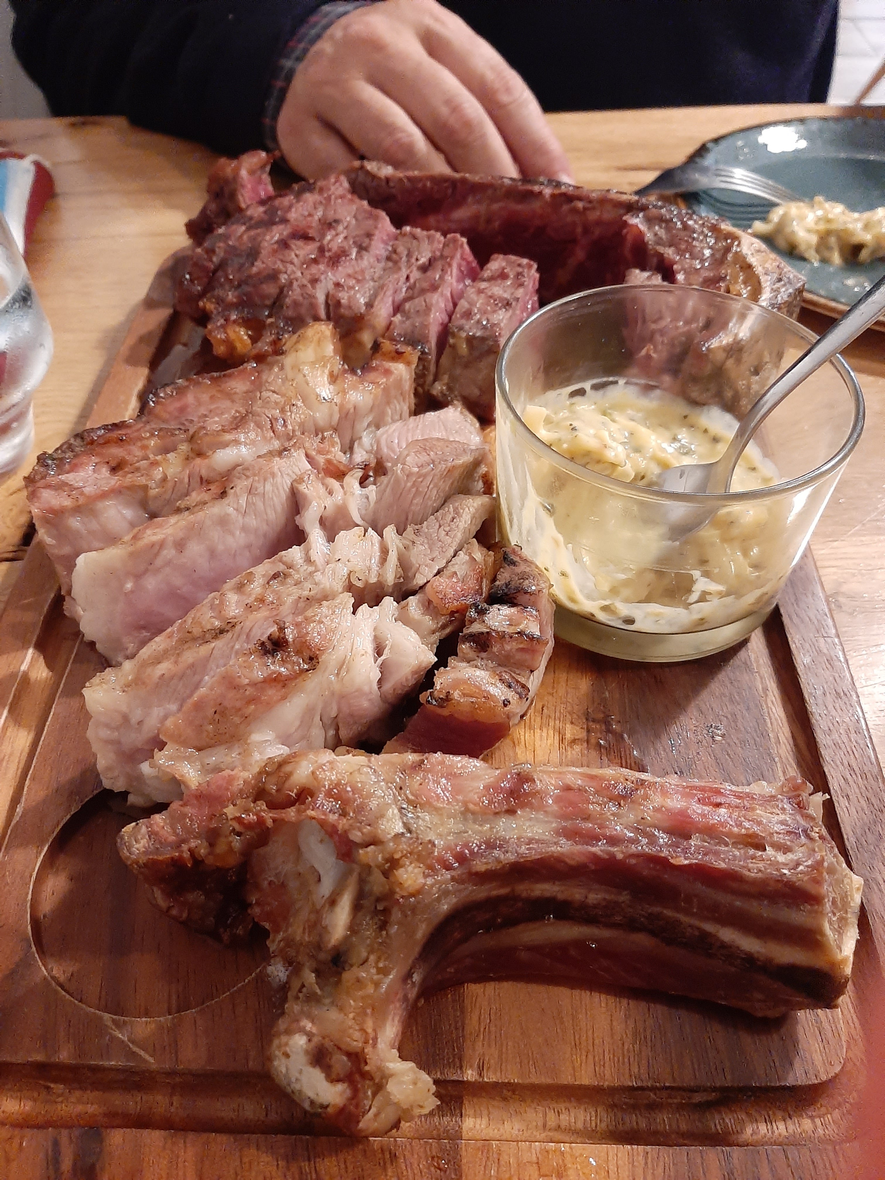 Nous n'avions pas très faim et avons pris une planche de charcuterie. Finalement les odeurs et la vue des plats ont aiguisé notre appétit. Notre choix s'est porté sur une entrecôte qui était sublime, les frites étaient exceptionnelles. L'ambiance était chouette et le service très sympa. Allez-y les yeux fermés. Un seul regret, nous aurions dû prendre tout de suite 2 grosses entrecôtes.