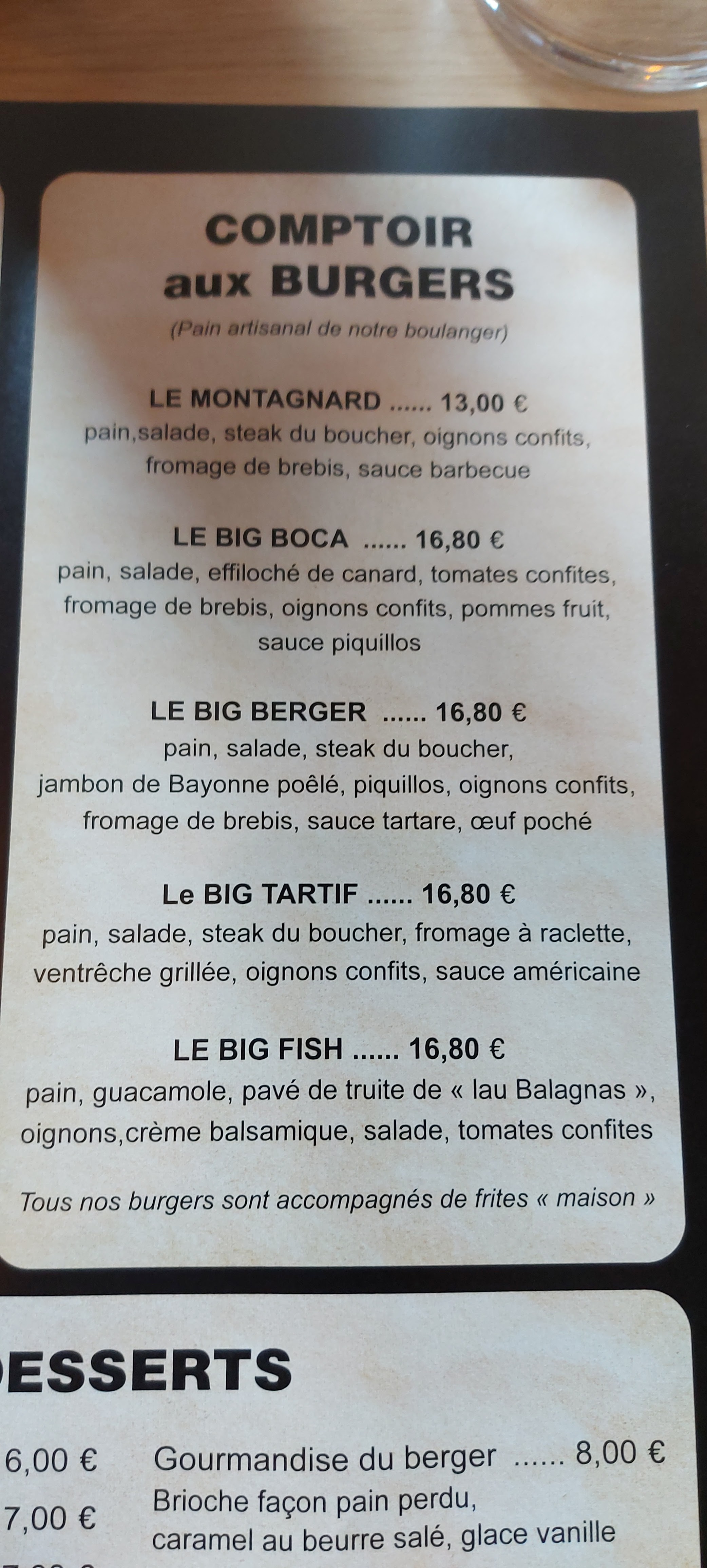 Tout est parfait, l'accueil et un hamburger 🍔 montagnard délicieux. Pain très bon!. Merci a toute l'équipe. 👌