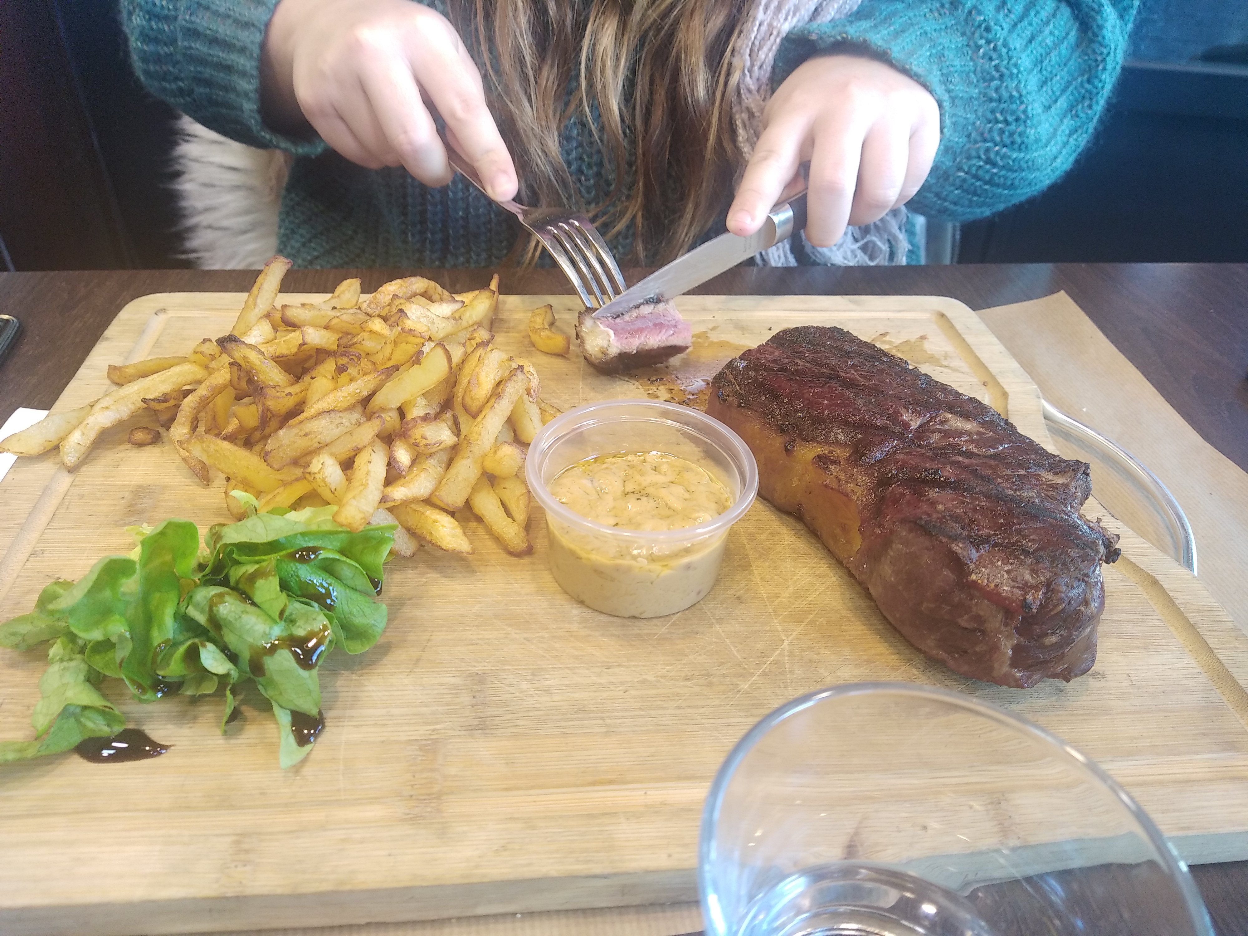 Viande à la cuisson parfaite, des frites maison savoureuse, un bon verre de vin et pour finir une délicieuse crème Catalane maison... C'était parfait