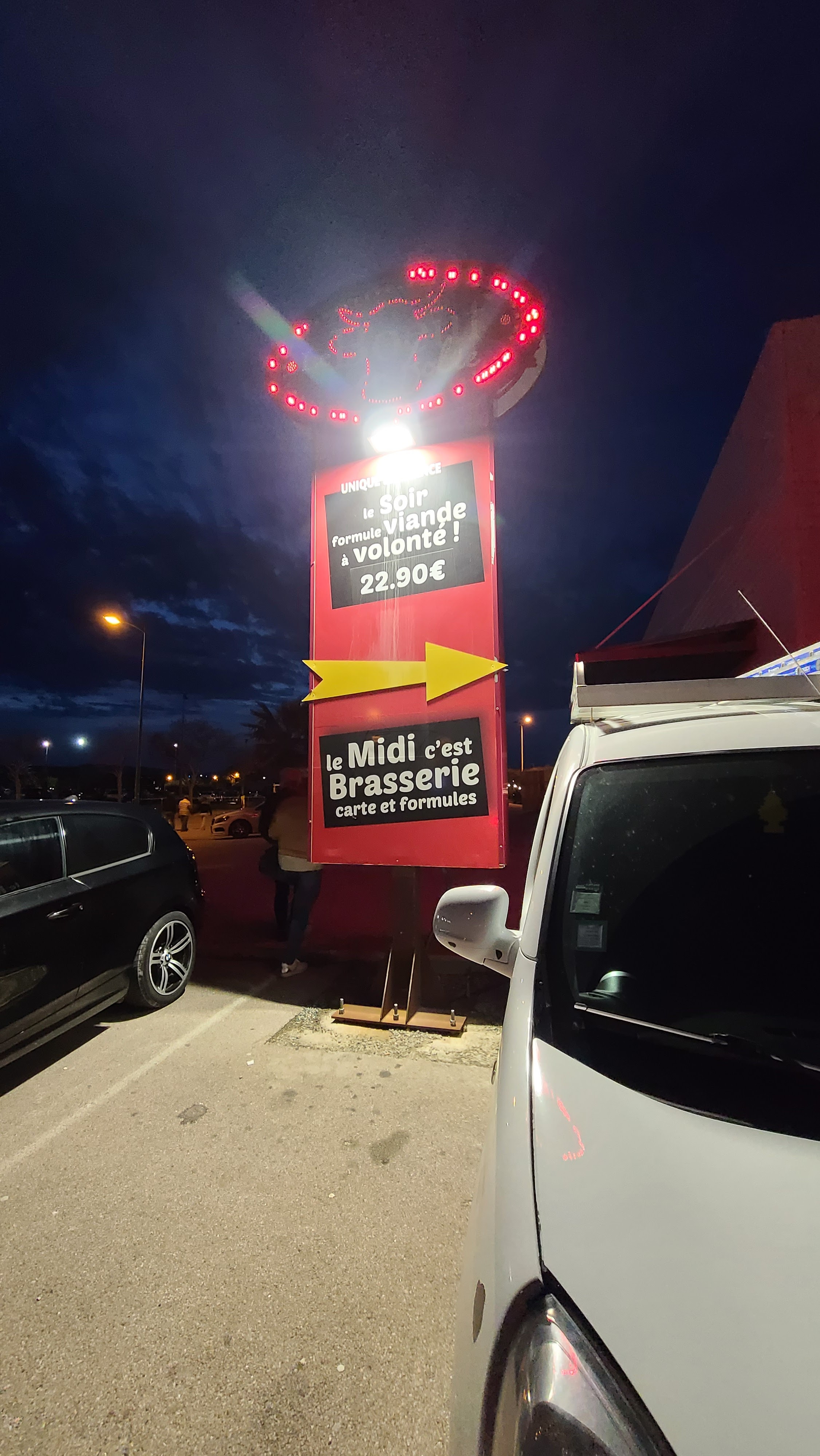 Restaurant extra. Nous avons trouvé par hasard ce restaurant, lors de notre arrêt au superchargeur pour notre véhicule électrique. Tous les restaurants autour n'ont pas voulu nous servir il était 21h30. Un peu tard. Ou alors il fallait faire vite. Par dépit nous avons été au bœuf en folie. On nous a reçu avec grand plaisir. Mais quel bonheur, nous avons super bien mangé, la viande est délicieuse, tendre et super bien servie. Avec des assiettes copieuses. La décoration est extra. On voit les cuistots faire la Cuisson delà viande devant nous. Il y a les frigos ou l'on voit la viande. De beaux morceaux sous vitrine. Le prix n'était pas faramineux vu la quantité dans l'assiette. Ça valait vraiment la peine. Le service est ultra rapide. Le personnel vraiment au petit soin et compétent. Il y a une aire de jeu pour enfants grandiose. Seul regret il n'y a qu'un restaurant sur rivelsaltes. A quand un restaurant dans le 13. Je recommande vraiment cet établissement. Au prochain passage nous y retournerons avec plaisir.