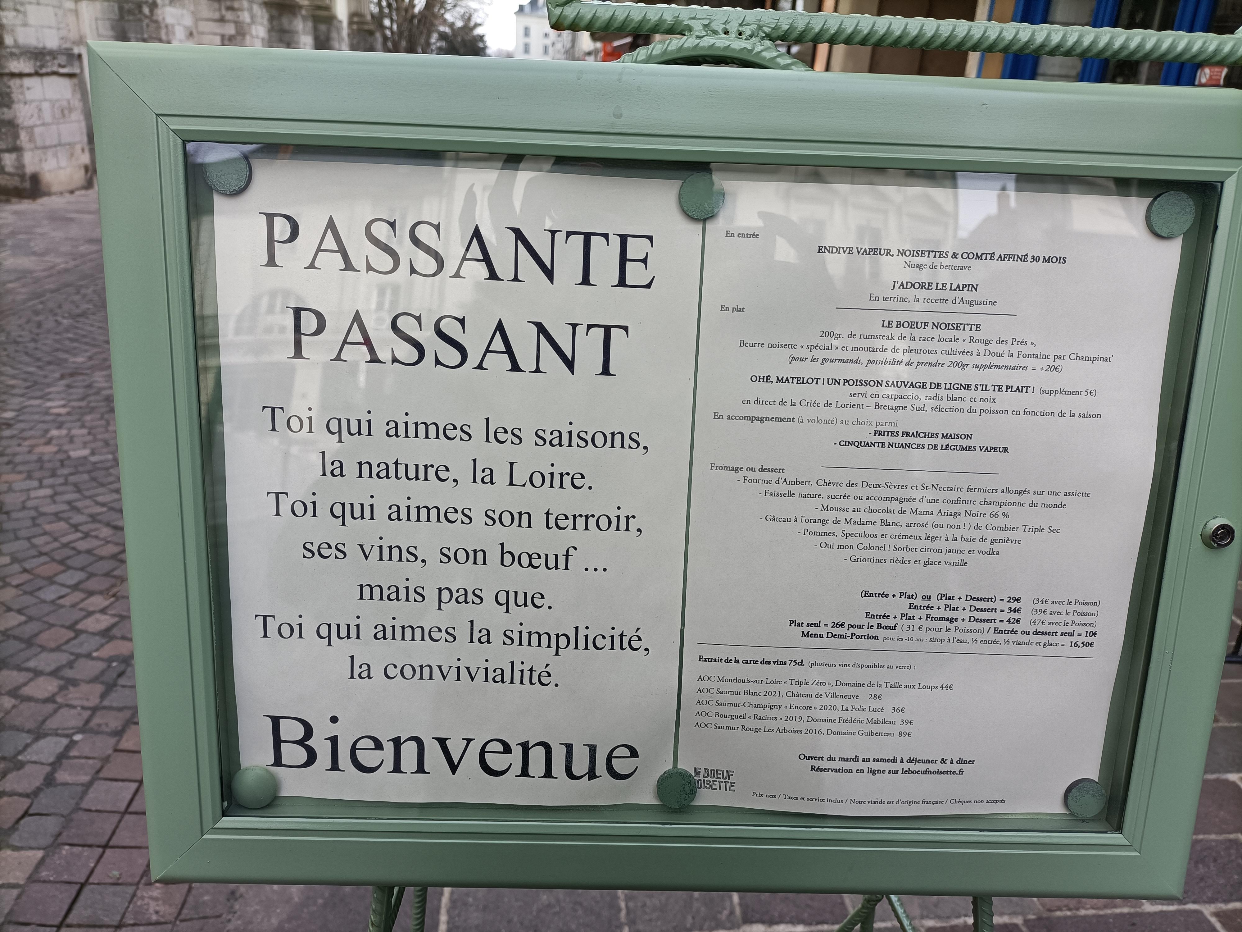 Sur Saumur en plein centre ville resto à la devanture verte. Service agréable et prévenant. Carte très minimaliste pour les entrées et les plats. plus de choix pour les desserts. Le boeuf-noisette est délicieux, les frites maison sont bonnes mais pour mon goût personnel mériterez d'être légèrement plus croustillantes. Grands choix sur la carte des vins, celui que l'on a prit était très bon....mais attention au prix 46€. Pour deux 120€ (apéros, entrées, plats, desserts, une bouteille de vin) attention on ne regrette pas le moins du monde notre soirée ! La qualité à un prix plus élevé que l'industriel, et ici cela est normal !