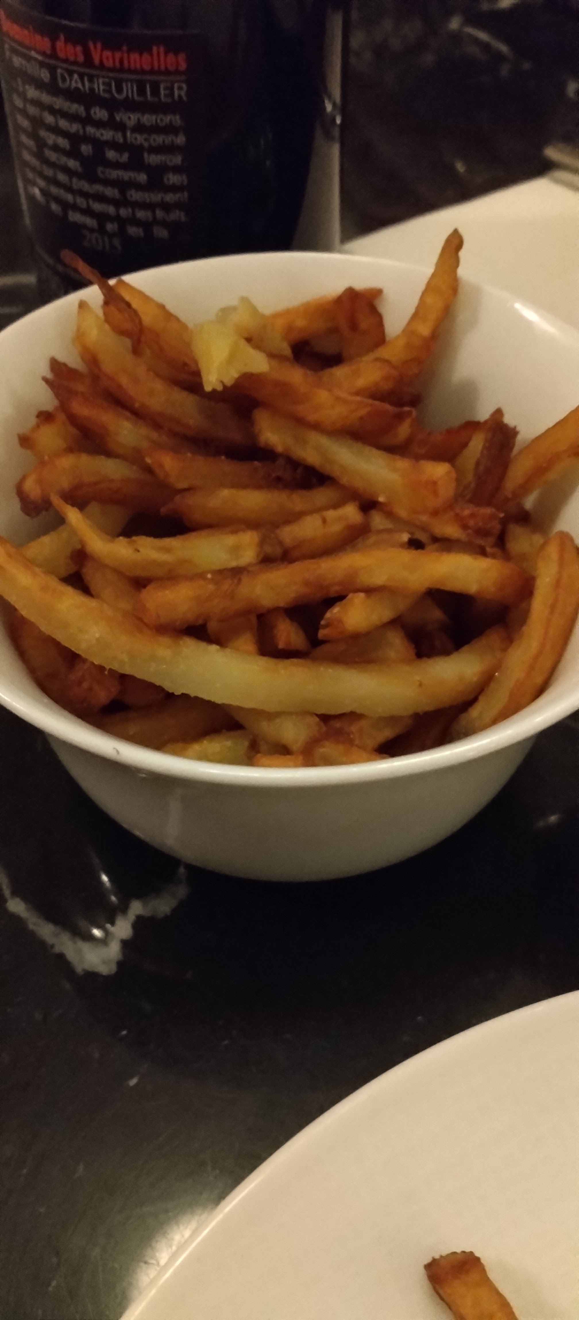 Ambiance calme. 2 entrées, deux plats, facile à gérer vous me direz et pourtant... Il y a un peu plus de choix dans les déserts. Je dois dire que tout ce que j'ai mangé été bon, rien à redire. À part le beurre noisette oublié pour la viande, le vin rosé commandé transformé en rouge et les frites.... ils ne savent pas faire les frites à Saumur. Alors voici comment les faire, Le premier bain de cuisson se fait dans une huile à 160°C pendant 6 à 7 minutes. Egouttez. Puis augmentez la température de l'huile à 180°C minimum. Avec de la graisse de bœuf ou de cheval, magnifique. Il est même possible de les précuire pour les réchauffer plus tard.