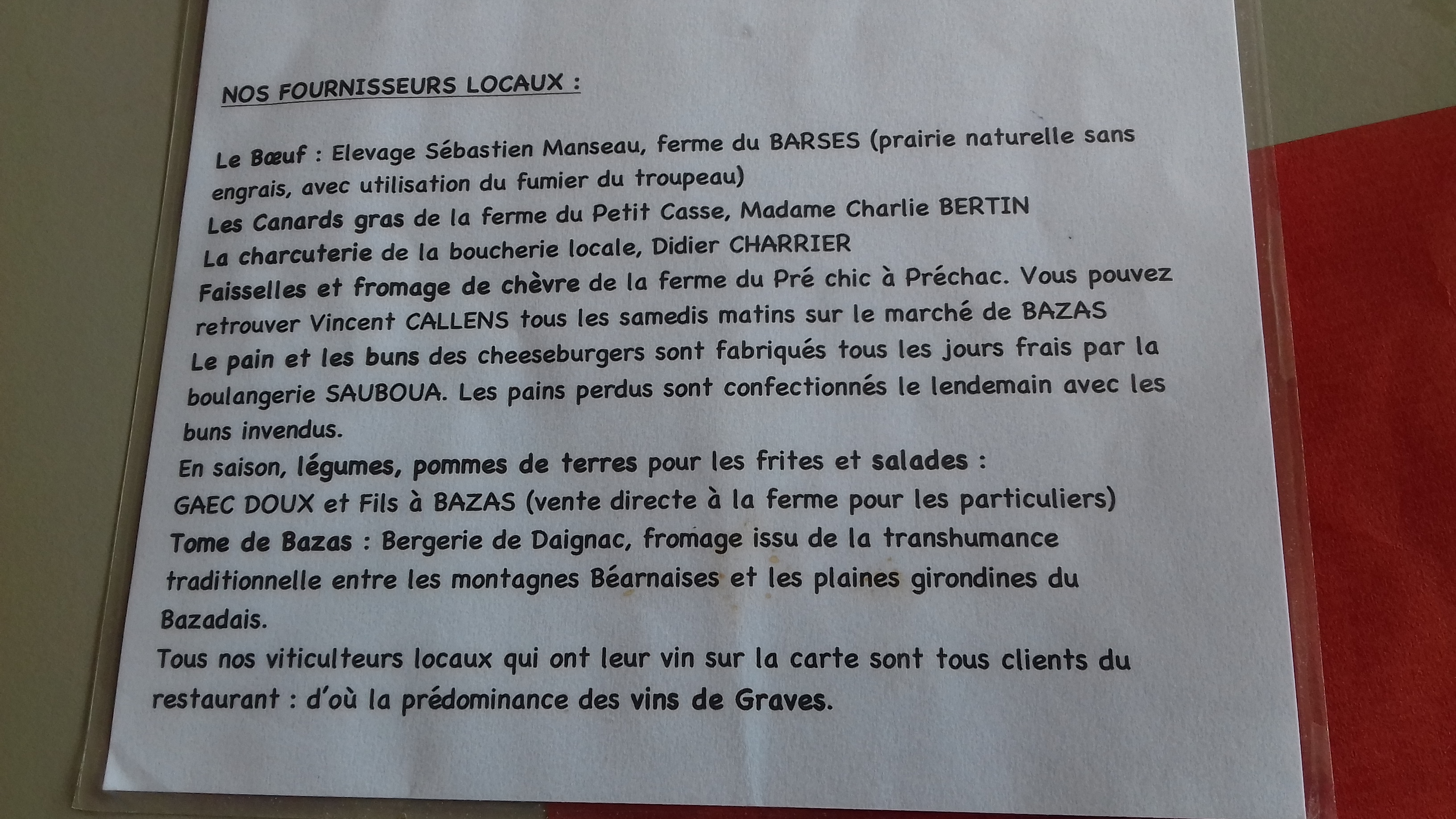 Excellent produits du terroir même le menu enfants est exceptionnel (magret,pavé de bazadaise...)frite fraîche à la graisse de bœuf les personnes qui y travaillent sont avenantes et aux petits soins. Je recommande vivement 💕