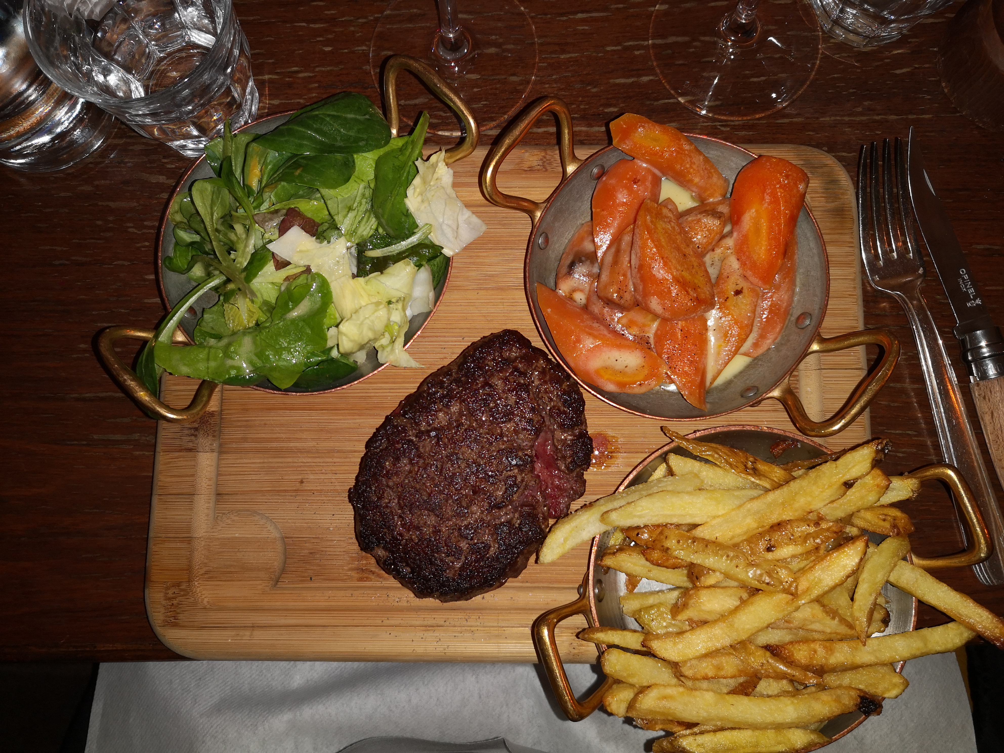 Troisième fois que j'y vais, j'ai commandé leur viande de boeuf au poids à chaque fois (1,3kg, 1,7kg et 1kg...à partager à...deux:) . Viande à tomber, cuisson bleue chaud, parfaite (et je suis très exigeant), oeufs mayo et foie gras excellents. Leur mousse au chocolat XXXL est à tester au moins une fois dans sa vie, peut-être un poil trop généreuse en copeaux de chocolat mais au final très légère contrairement aux apparences. Le Paris-Brest est très sympa aussi, et leur carte des vins c'est du sérieux. Petit bémol : à chaque fois placés à la seule table en plein milieu de la salle collée à un poteau, gageons que j'aurai plus de chance la prochaine fois..Le service étant irréprochable- rigoureux, passionnés et souriants- je laisse un 5/5 malgré tout. Une adresse à conserver précieusement, je recommande vivement.