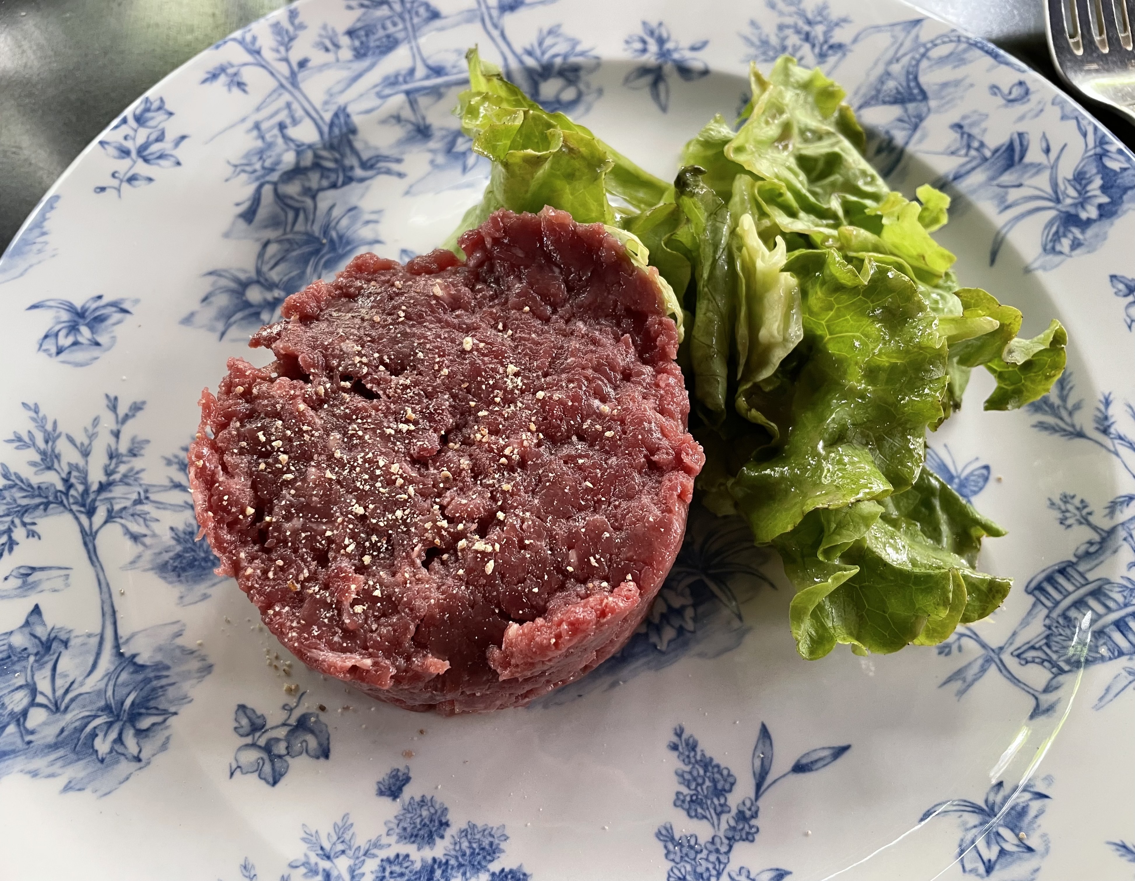 Un tartare de boeuf succulent, juste de la viande et un peu d'huile ( sans les condiments habituels), sel et poivre. Le goût de la viande ressort bien mieux. Un vrai régal. Pour le prix, un peu plus de salade n'aurait pas été de trop. Excellent Côte du Rhône au verre, bien qu'un peu cher. Une très bonne adresse.