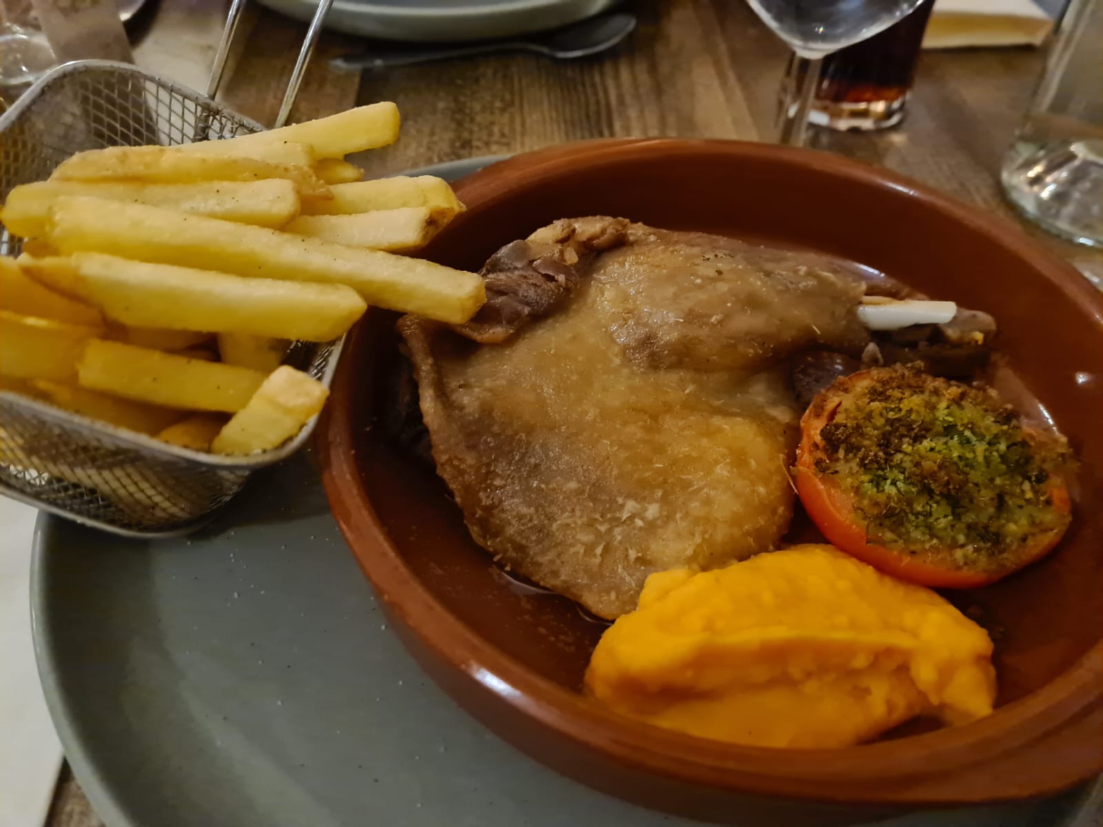 Excellent restaurant qualité prix ,service sympa,les produits comme le filet de merlu frais du marché ,hier j'ai mangé ,entrée garbure copieuse ,après belle salade de gésiers confits ,pièce de bœuf haricots verts et sa panière de frite dessert 1/4 de vin dessert pour le prix de 12.50 euros .