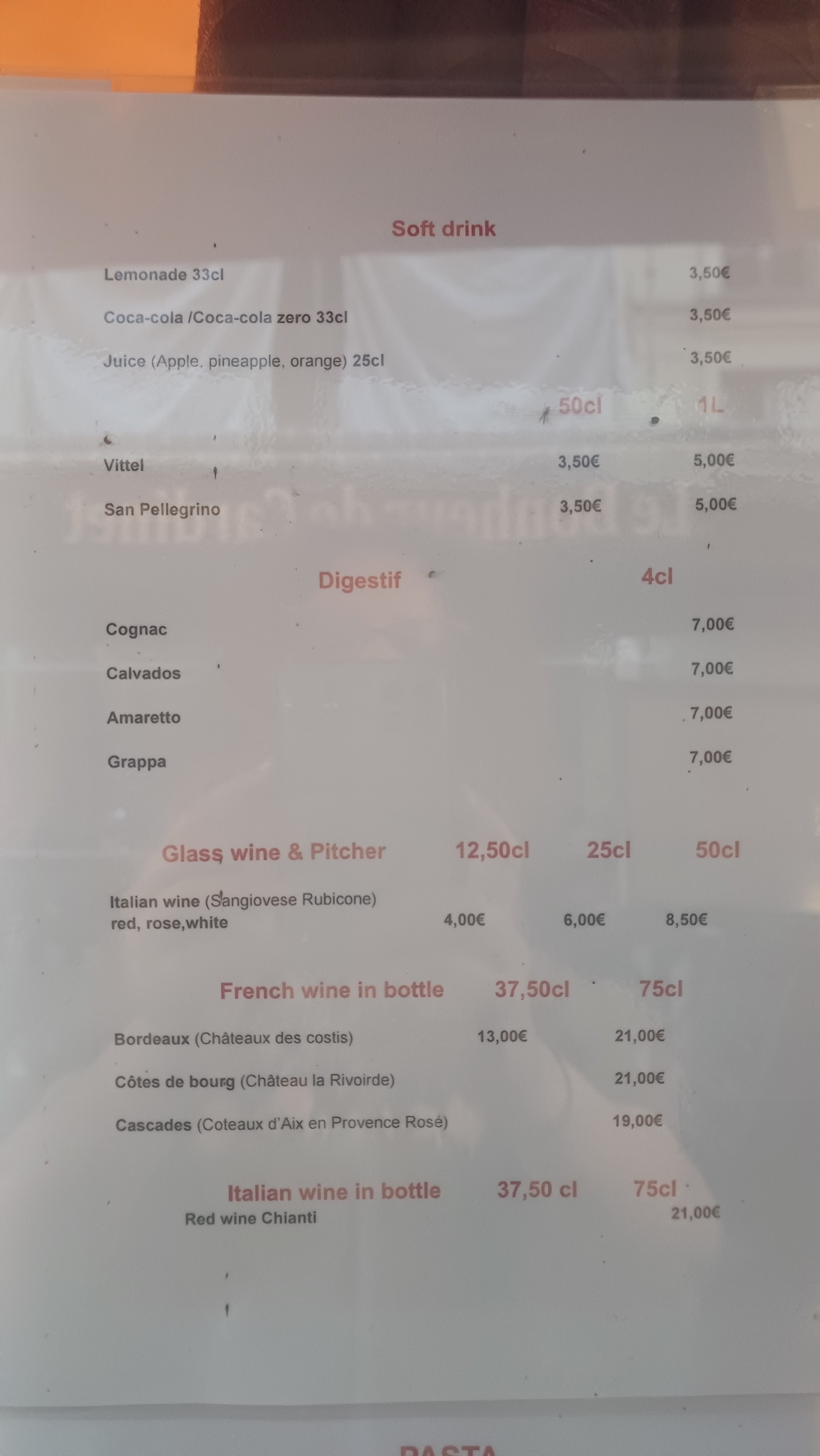 Petit restaurant très sympathique. Les pâtes sont copieuses.les pizzas succulentes. La pâte fine et bonne. Nous avons été reçu et servi par la serveuse très gentille.