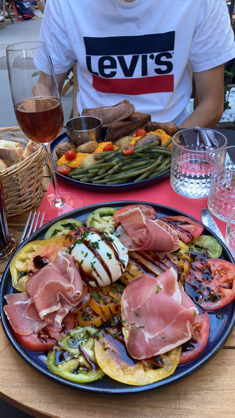 salade tomate burrata en S ou avec du jambon en XL, foie gras, tartare de saumon et de très bons desserts maison