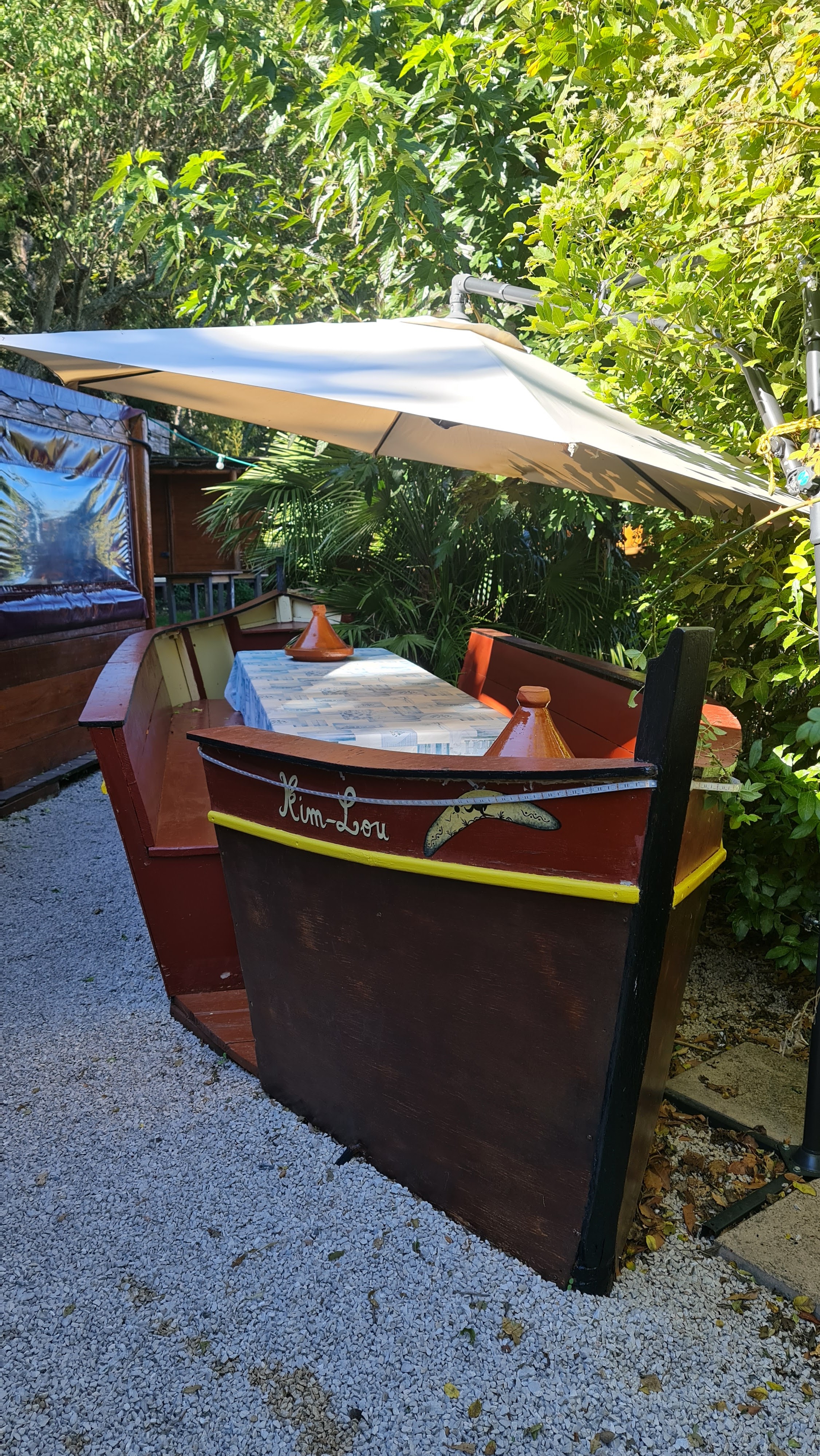 Un lieu a découvrir sans attendre!!! En journée, le cadre arboré offrira un repas à l'ombre des grosses chaleurs, quelques trouées dans le feuillage, raviront les amateurs de bronzette. Le lieux offre de nombreuses ambiances, une barque aménagée vous portera sur les mers gustatives. Le goût, parlons en, la qualité est au rendez-vous, une ardoise , efficace, pour servir une assiette soignée. Délicate et parfumées , la cuisine est de très bonne qualité. Certains soirs ( voir programmation du lieu) ambiancés vous au rythme des concerts proposés. L'équipe est au top, conviviale et chaleureuse, on se sent vite comme a la maison. Petit labyrinthe feuillus, ce lieu offrira aux amateurs de bonne vibration, de faire une halte fraîche et reposante.